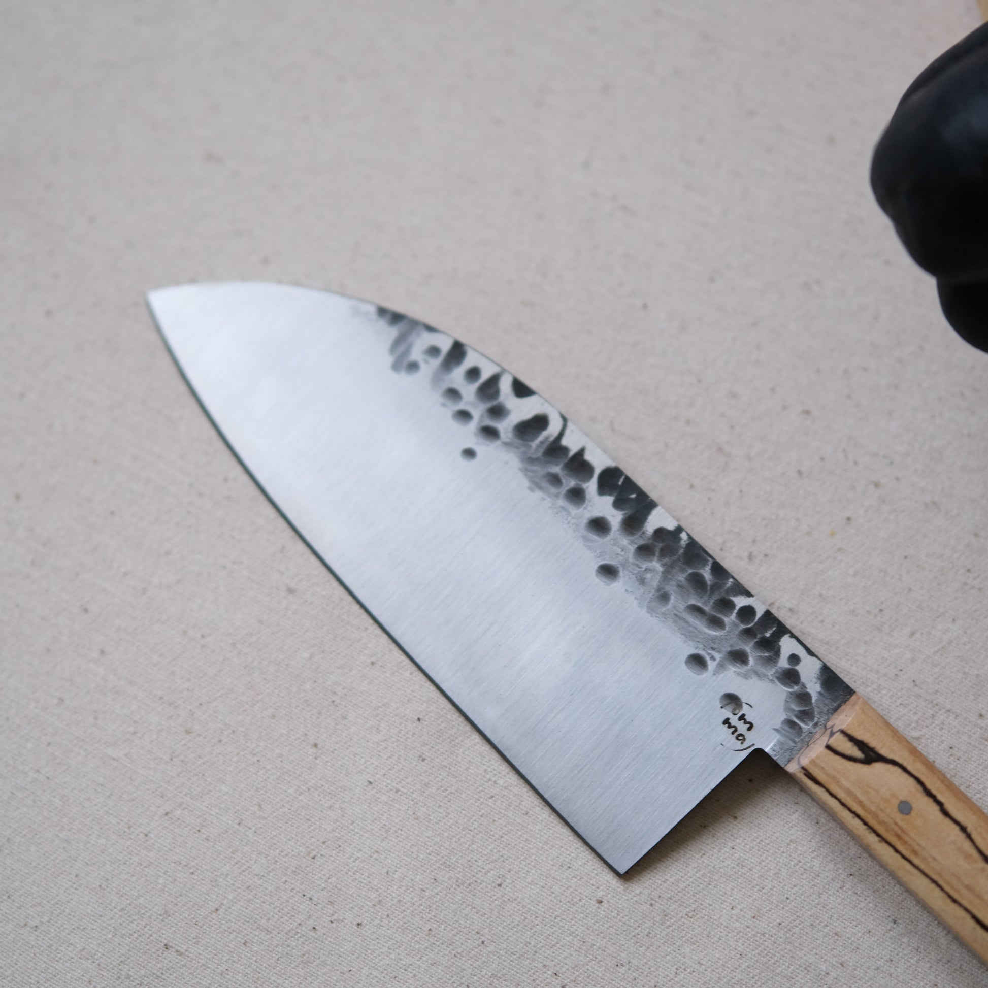 Chaque couteau de cuisine est réalisé entièrement à la main par mes soins dans mon atelier en Touraine (dessin, découpe & mise en forme de la lame, traitements thermiques, découpe et façonnage du manche, polissage, rivetage)