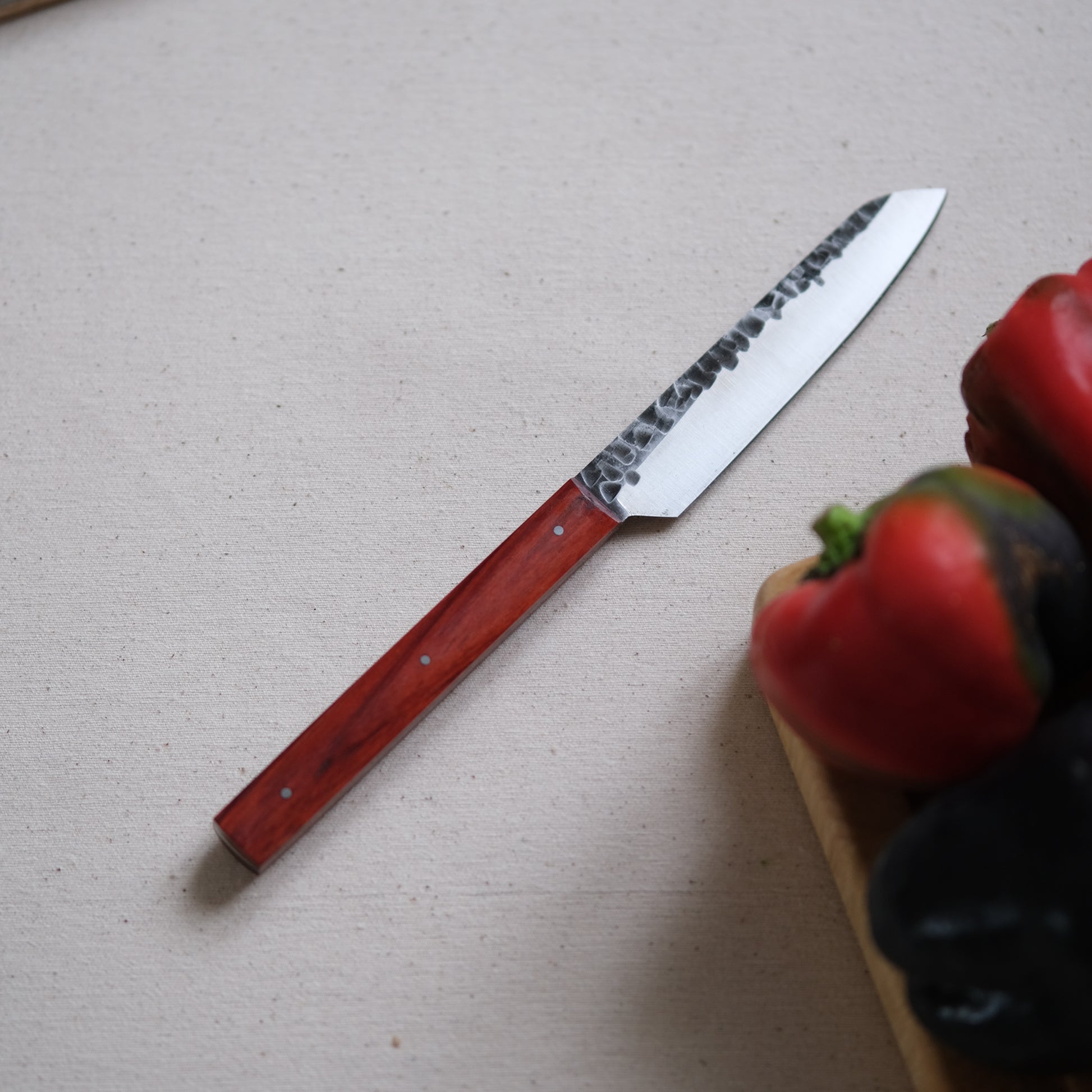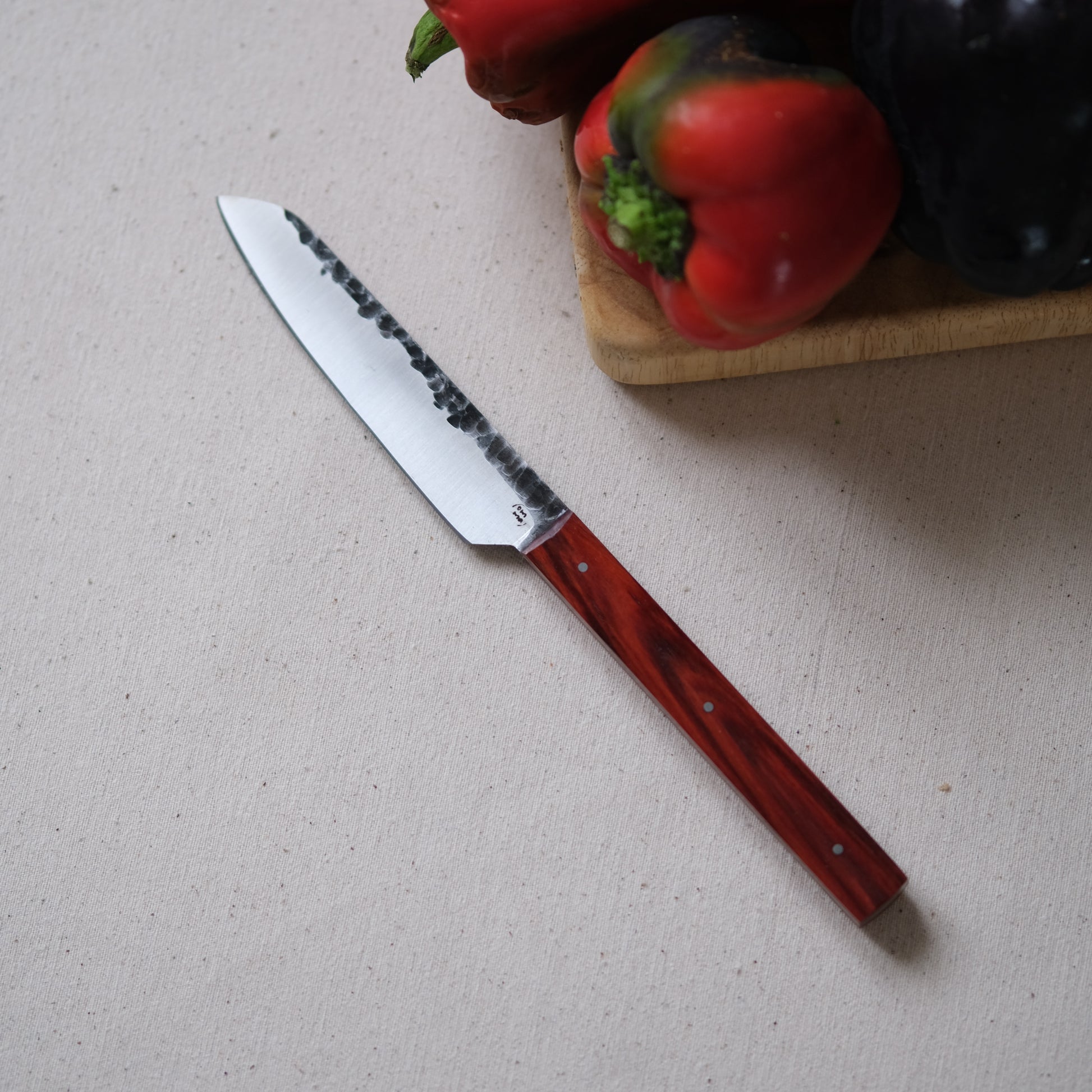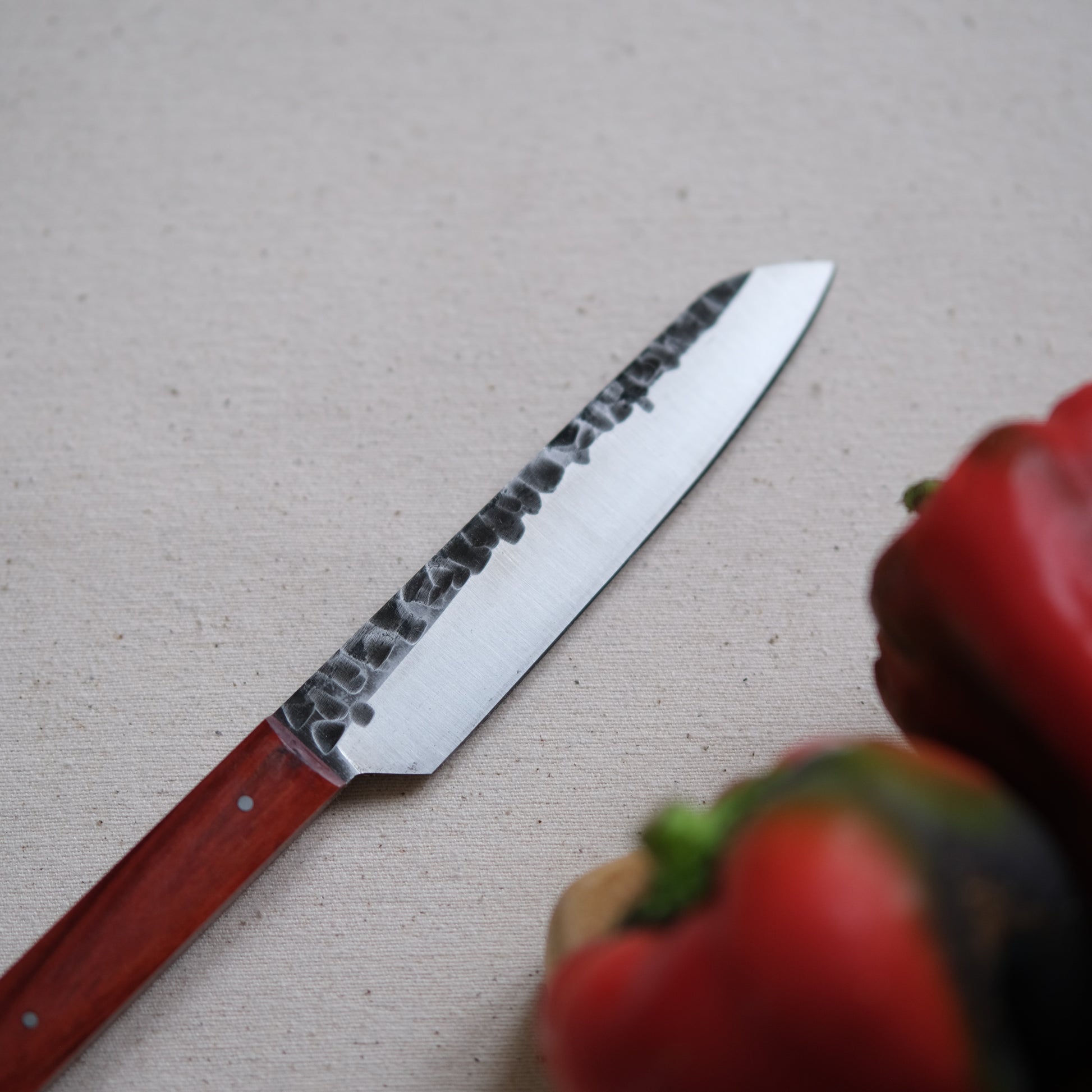 Chaque couteau de cuisine est réalisé entièrement à la main par mes soins dans mon atelier en Touraine (dessin, découpe & mise en forme de la lame, traitements thermiques, découpe et façonnage du manche, polissage, rivetage)