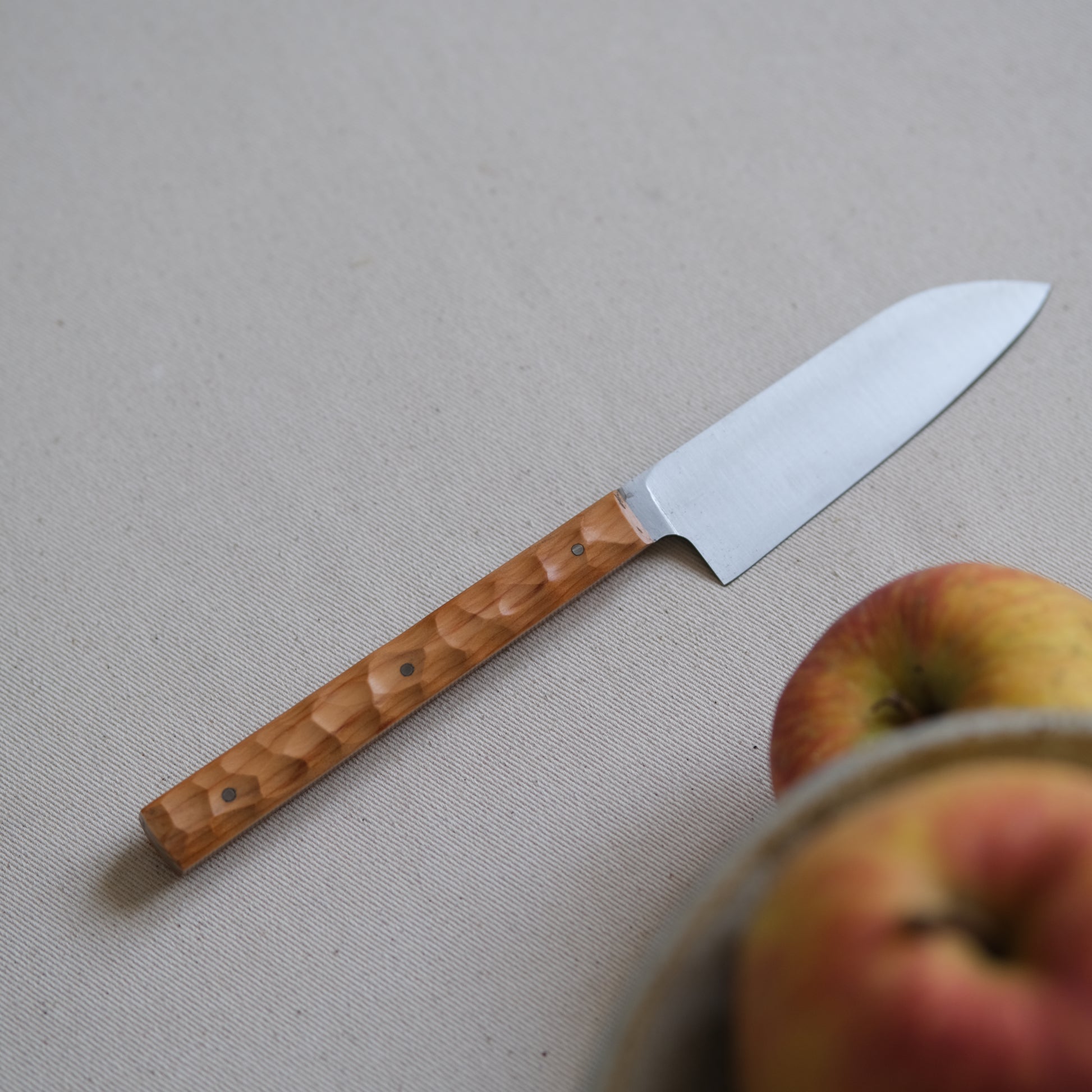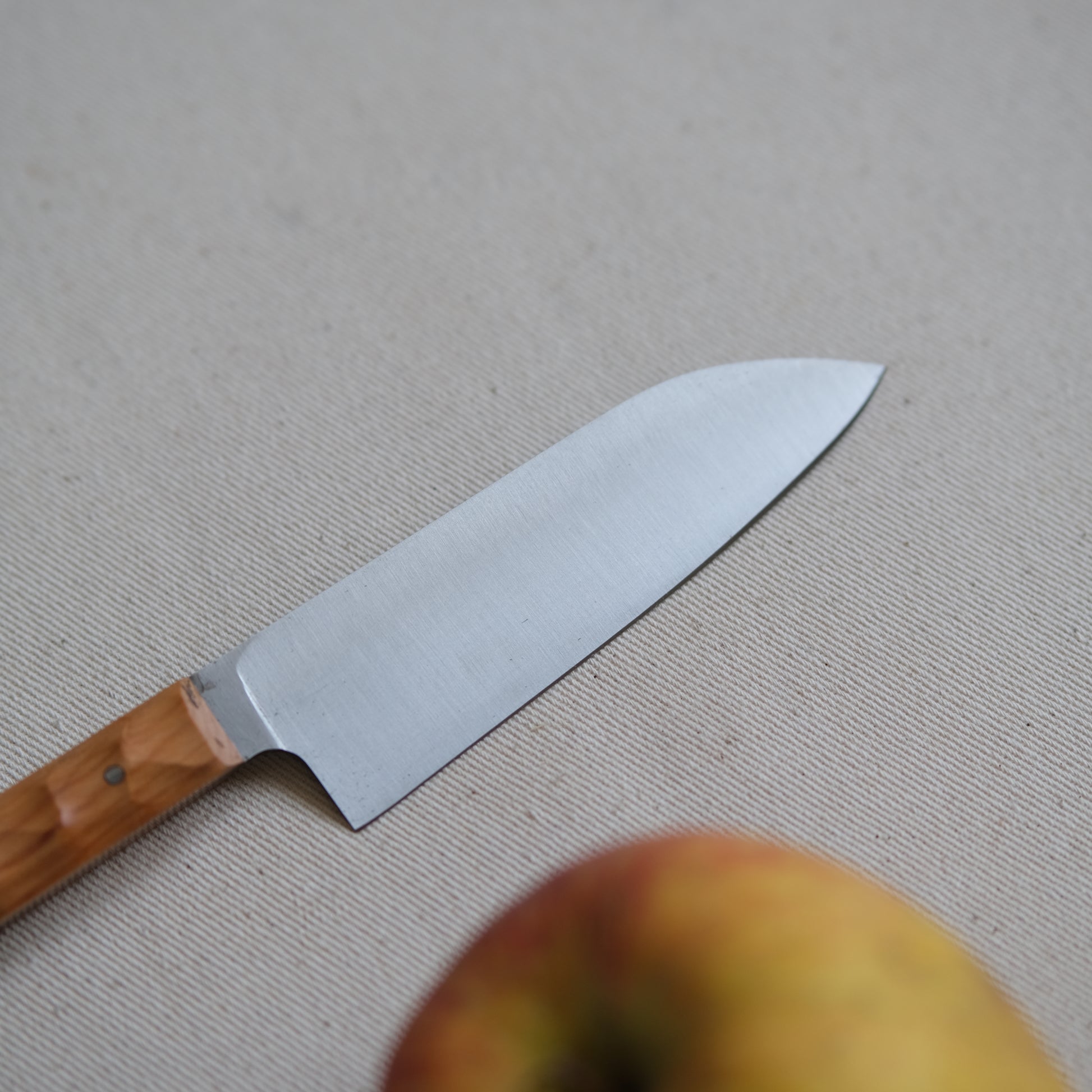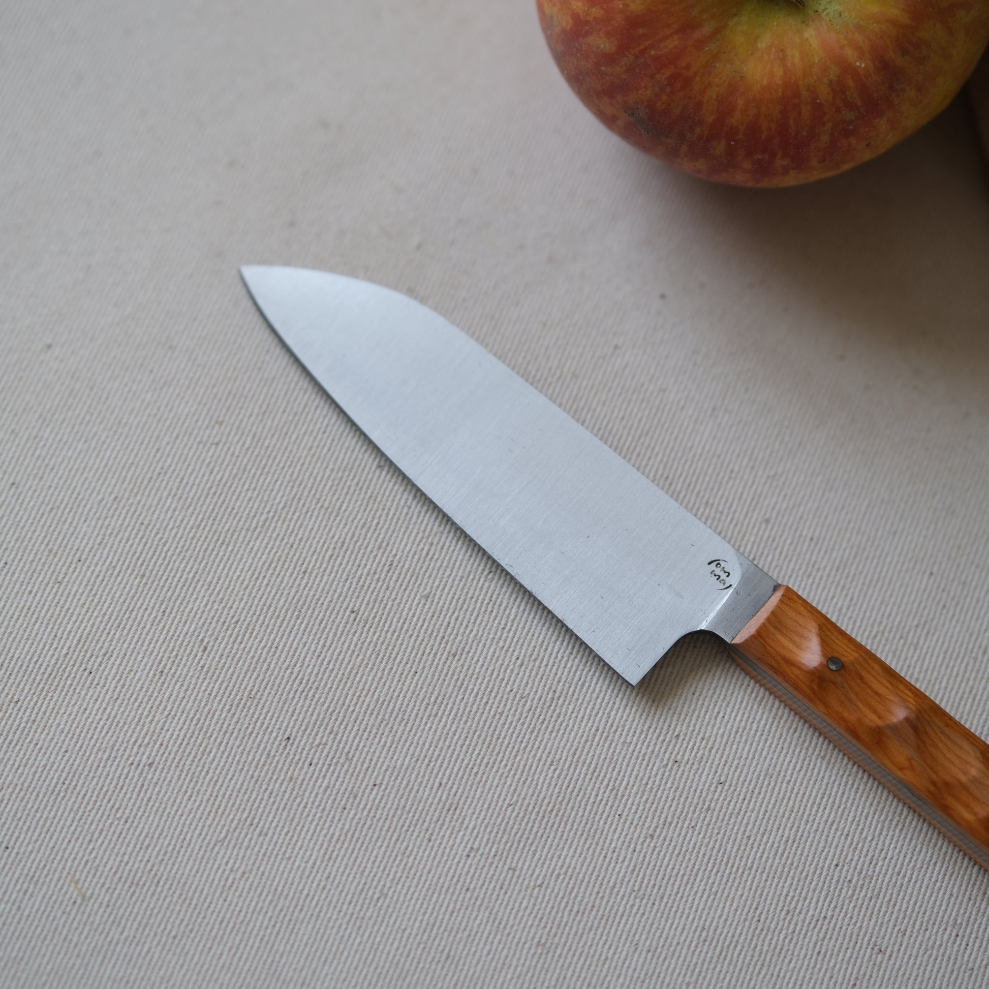 Chaque couteau de cuisine est réalisé entièrement à la main par mes soins dans mon atelier en Touraine (dessin, découpe & mise en forme de la lame, traitements thermiques, découpe et façonnage du manche, polissage, rivetage)