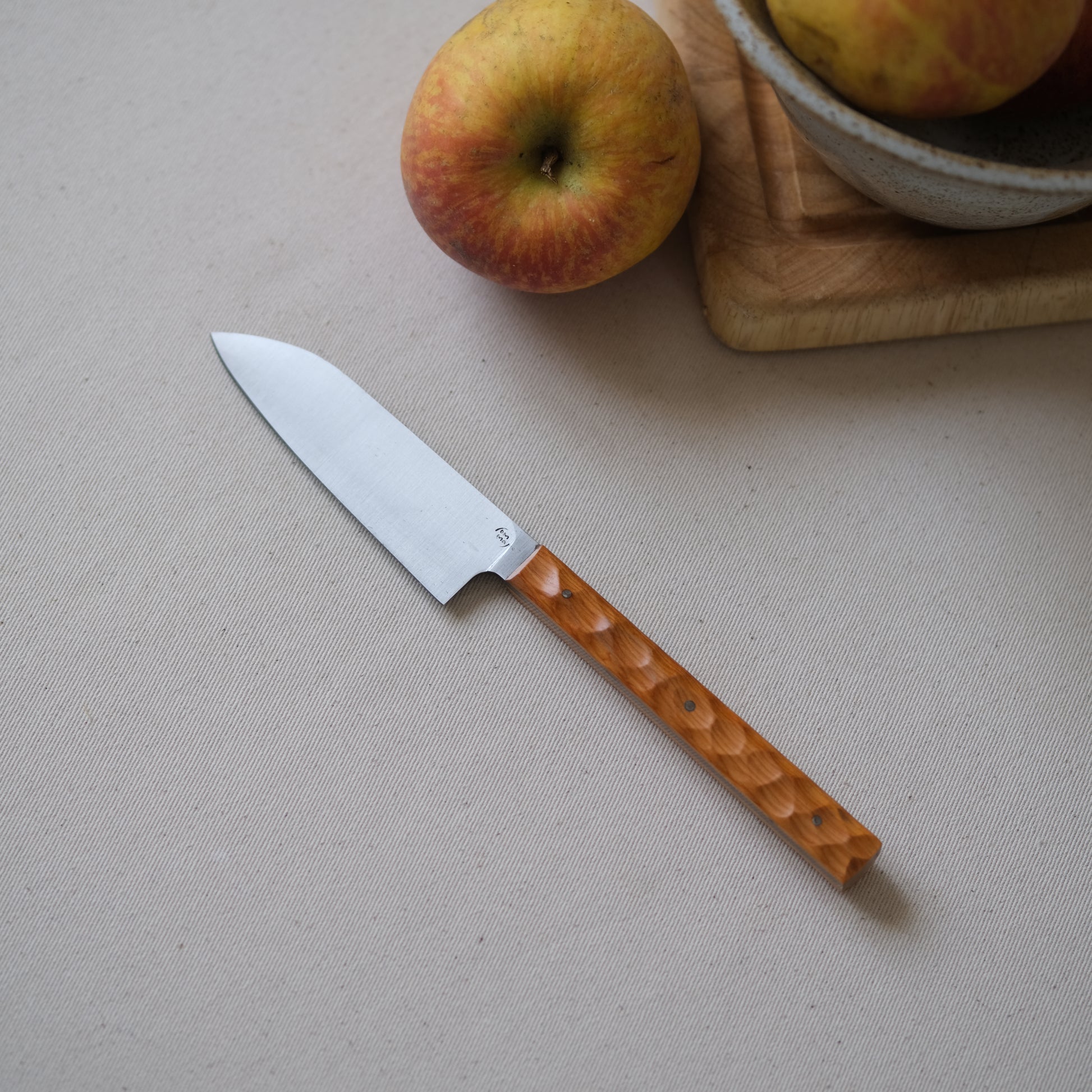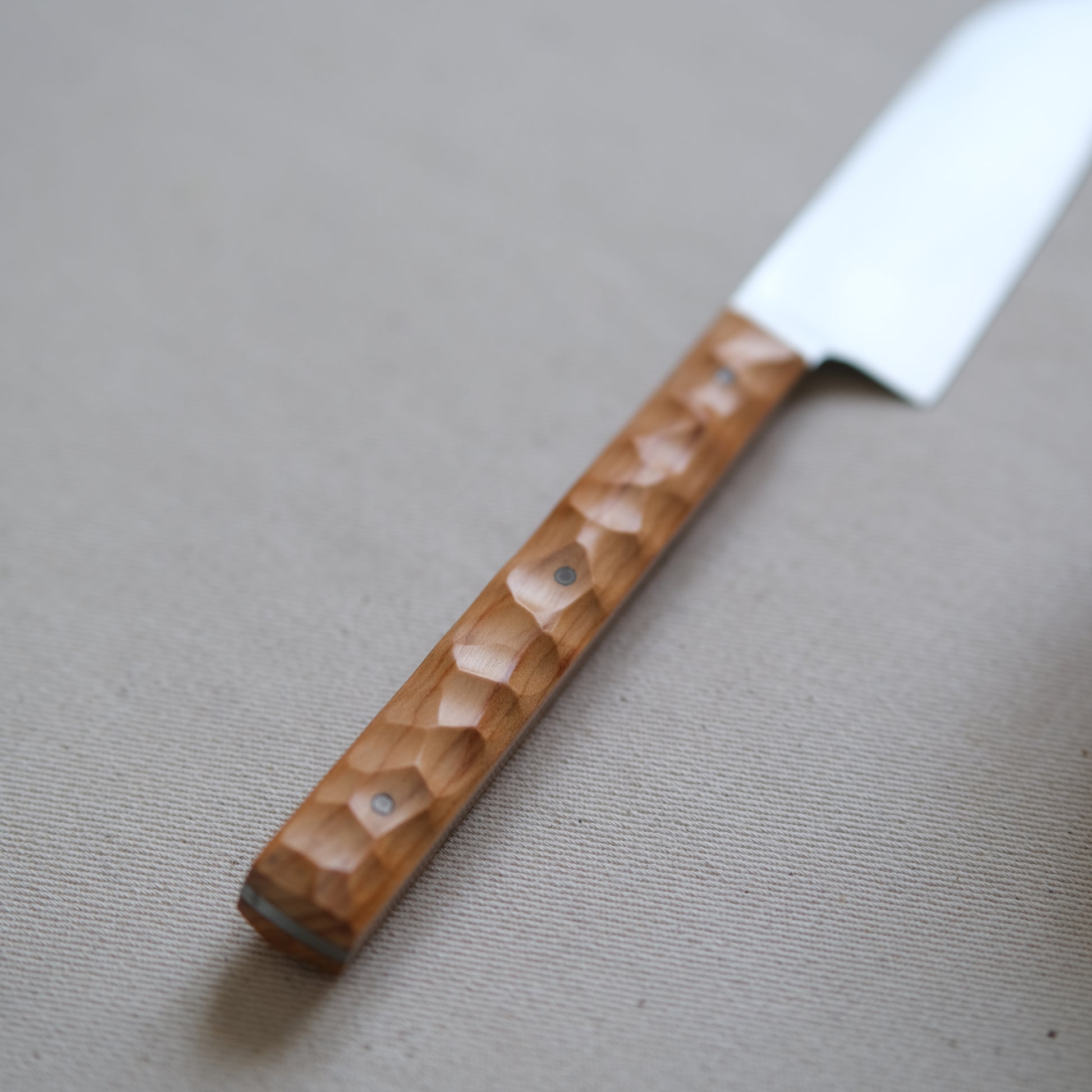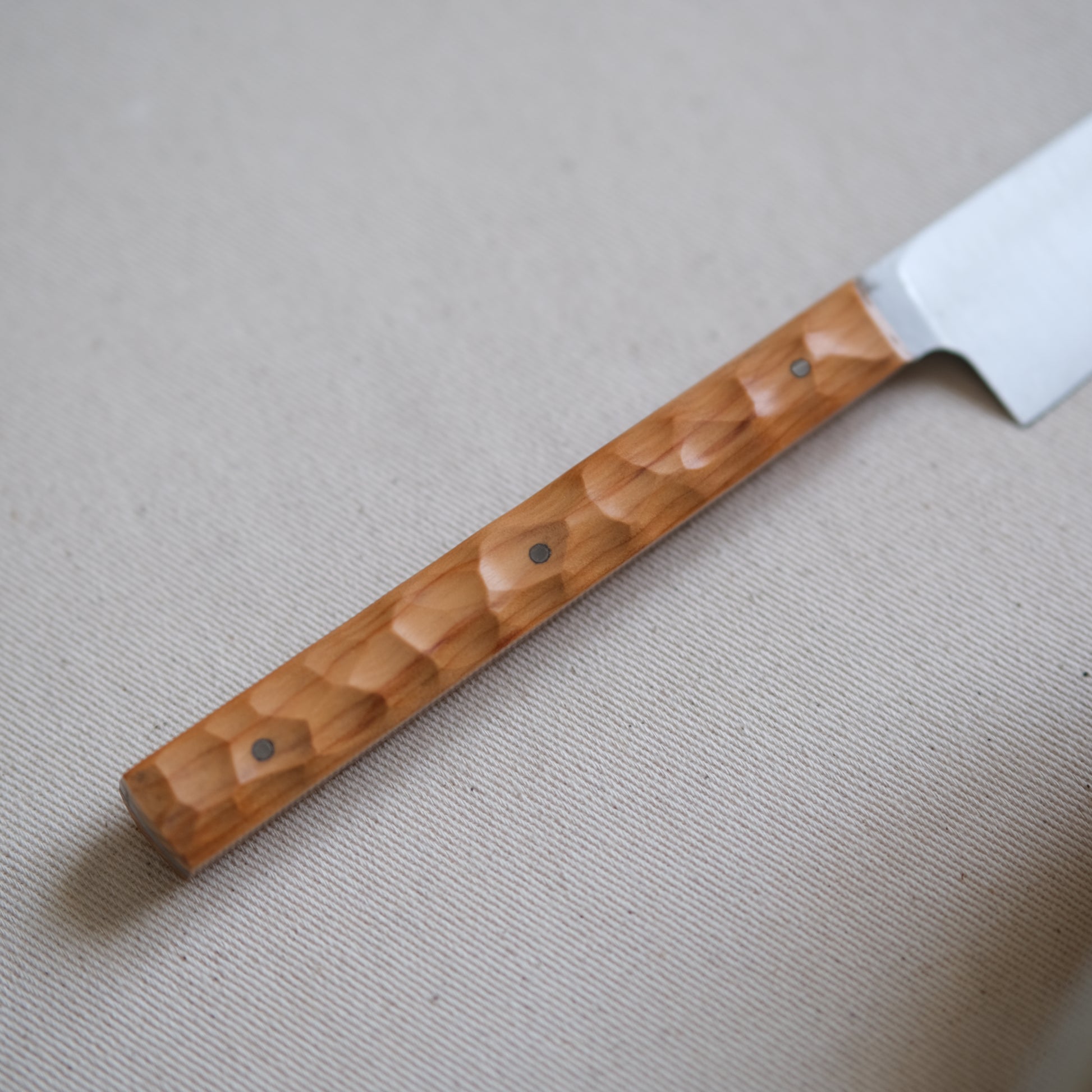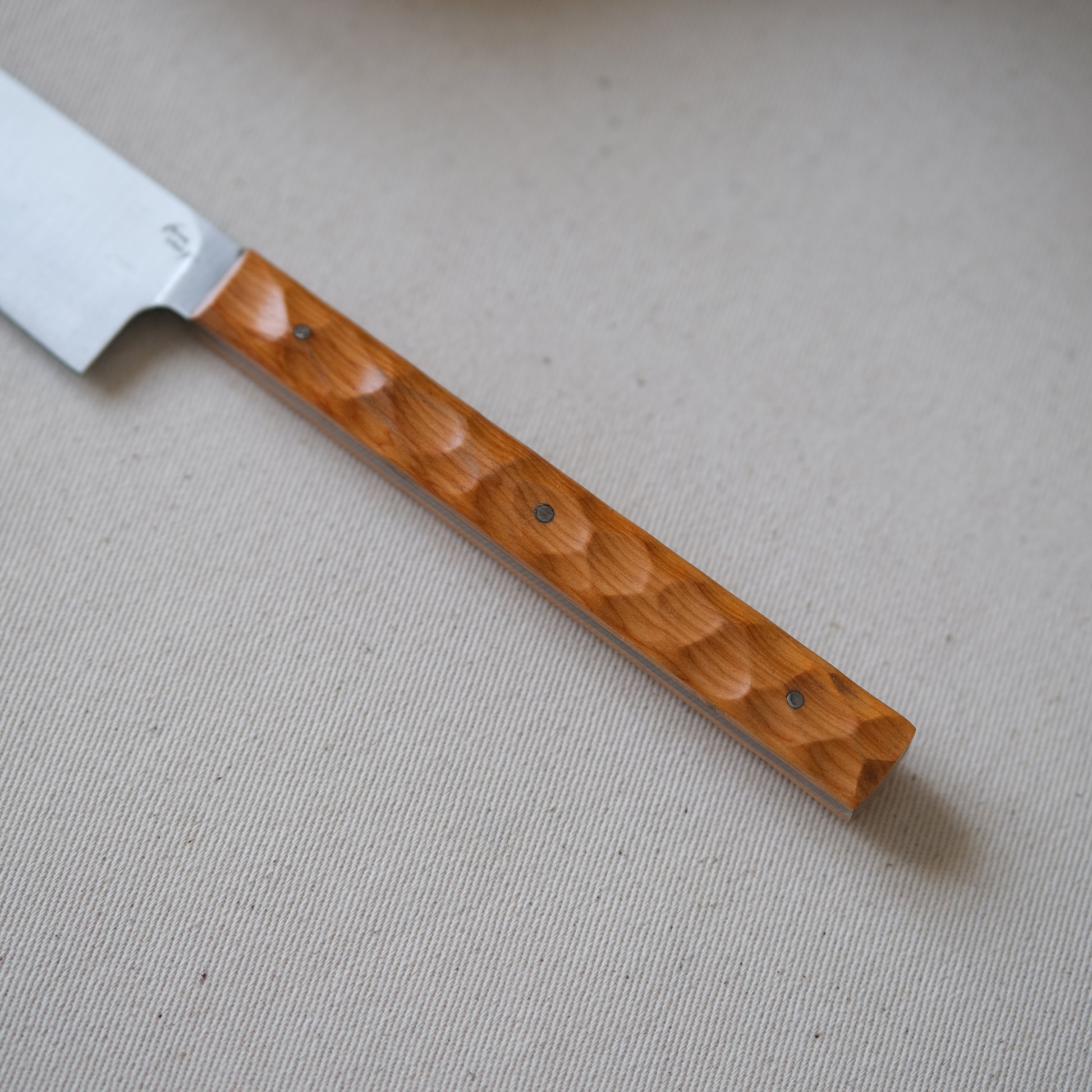 Chaque couteau de cuisine est réalisé entièrement à la main par mes soins dans mon atelier en Touraine (dessin, découpe & mise en forme de la lame, traitements thermiques, découpe et façonnage du manche, polissage, rivetage)
