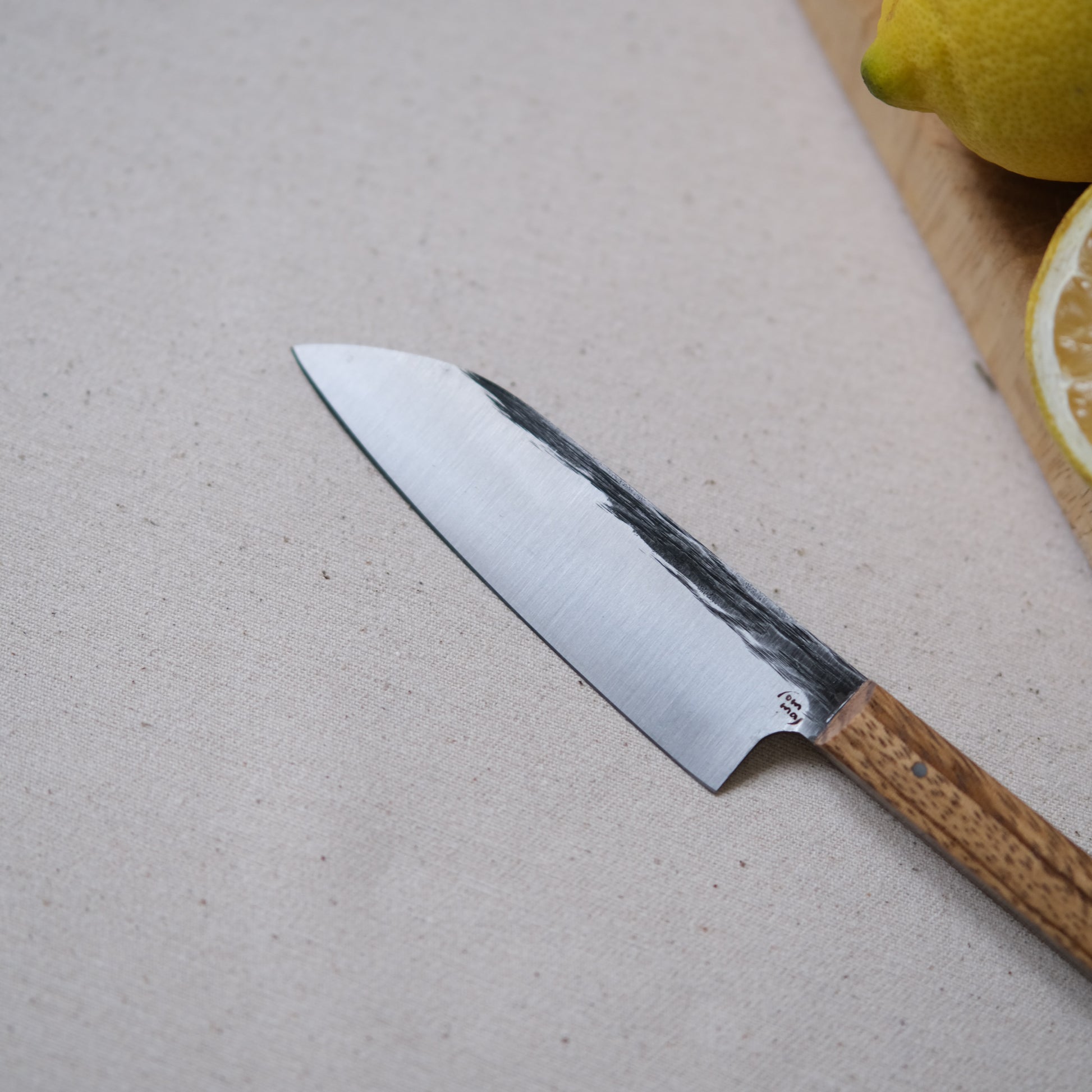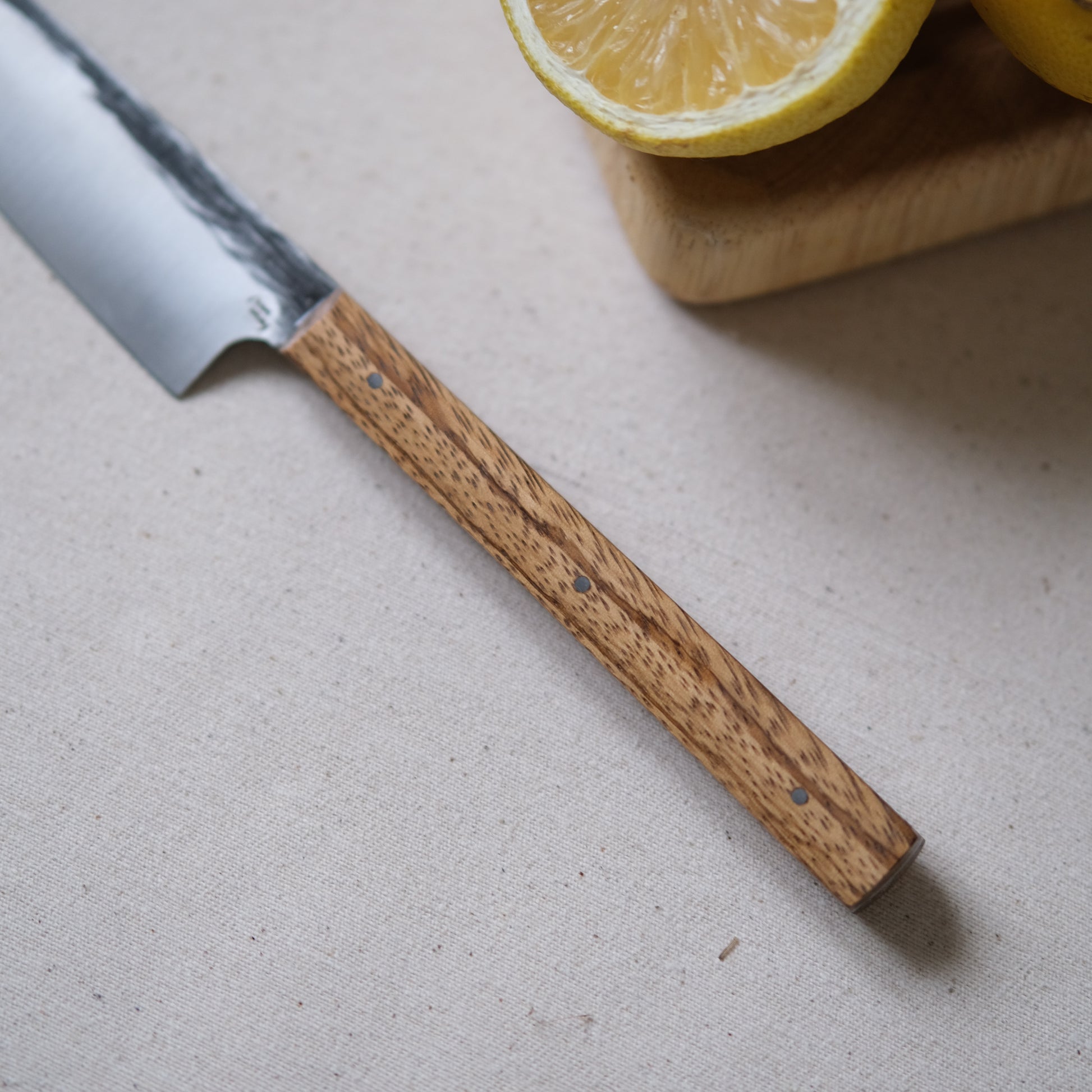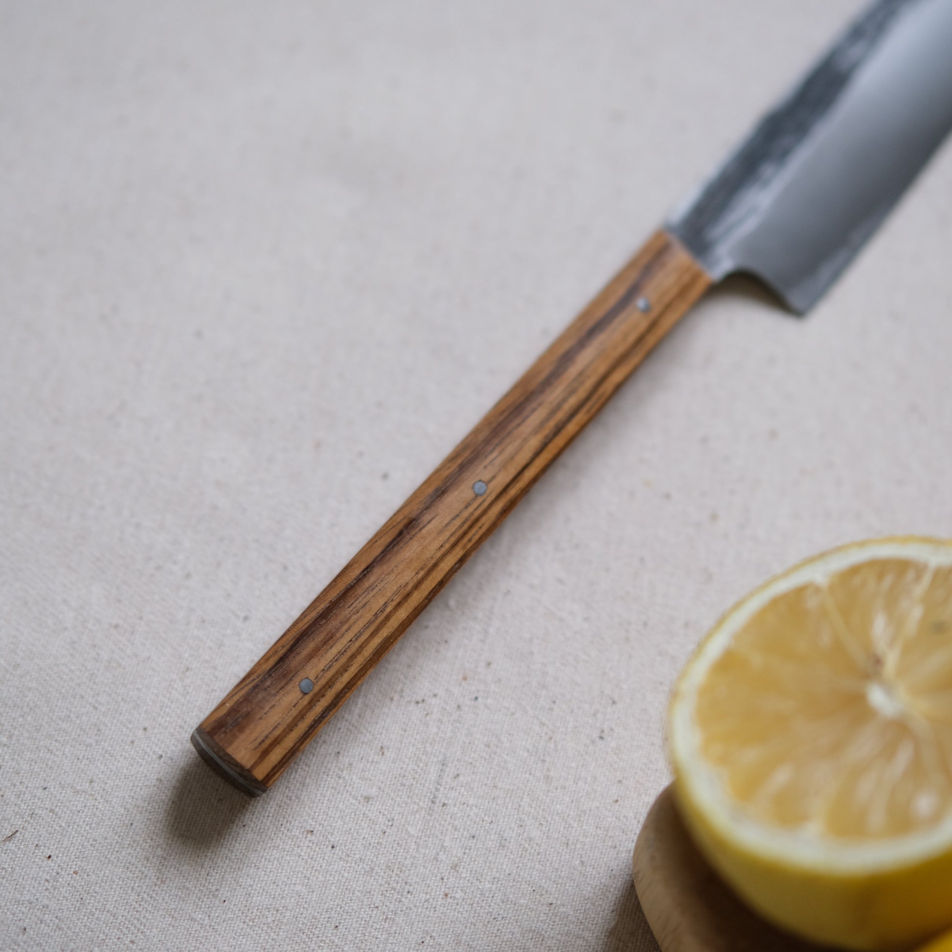 Chaque couteau de cuisine est réalisé entièrement à la main par mes soins dans mon atelier en Touraine (dessin, découpe & mise en forme de la lame, traitements thermiques, découpe et façonnage du manche, polissage, rivetage)