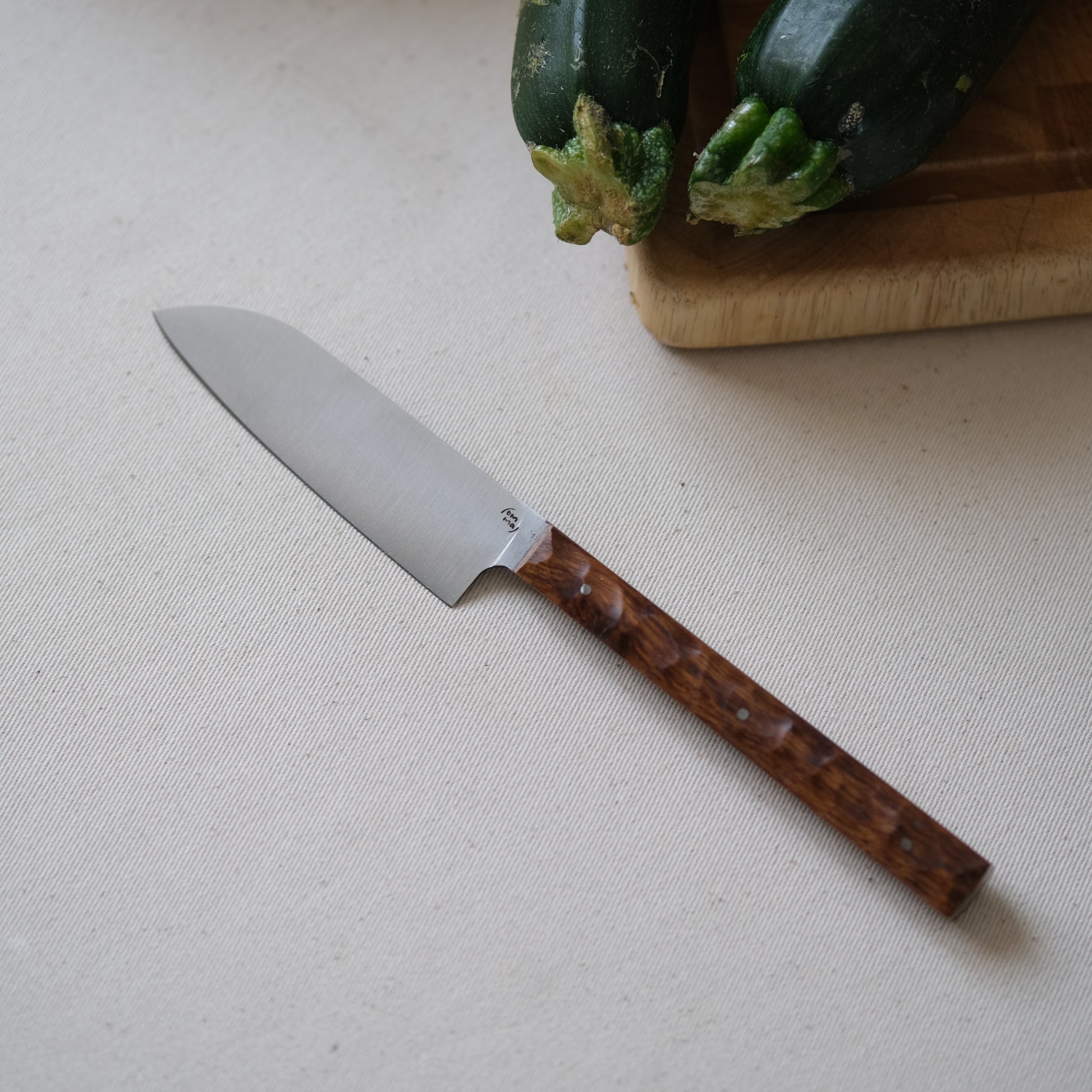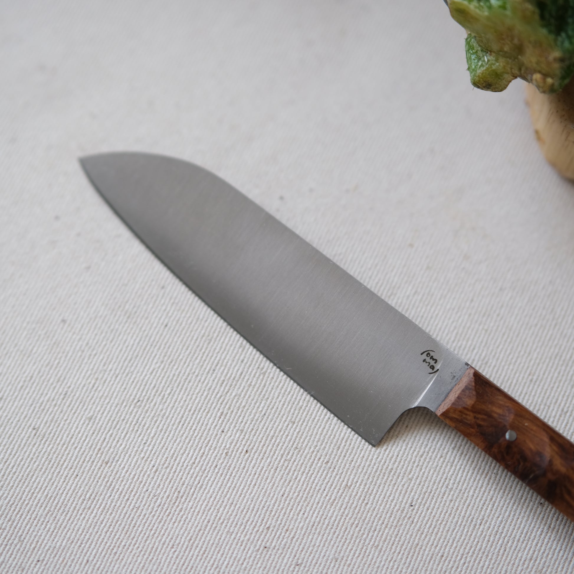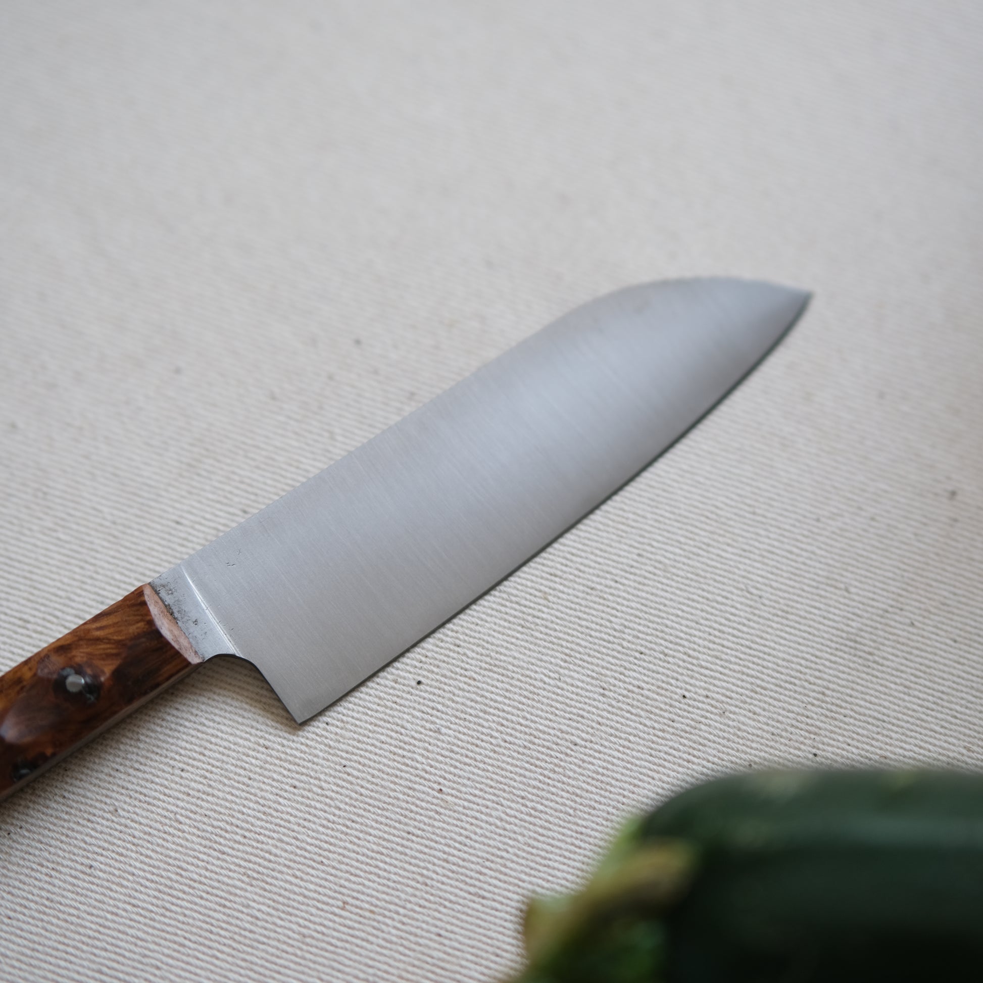 Chaque couteau de cuisine est réalisé entièrement à la main par mes soins dans mon atelier en Touraine (dessin, découpe & mise en forme de la lame, traitements thermiques, découpe et façonnage du manche, polissage, rivetage)