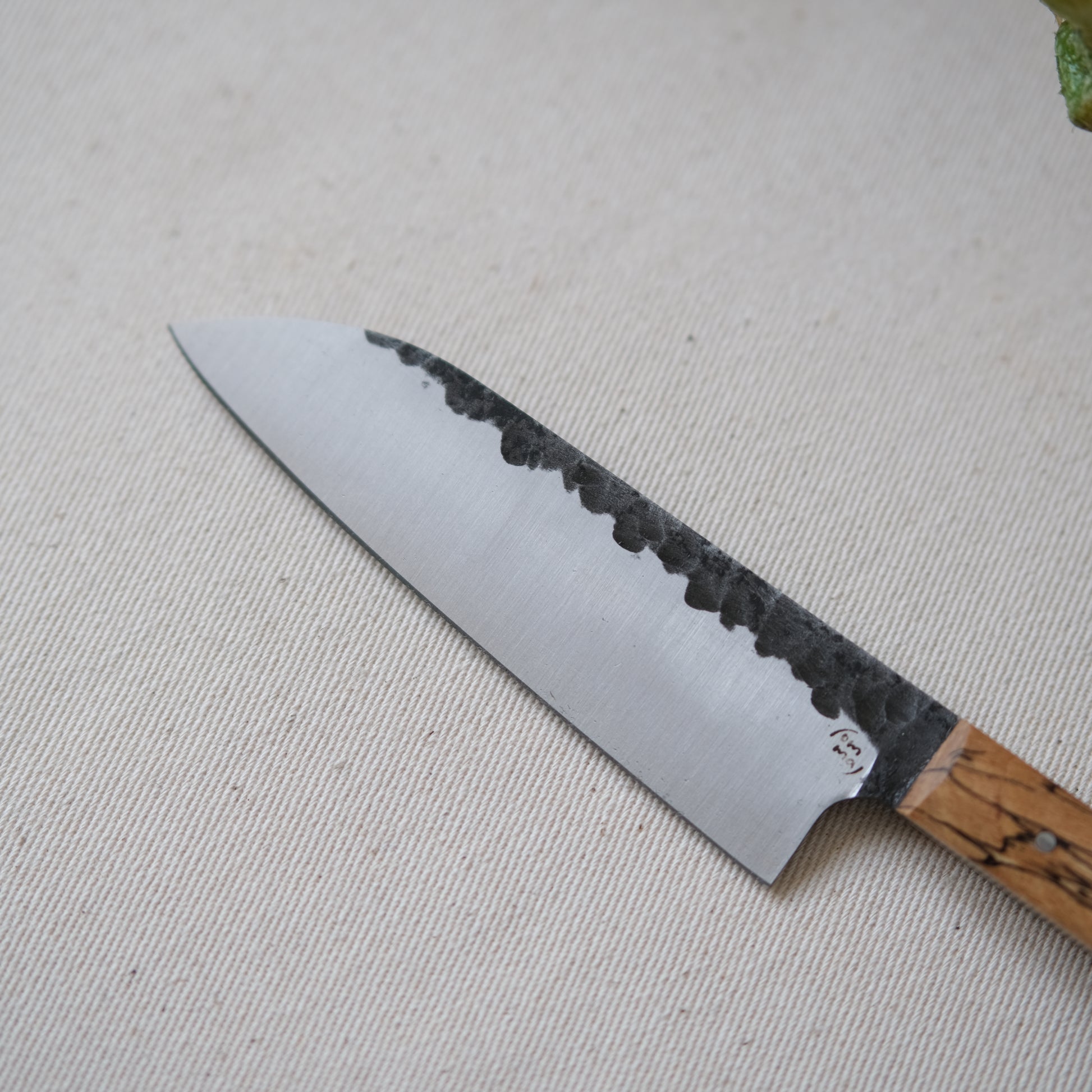 Chaque couteau de cuisine est réalisé entièrement à la main par mes soins dans mon atelier en Touraine (dessin, découpe & mise en forme de la lame, traitements thermiques, découpe et façonnage du manche, polissage, rivetage)