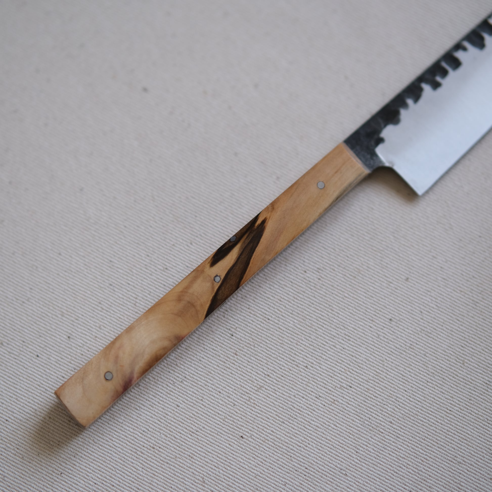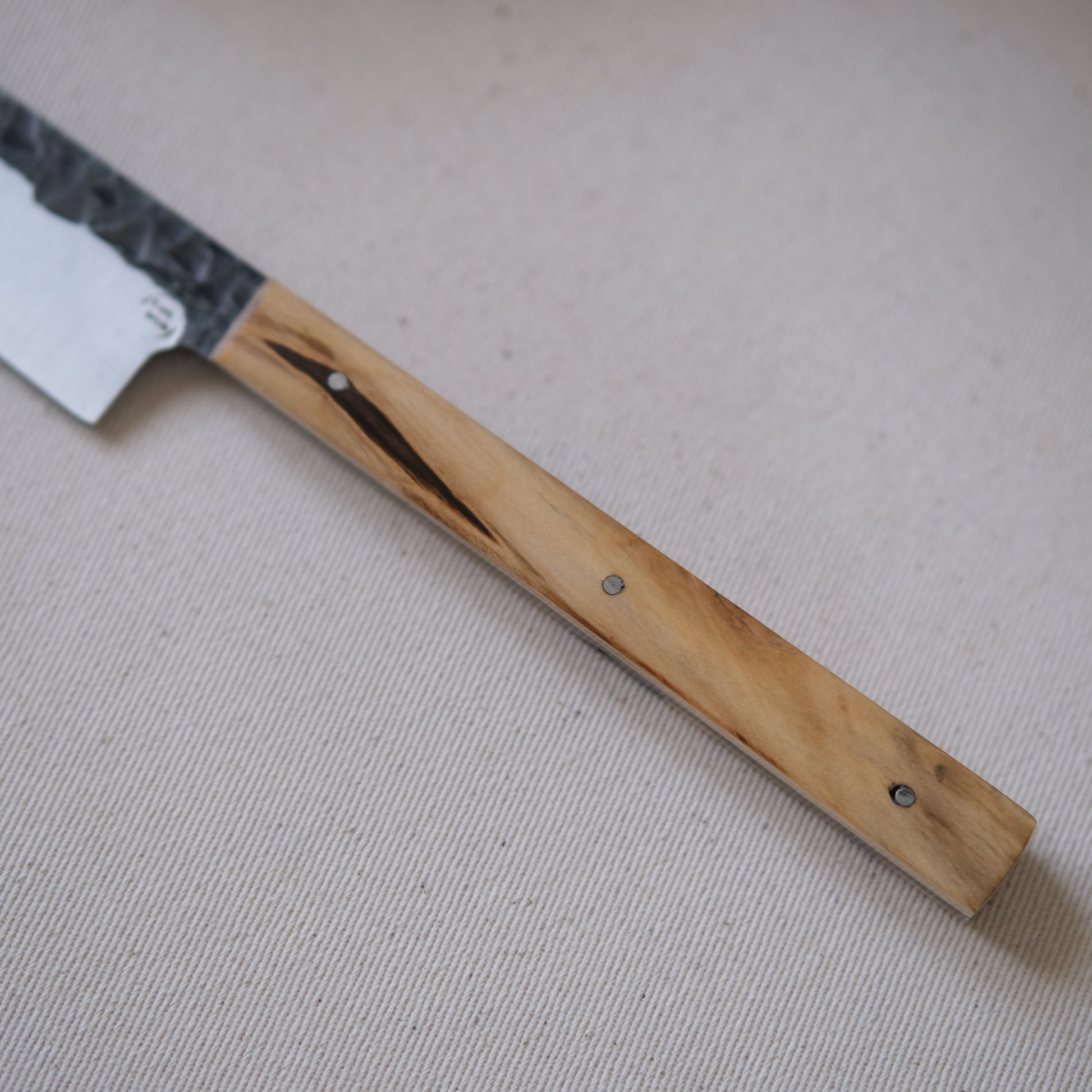 Chaque couteau de cuisine est réalisé entièrement à la main par mes soins dans mon atelier en Touraine (dessin, découpe & mise en forme de la lame, traitements thermiques, découpe et façonnage du manche, polissage, rivetage)