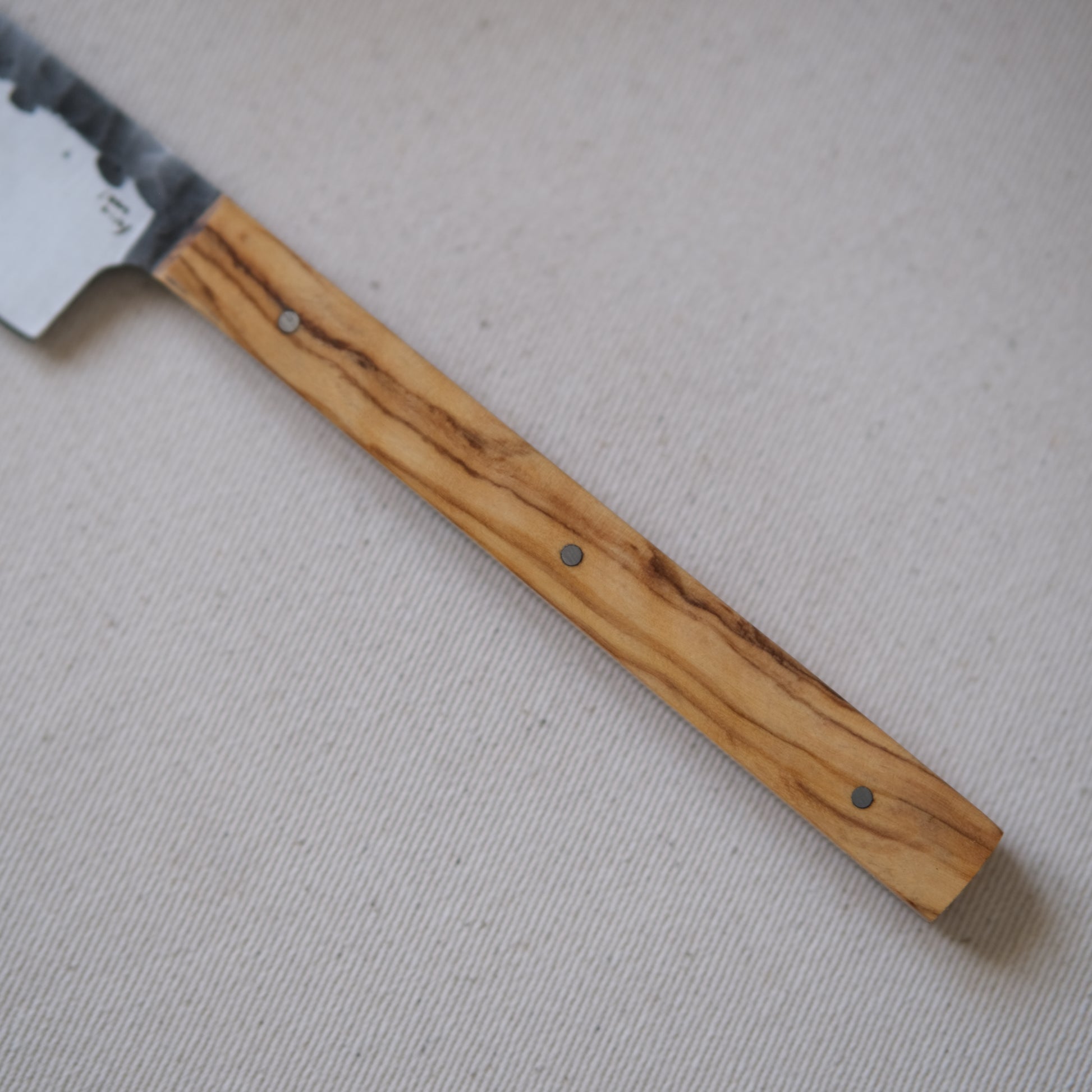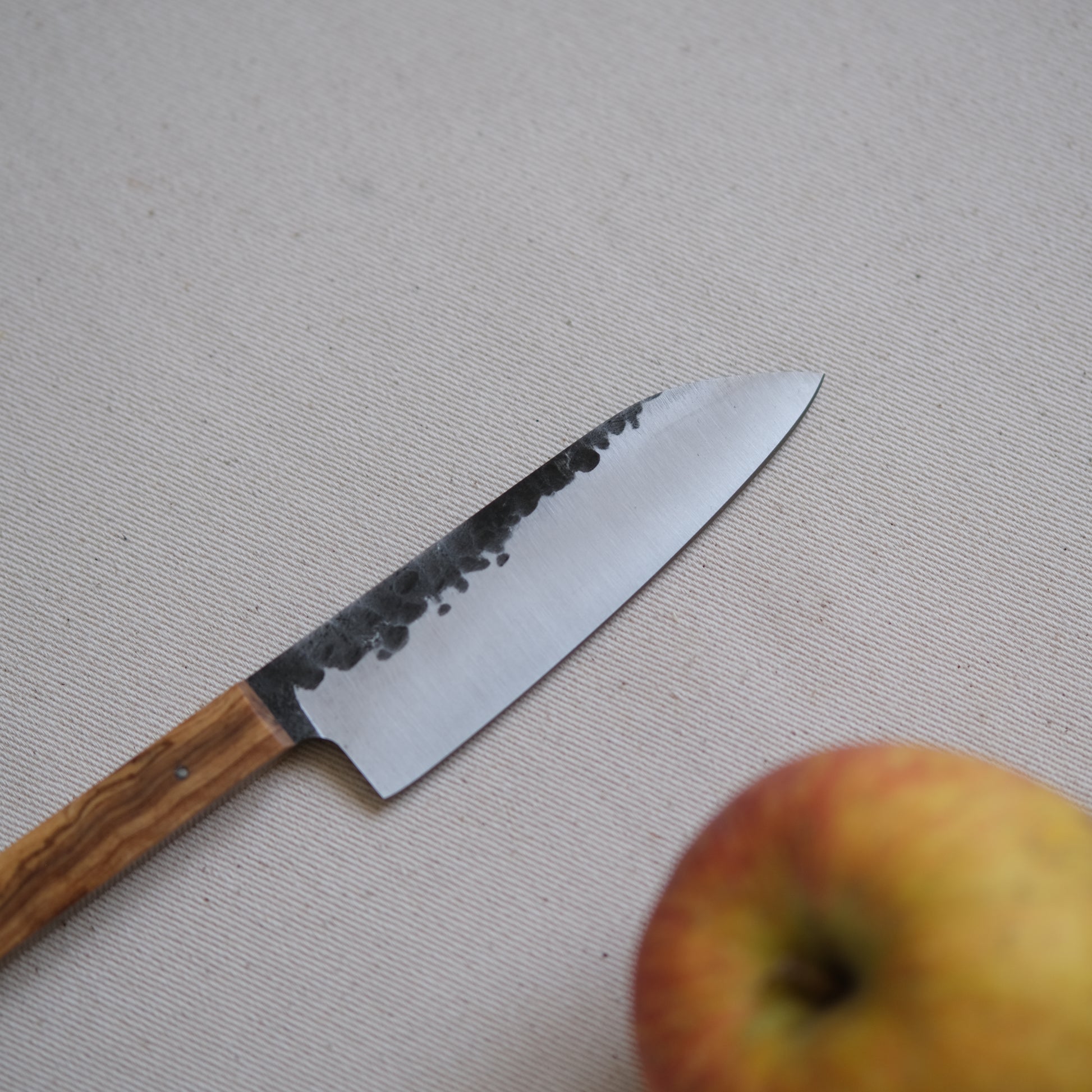 Chaque couteau de cuisine est réalisé entièrement à la main par mes soins dans mon atelier en Touraine (dessin, découpe & mise en forme de la lame, traitements thermiques, découpe et façonnage du manche, polissage, rivetage)
