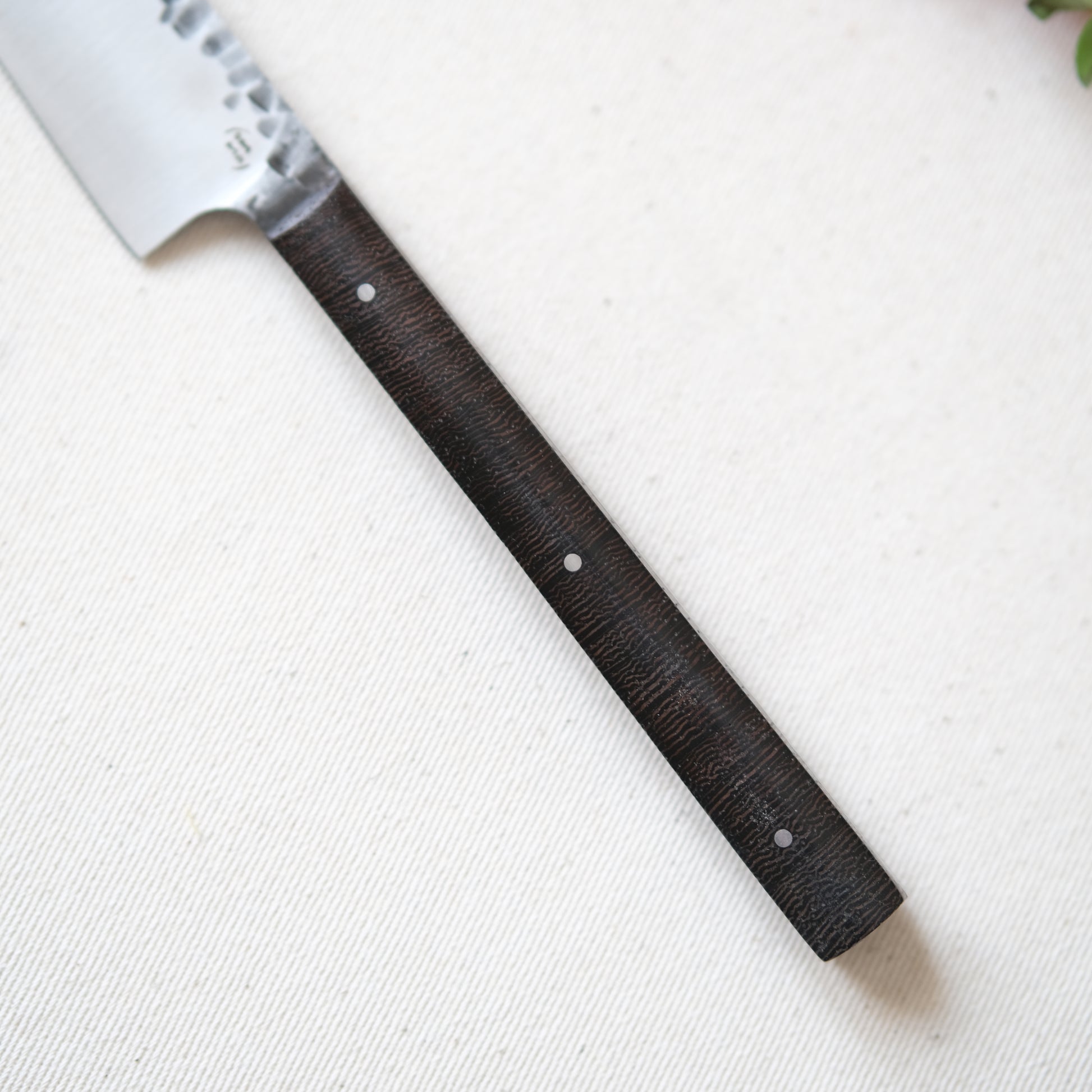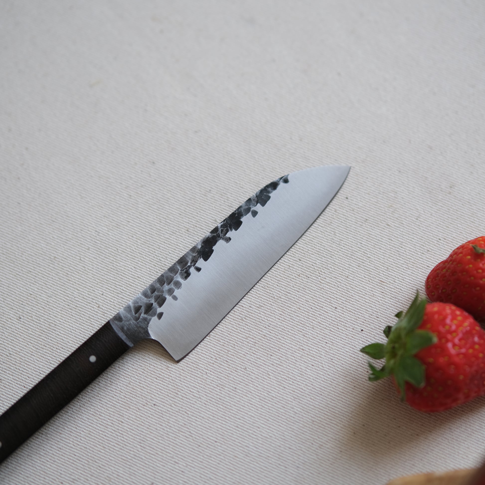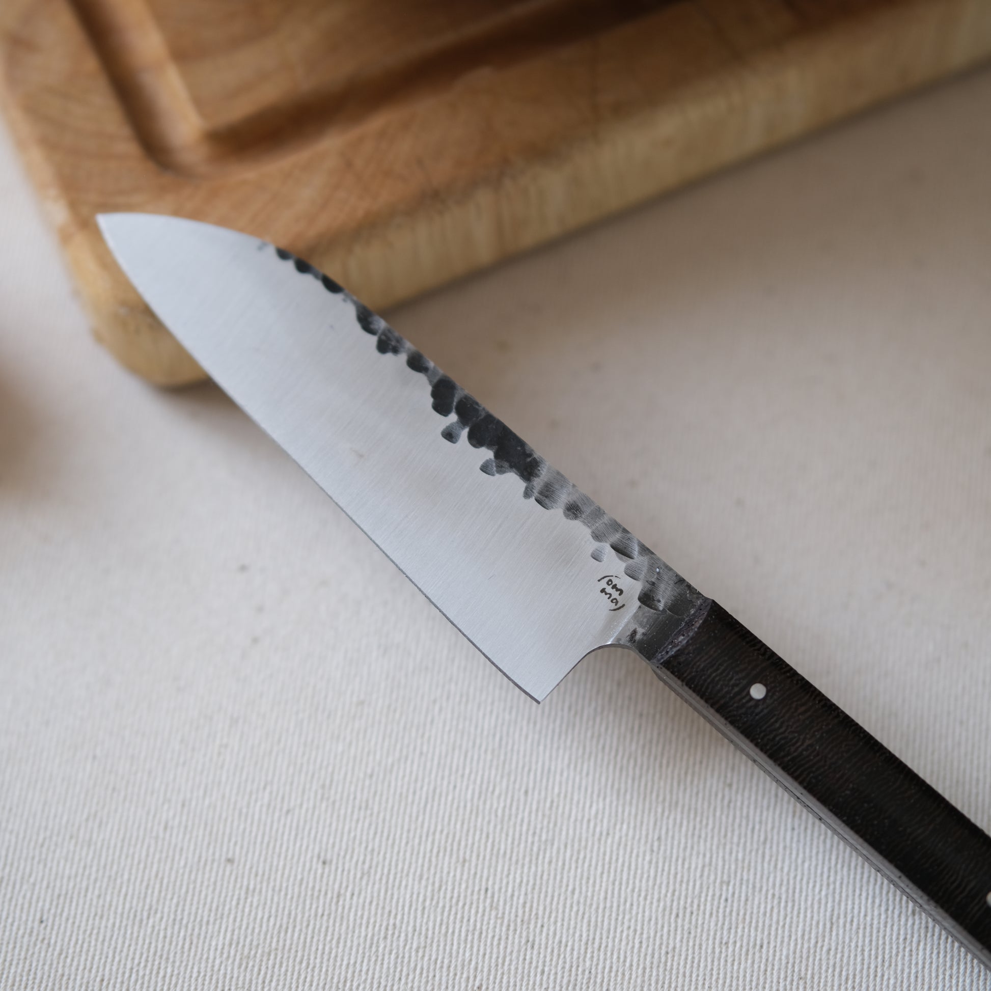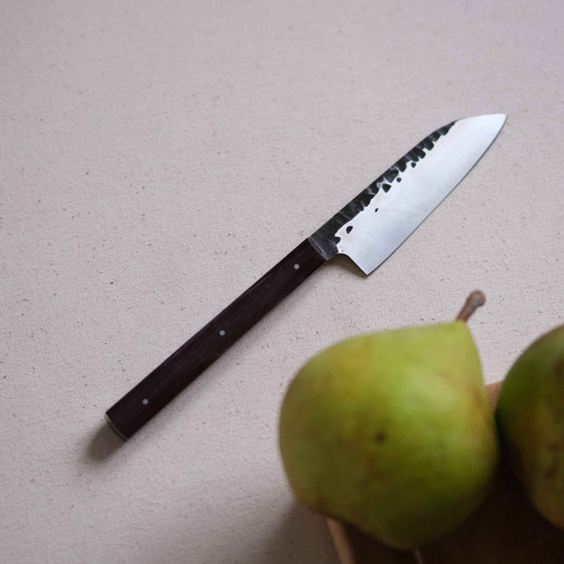 Chaque couteau de cuisine est réalisé entièrement à la main par mes soins dans mon atelier en Touraine (dessin, découpe & mise en forme de la lame, traitements thermiques, découpe et façonnage du manche, polissage, rivetage)