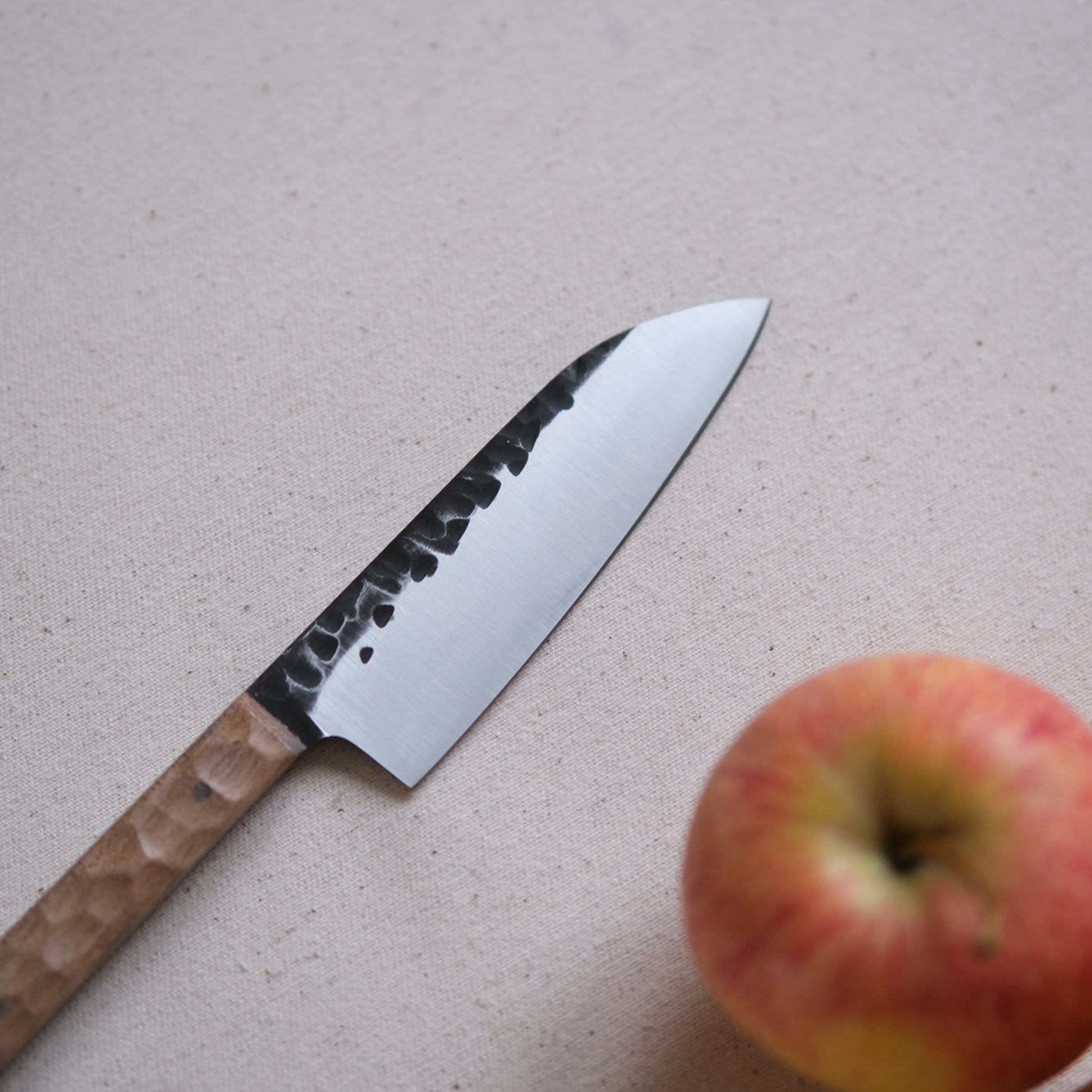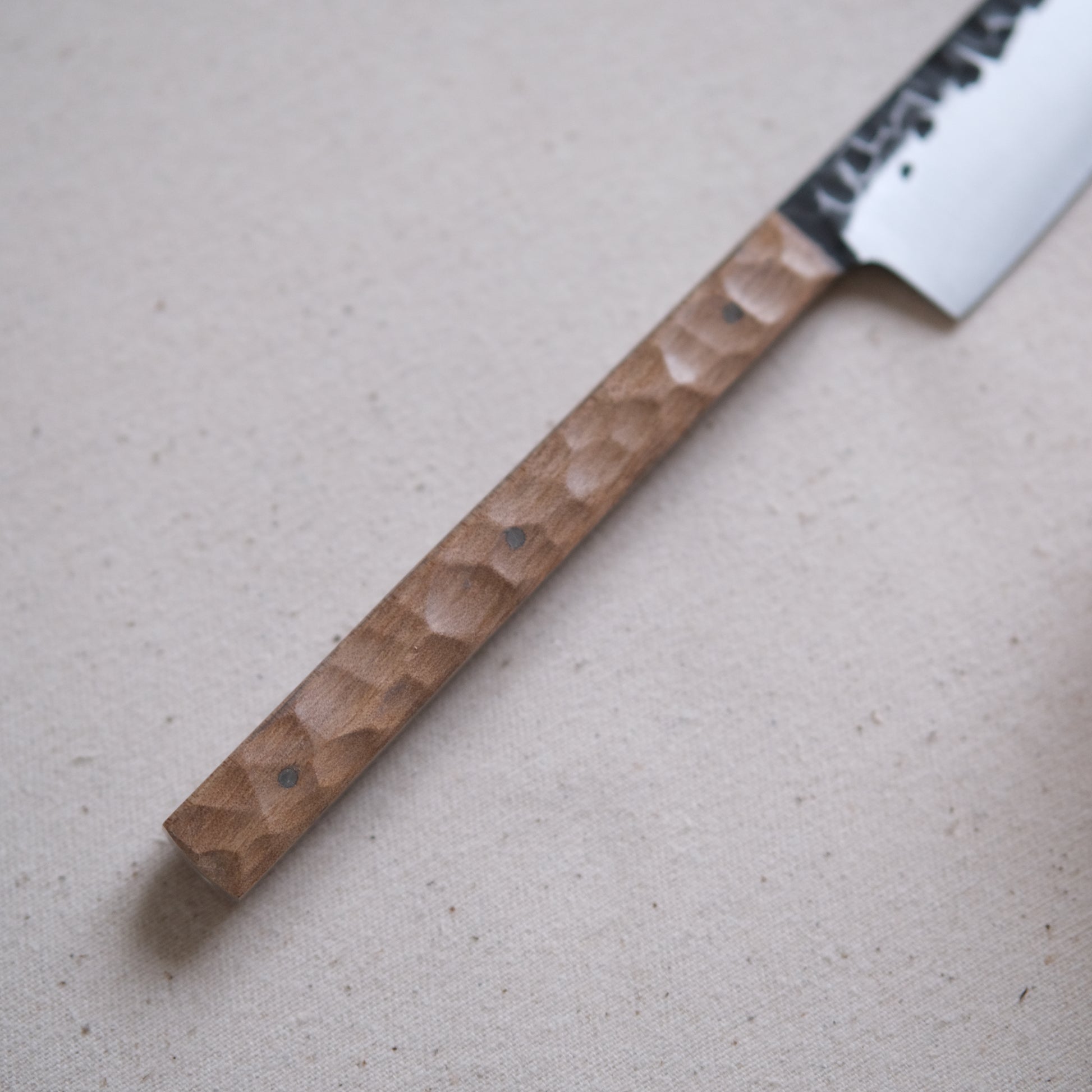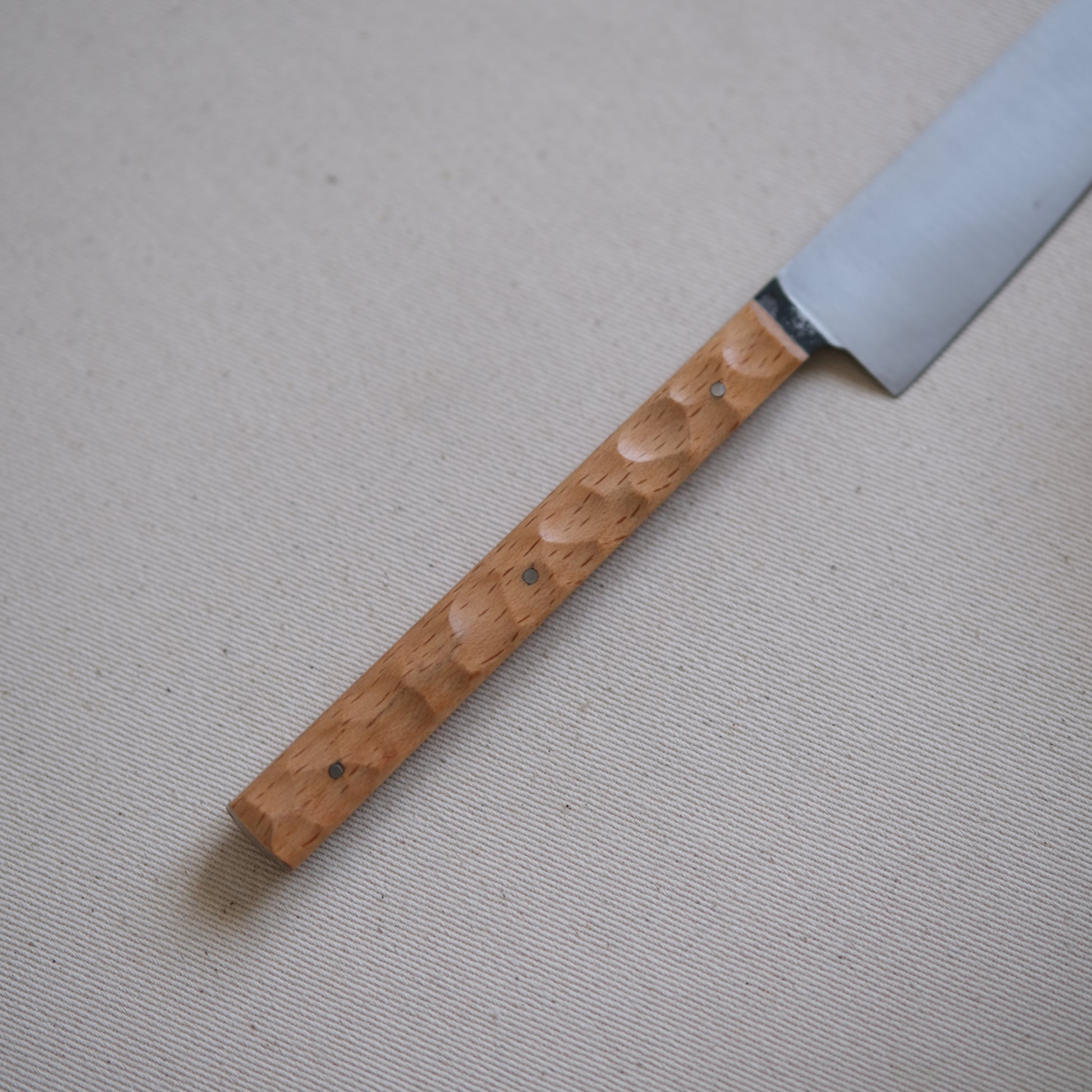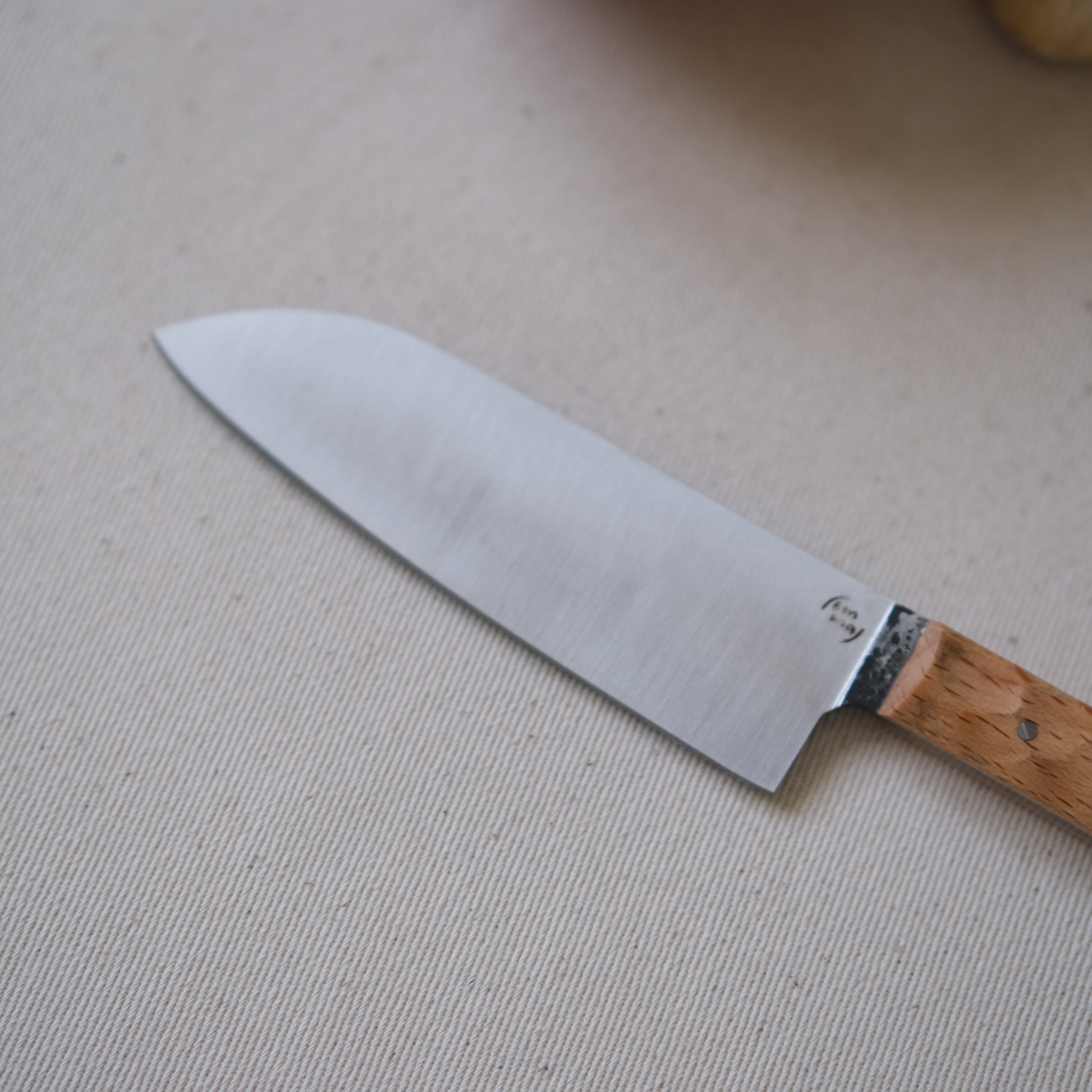Chaque couteau de cuisine est réalisé entièrement à la main par mes soins dans mon atelier en Touraine (dessin, découpe & mise en forme de la lame, traitements thermiques, découpe et façonnage du manche, polissage, rivetage)