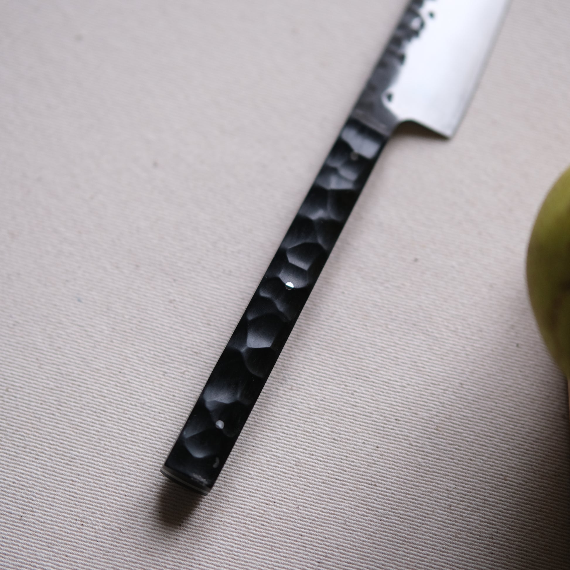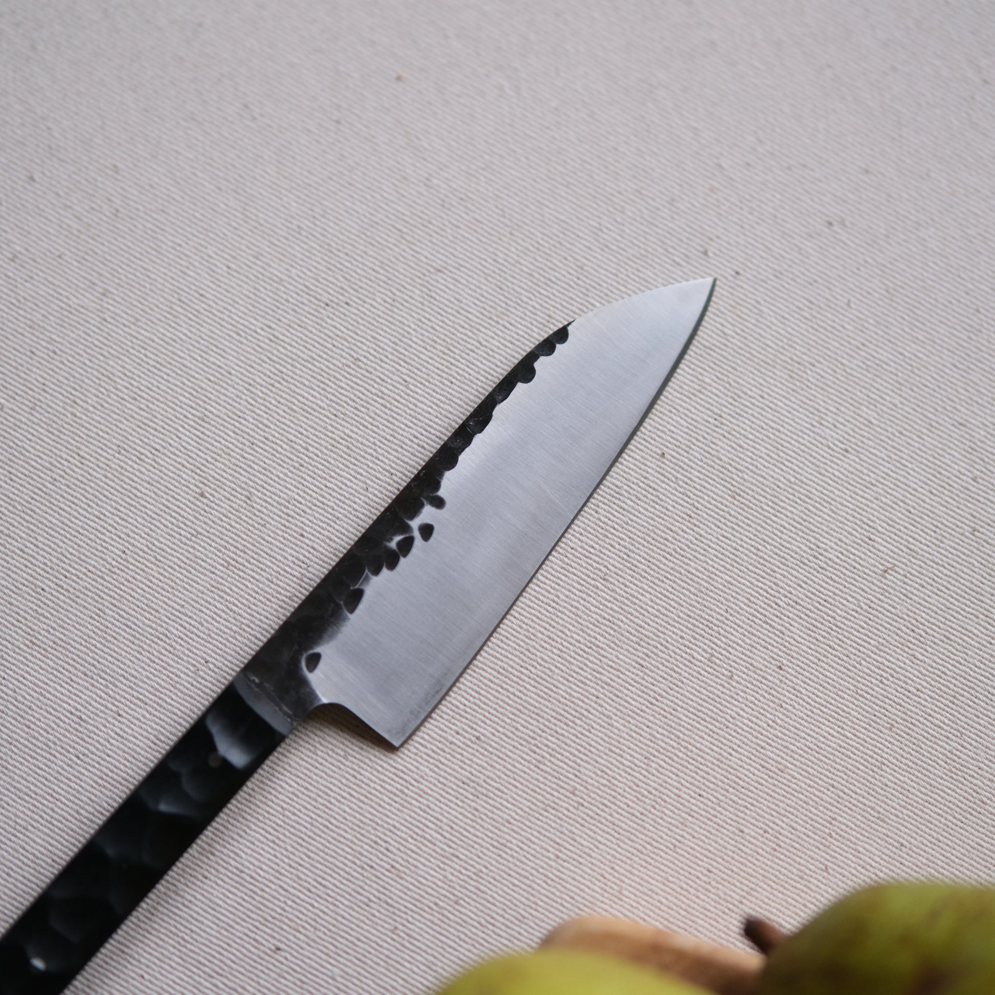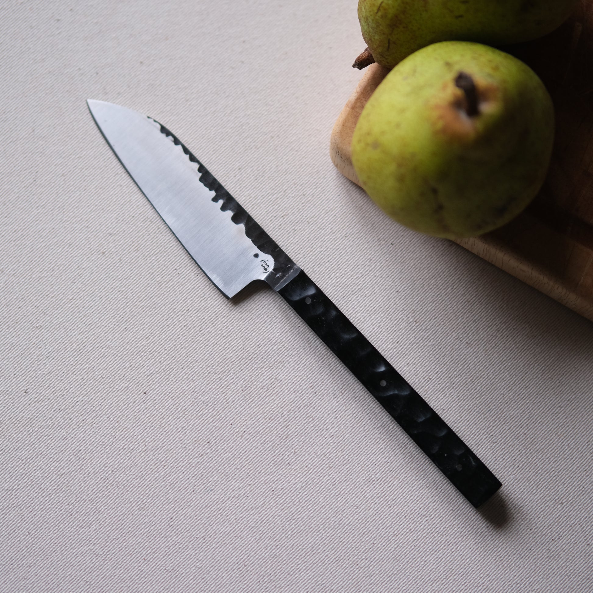 Chaque couteau de cuisine est réalisé entièrement à la main par mes soins dans mon atelier en Touraine (dessin, découpe & mise en forme de la lame, traitements thermiques, découpe et façonnage du manche, polissage, rivetage)