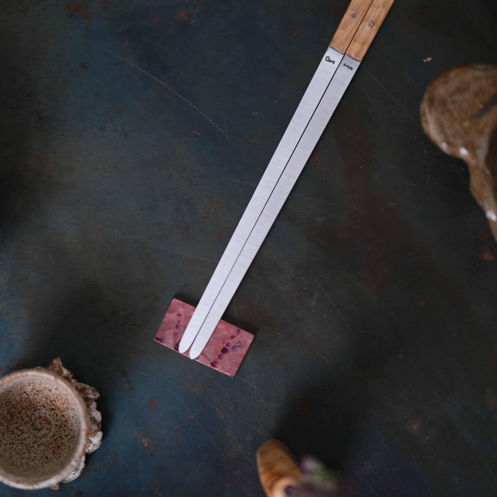 Les baguettes Omma sont réalisés en acier inoxydable et en bois ou matériaux composites pour le manche.