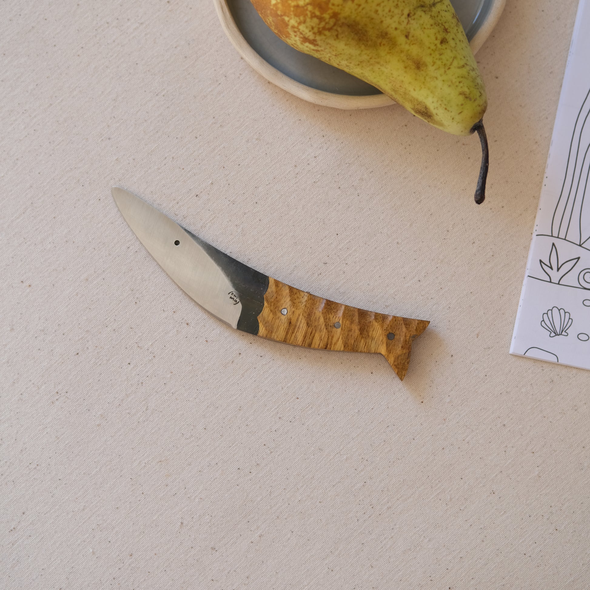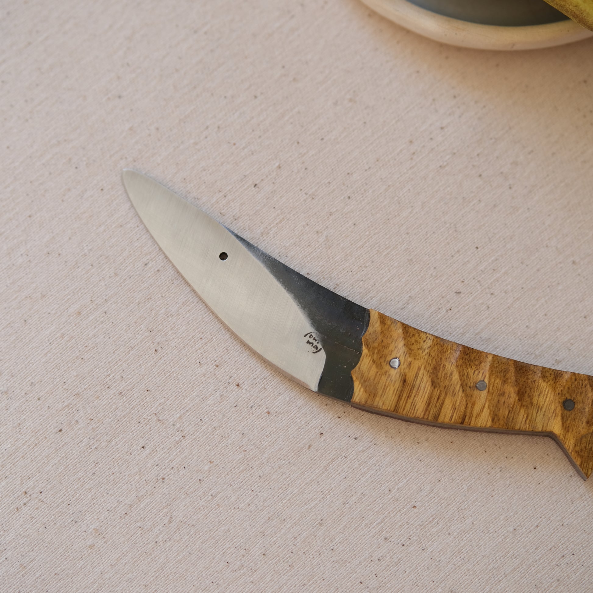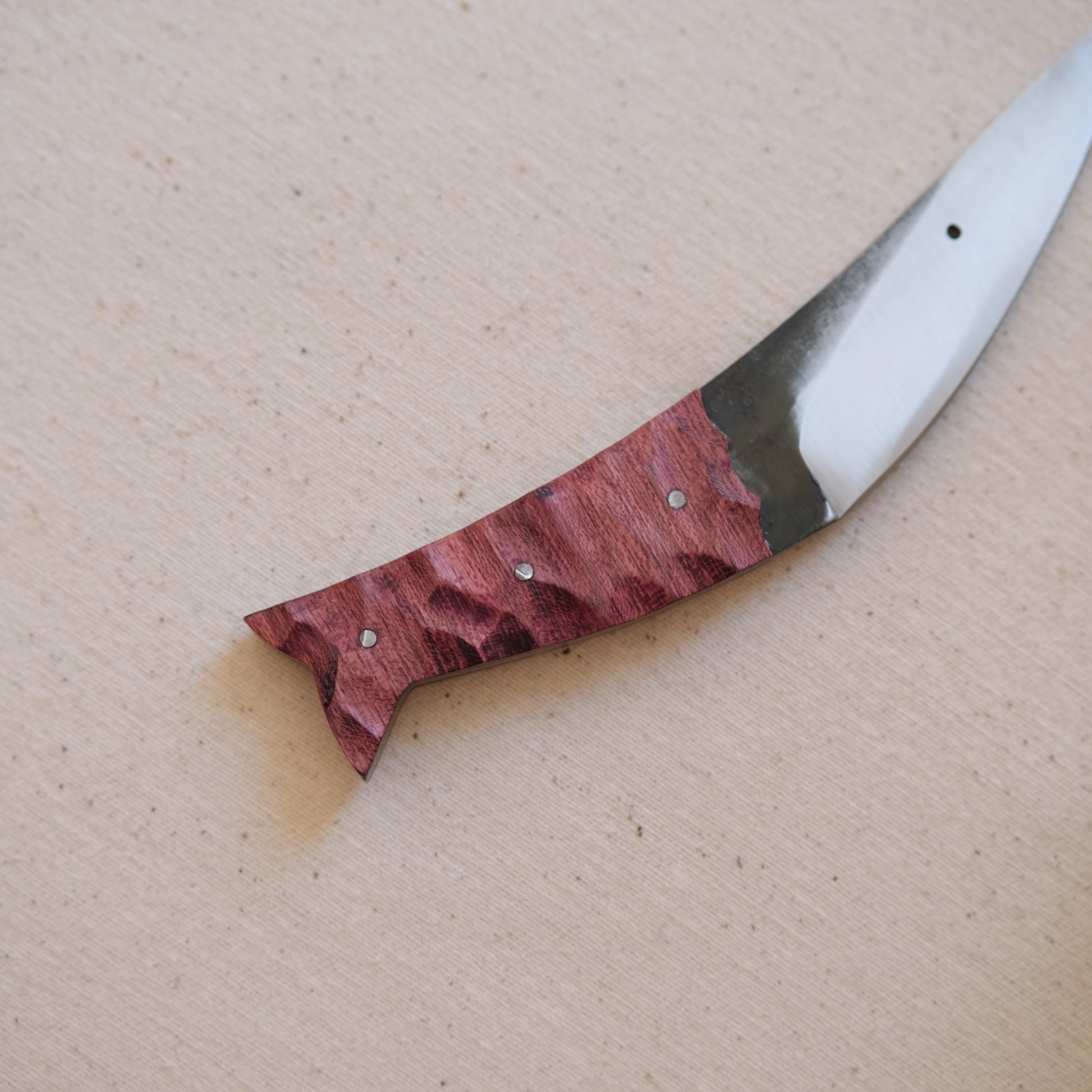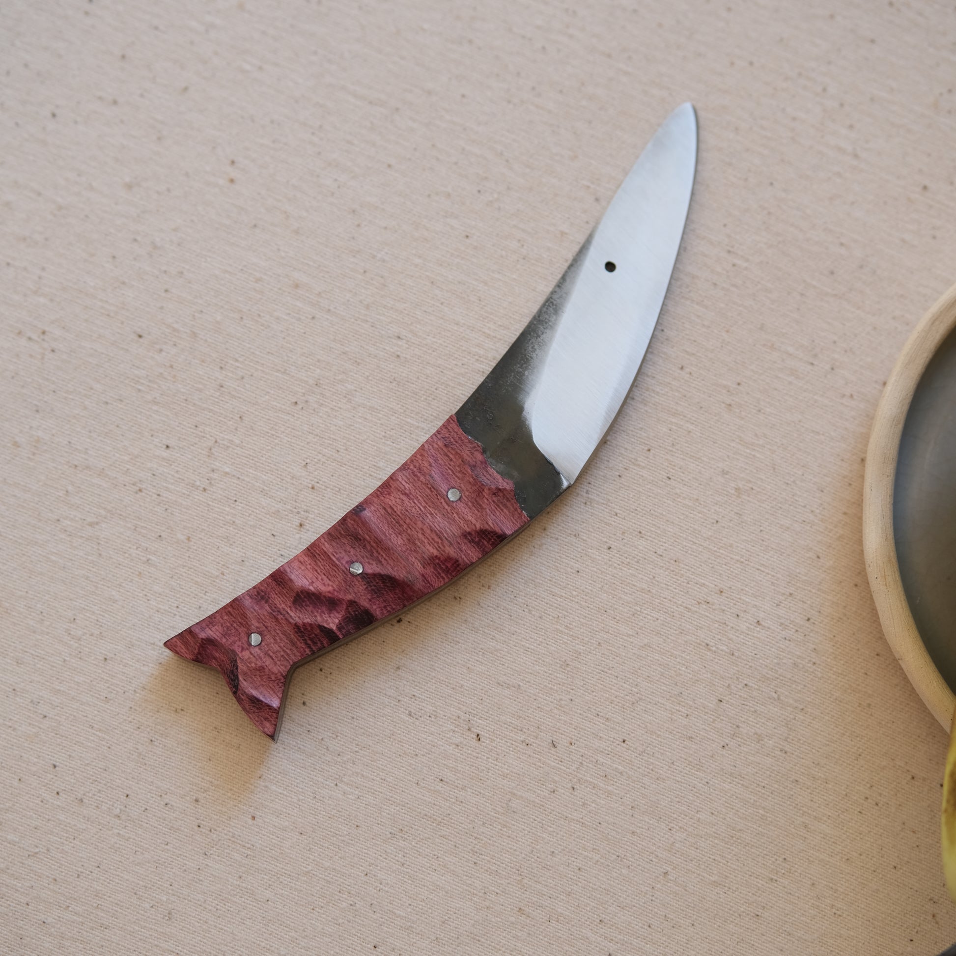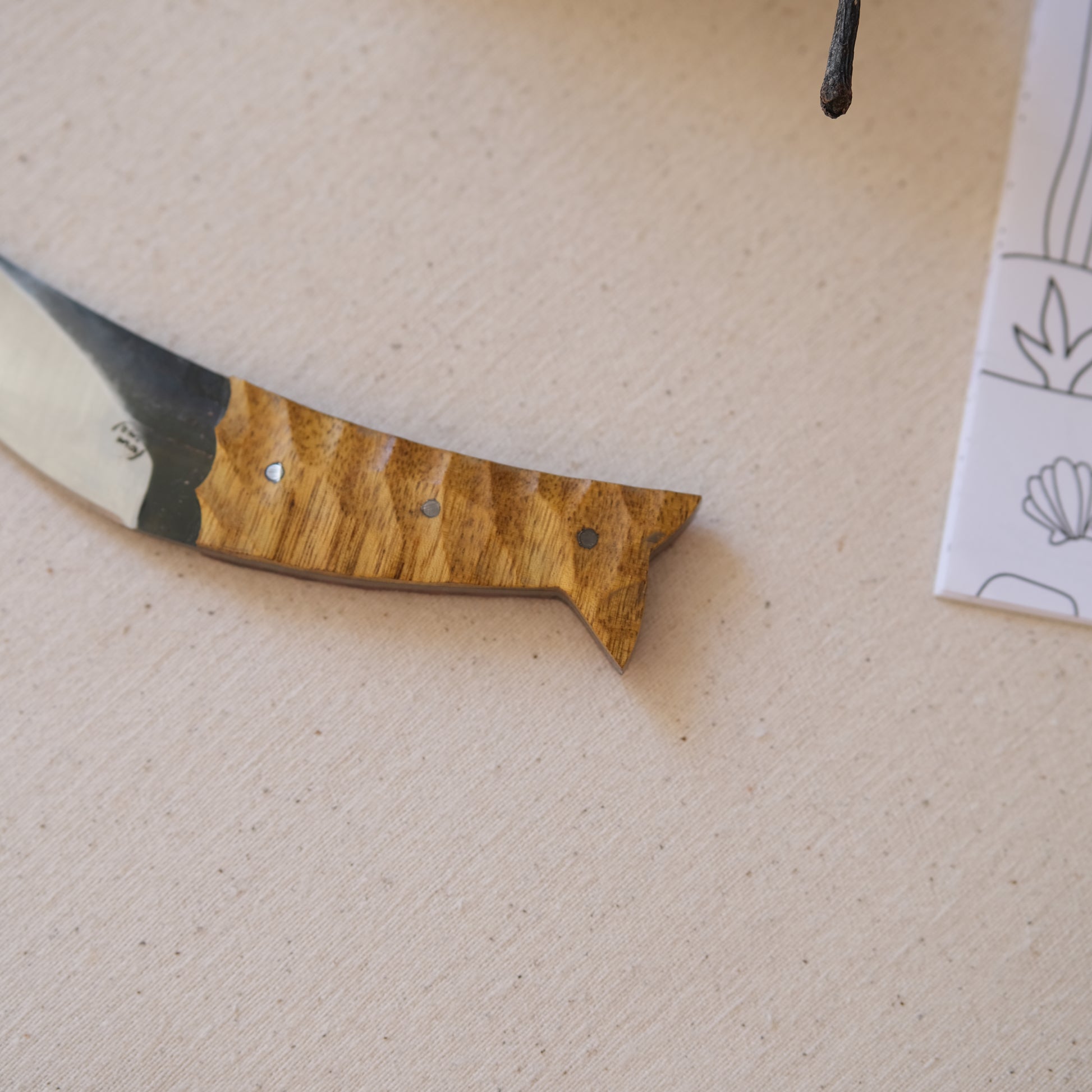 Son manche est réalisé à partir de morceaux de bois trop petits pour réaliser des couteaux d'adultes. Il est bicolore : une face est en difou, l'autre en amarante, deux essences exotiques aux couleurs jaune et violette intenses. Les deux faces du manche sont texturées pour une excellente prise en main. Les reliefs rappellent ceux des écailles de poisson.