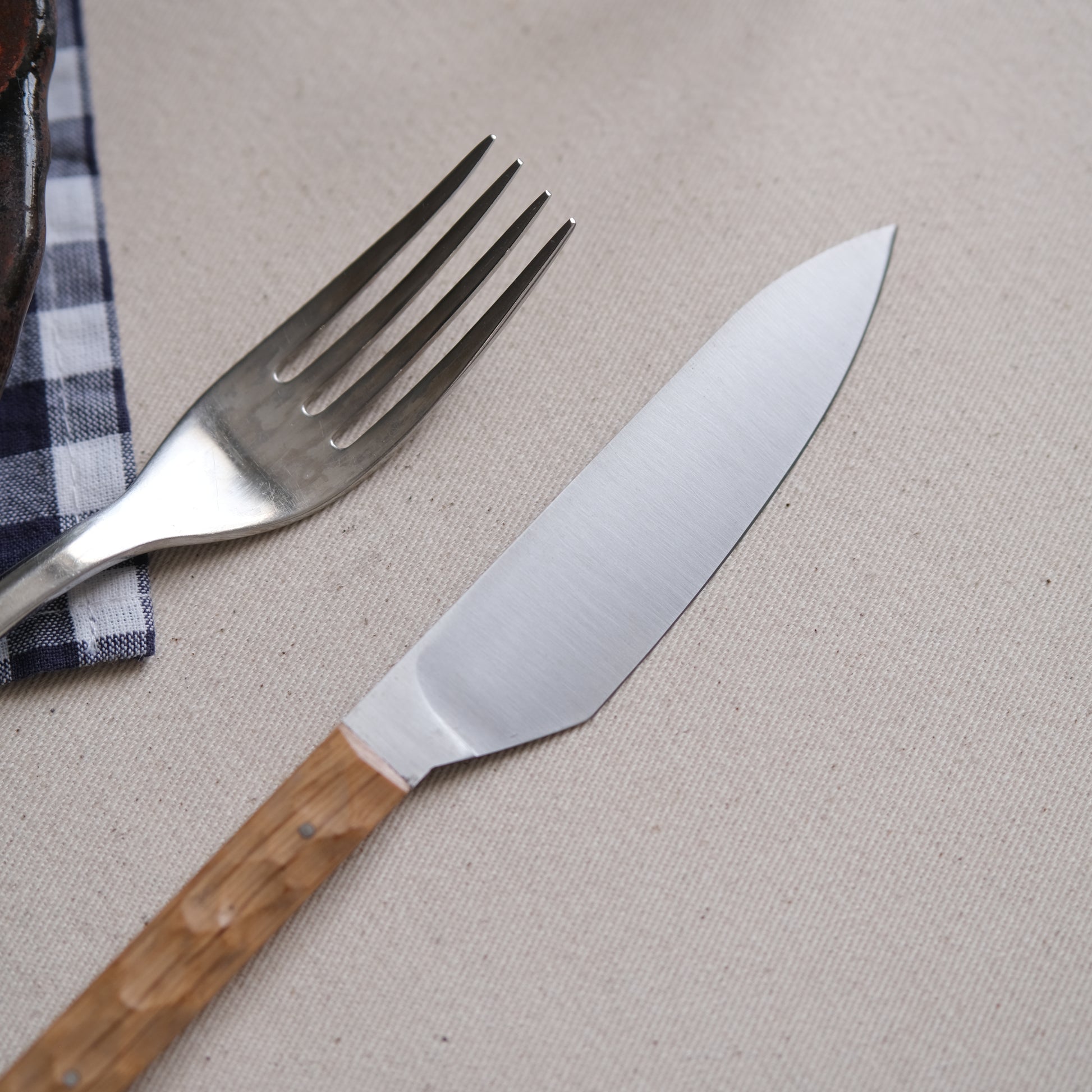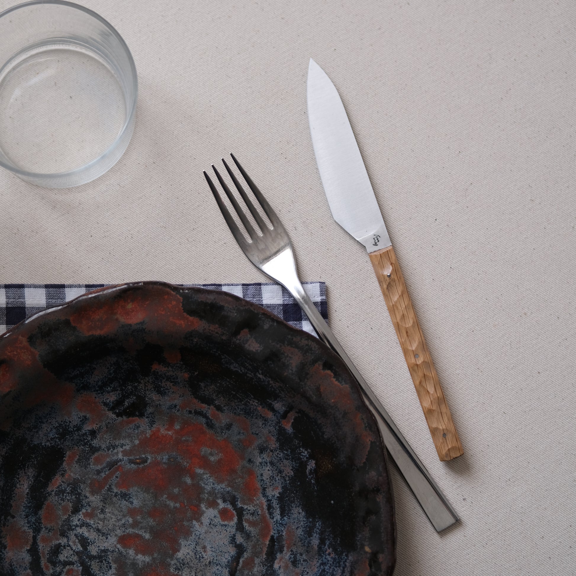 Son manche, aux lignes droites et fines est en chêne, une essence locale à la teinte claire. Pour un style affirmé et singulier, le manche est texturé. Les aspérités créées à sa surface offrent une prise en main optimale et beaucoup de caractère à votre table.