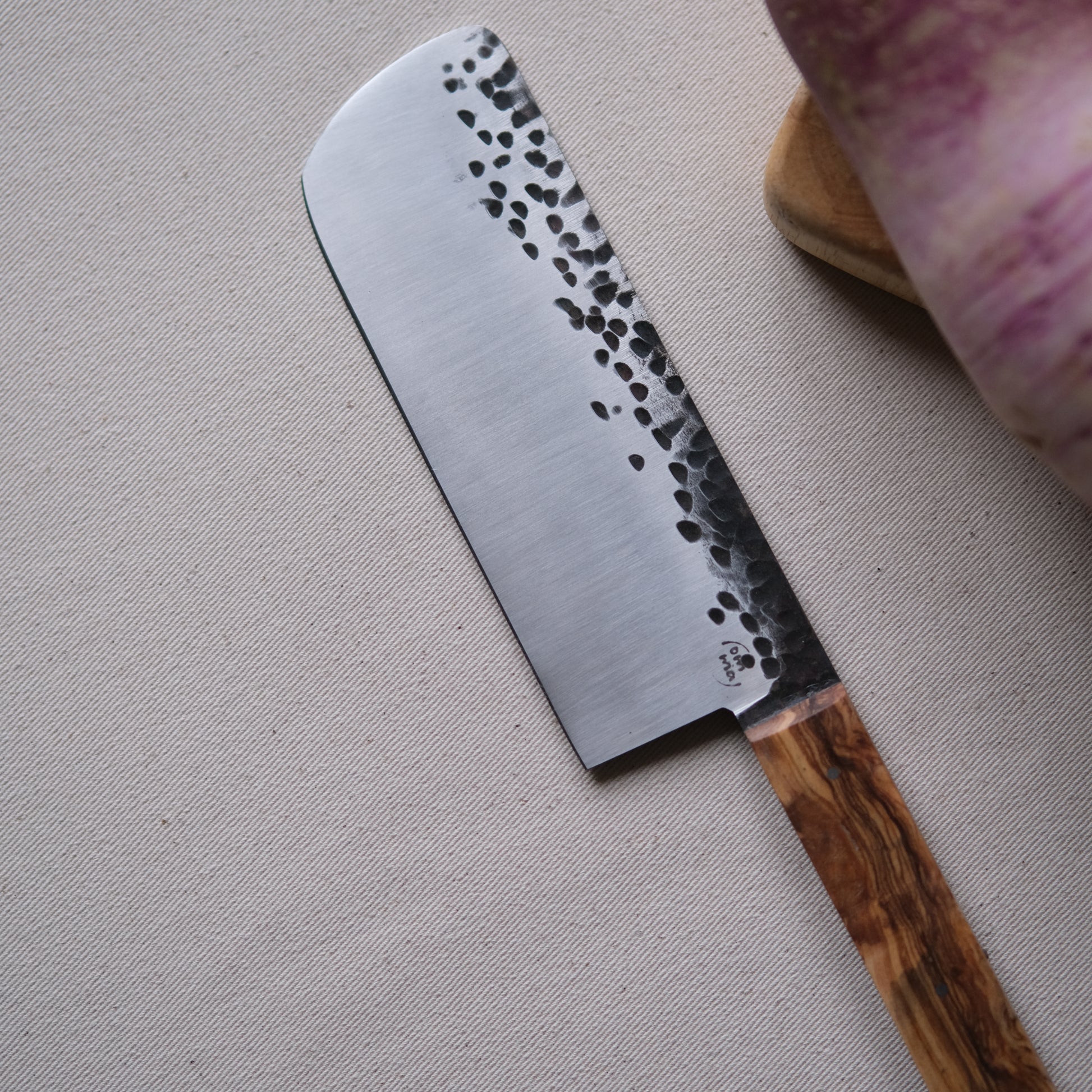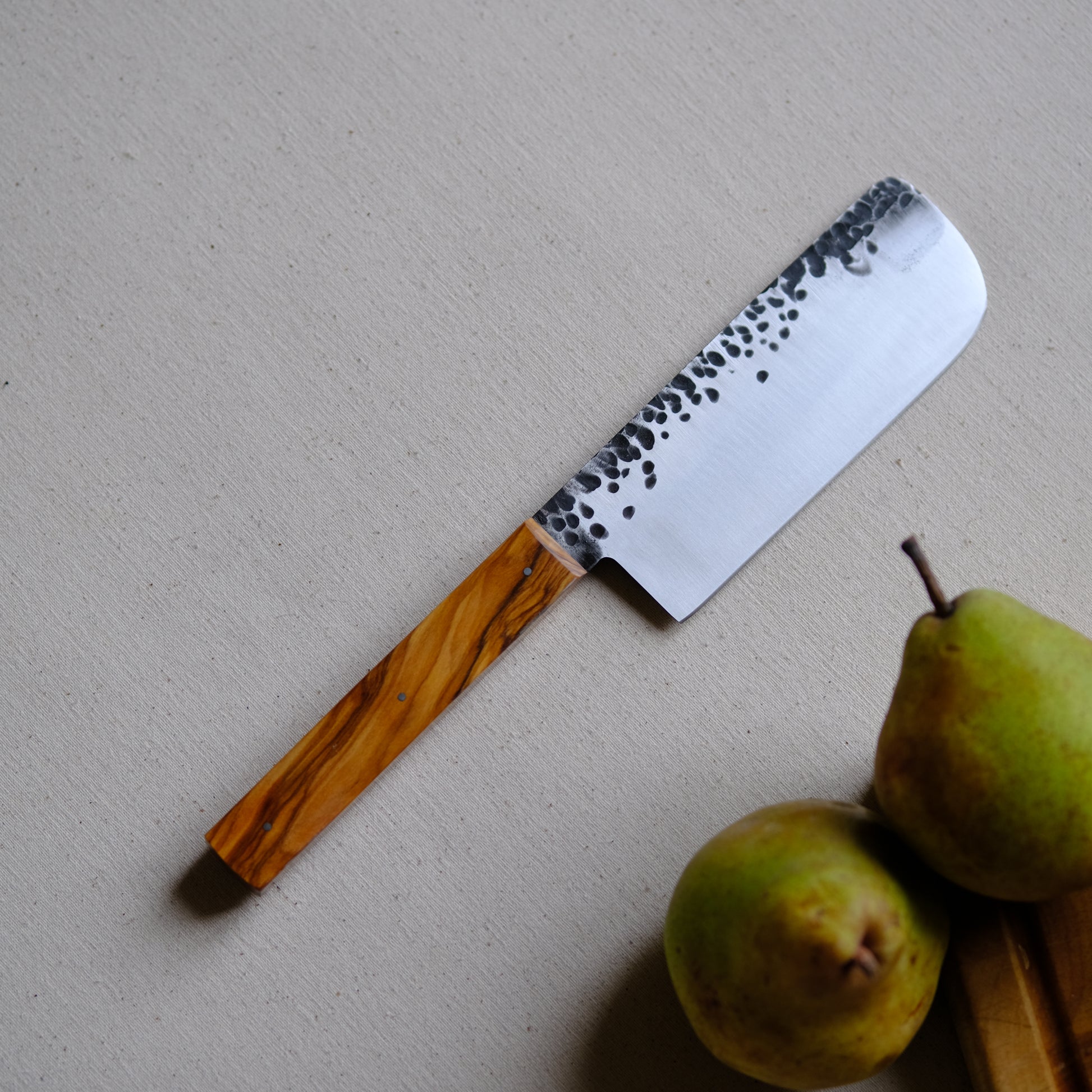 Chaque couteau de cuisine est réalisé entièrement à la main par mes soins dans mon atelier en Touraine (dessin, découpe & mise en forme de la lame, traitements thermiques, découpe et façonnage du manche, polissage, rivetage)