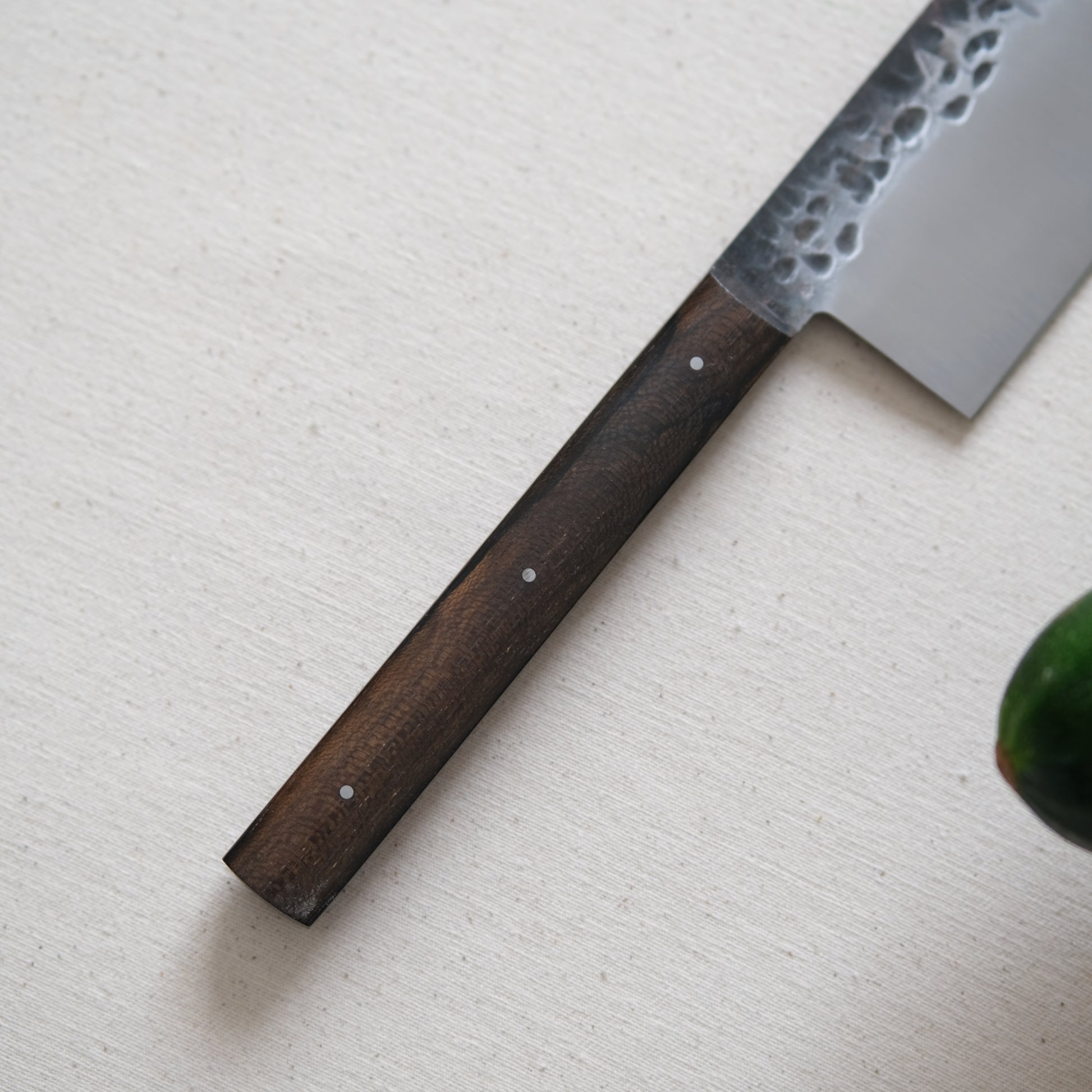 Chaque couteau de cuisine est réalisé entièrement à la main par mes soins dans mon atelier en Touraine (dessin, découpe & mise en forme de la lame, traitements thermiques, découpe et façonnage du manche, polissage, rivetage)