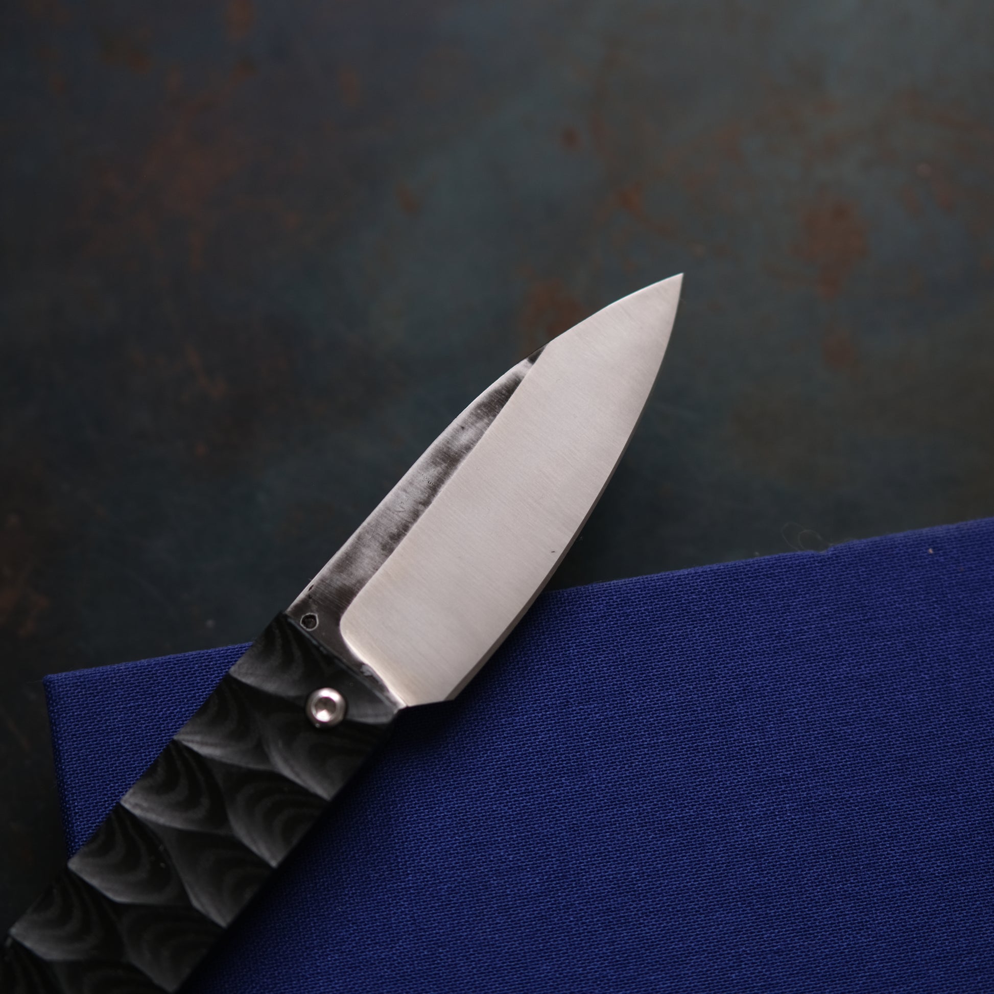 Le manche est en micarta lin ; un matériau composé de fibres de lin compressées. Le micarta est léger et très résistant. Il ne craint pas les rayures ni les impacts. Afin d'améliorer la prise en main du couteau, le manche est texturé.