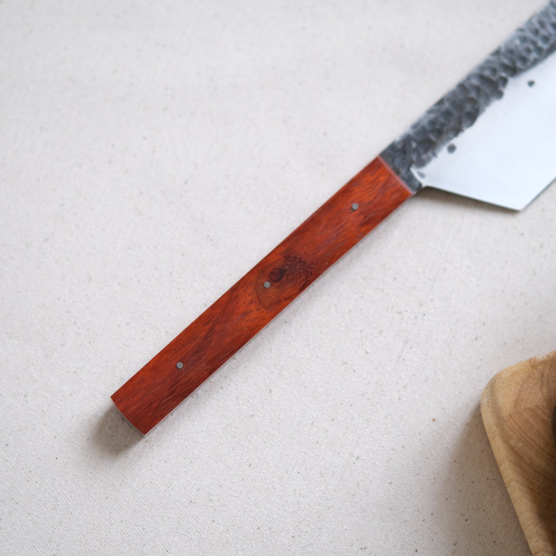 Chaque couteau de cuisine est réalisé entièrement à la main par mes soins dans mon atelier en Touraine (dessin, découpe & mise en forme de la lame, traitements thermiques, découpe et façonnage du manche, polissage, rivetage)