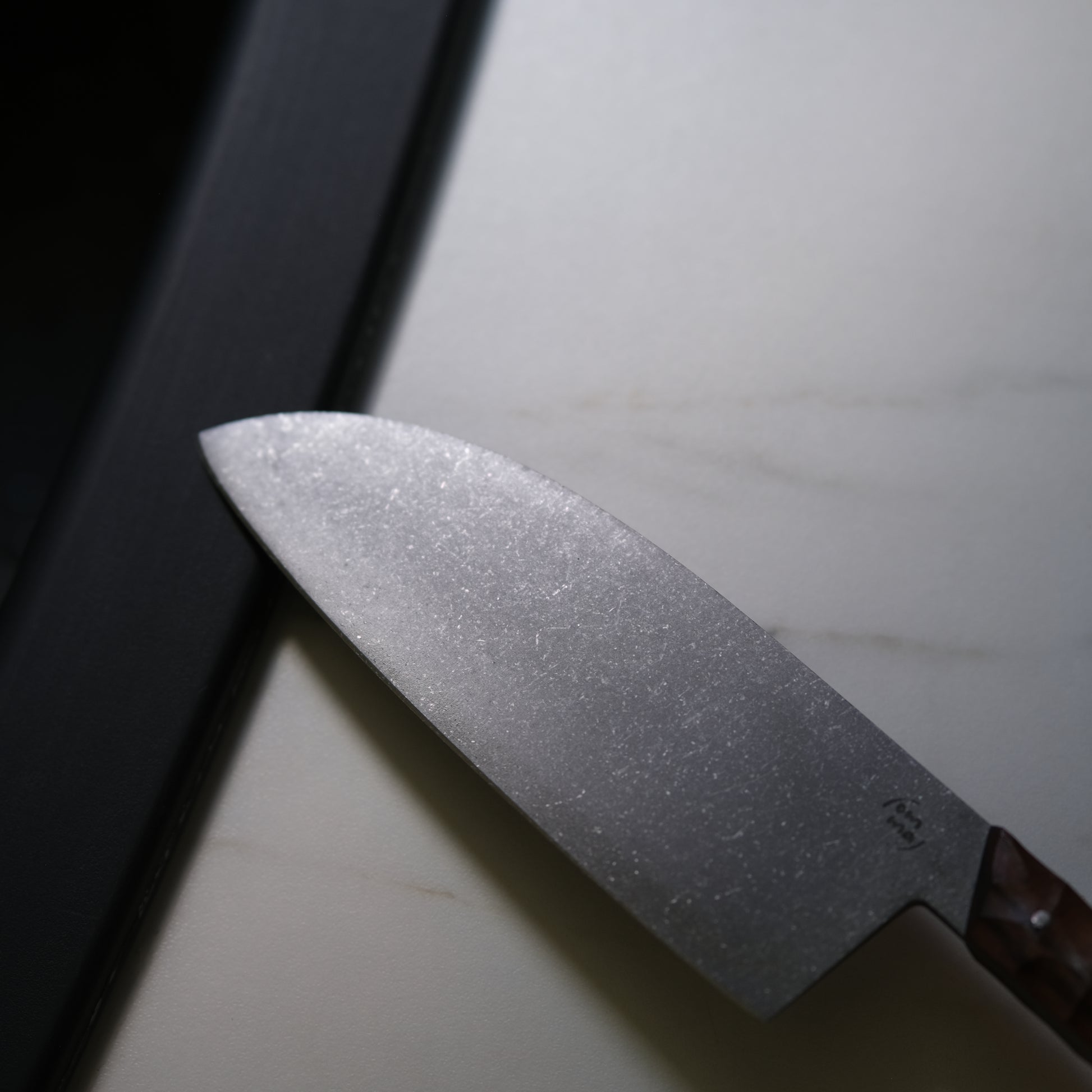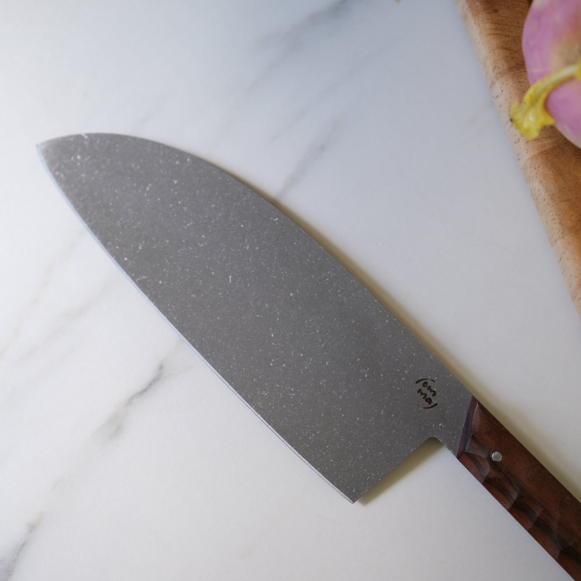 NALMADA est un couteau de cuisine polyvalent et généraliste inspiré du santoku japonais. Il est particulièrement adapté à la cuisine du quotidien : découper des légumes, du poisson ou de la viande, trancher, émincer, hacher des aliments, écraser de l'ail avec le plat de la lame, ciseler des herbes ou des échalotes.