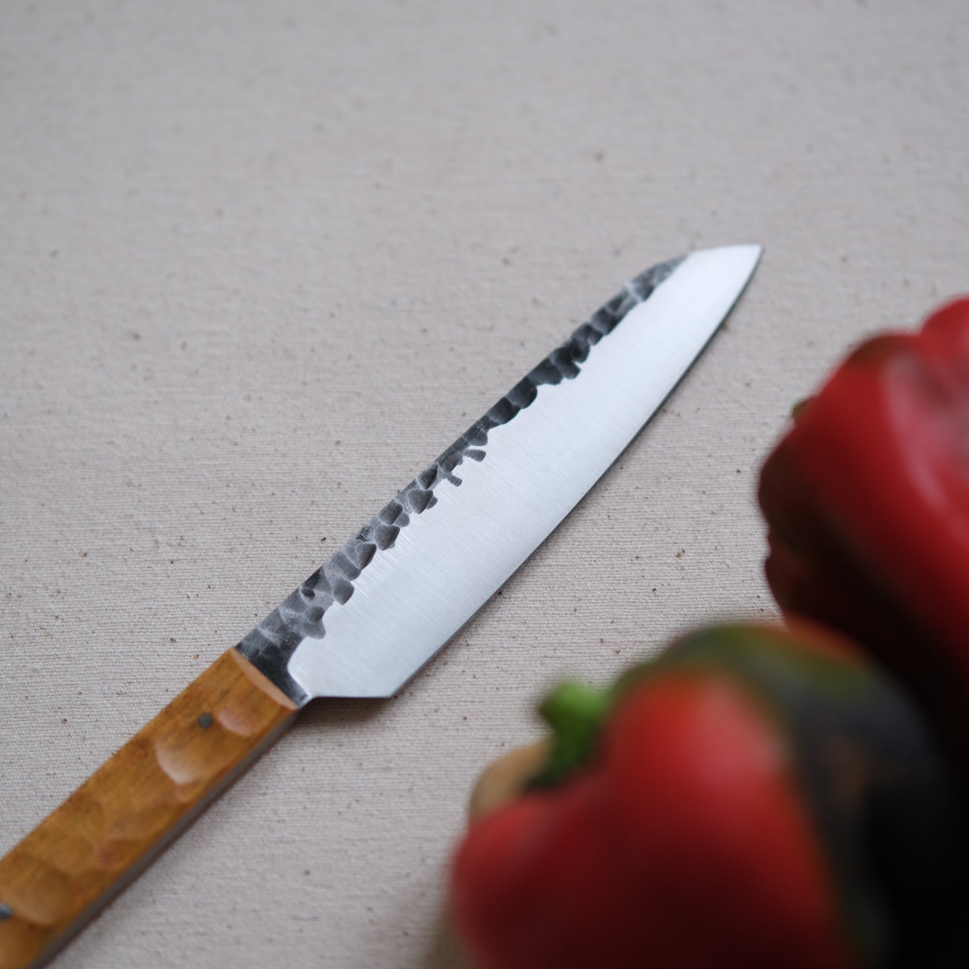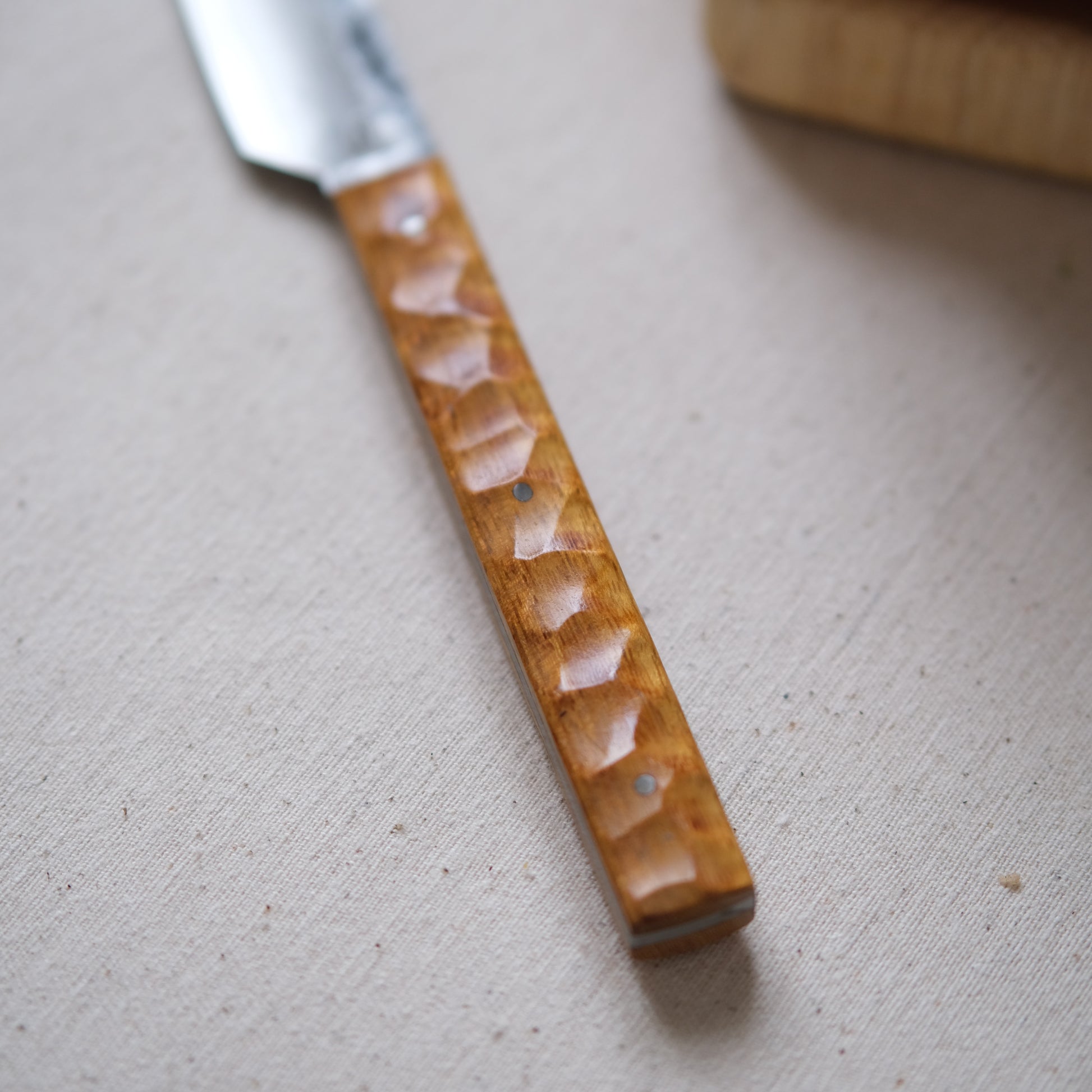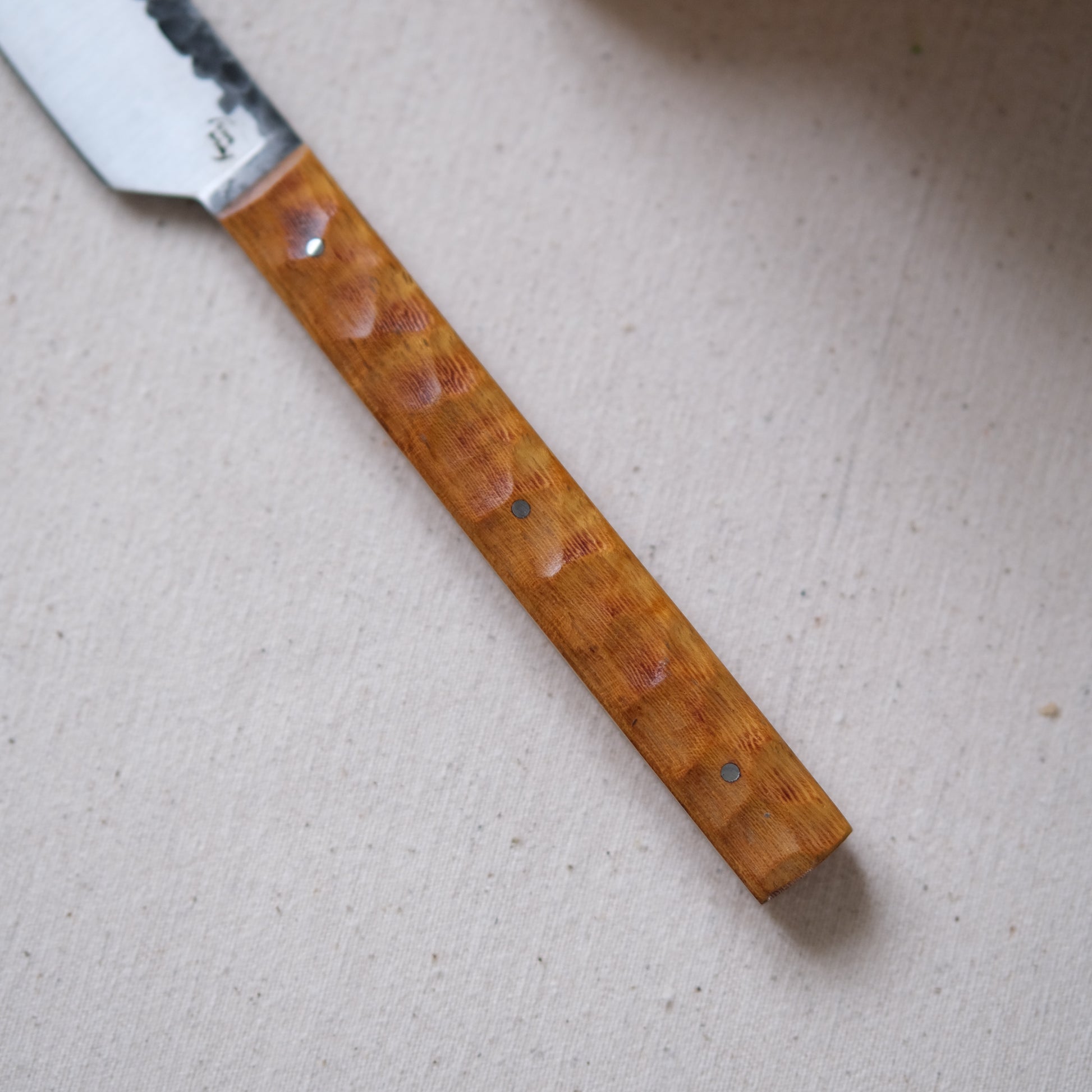 Chaque couteau de cuisine est réalisé entièrement à la main par mes soins dans mon atelier en Touraine (dessin, découpe & mise en forme de la lame, traitements thermiques, découpe et façonnage du manche, polissage, rivetage)