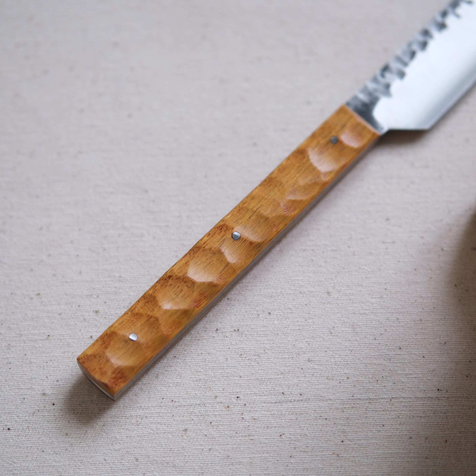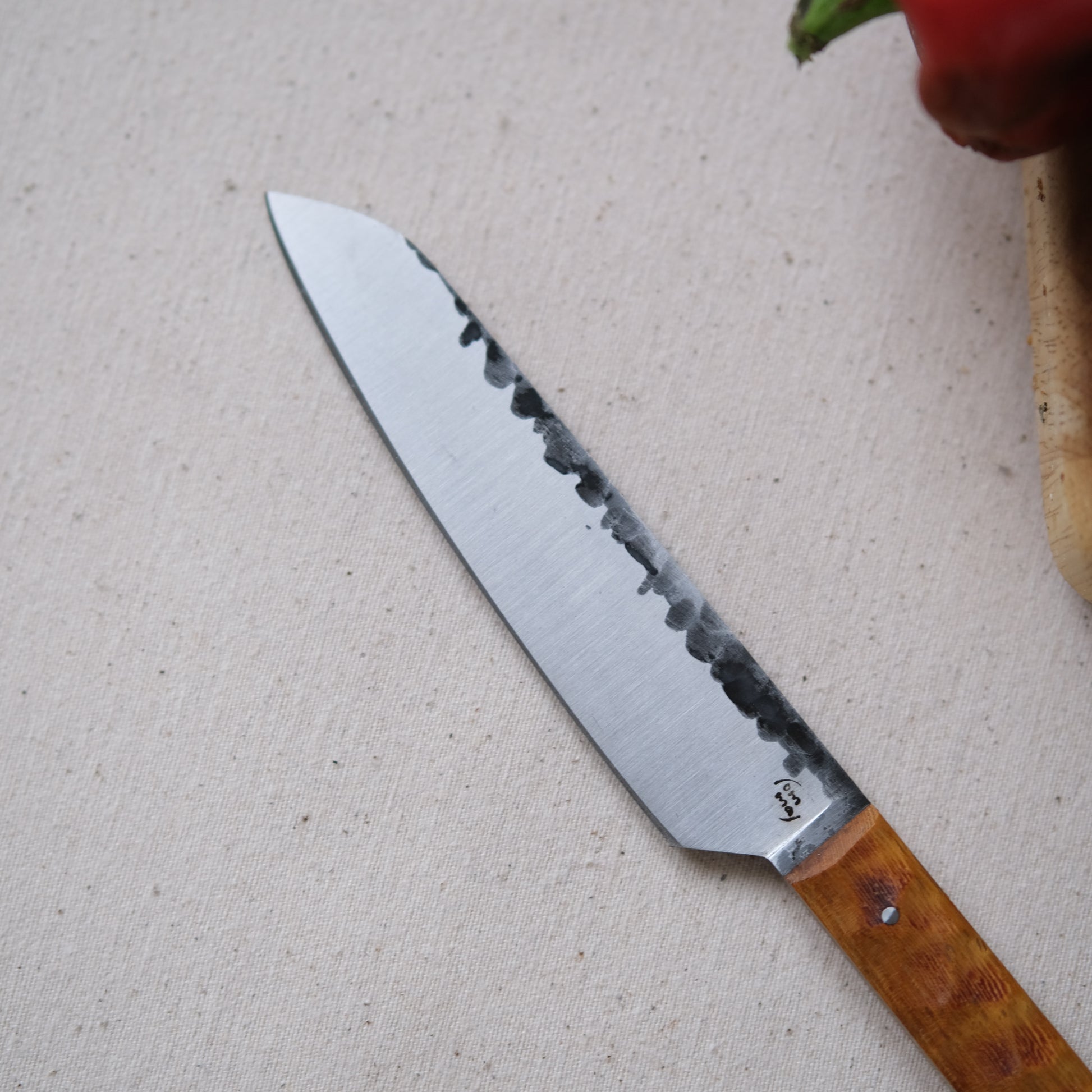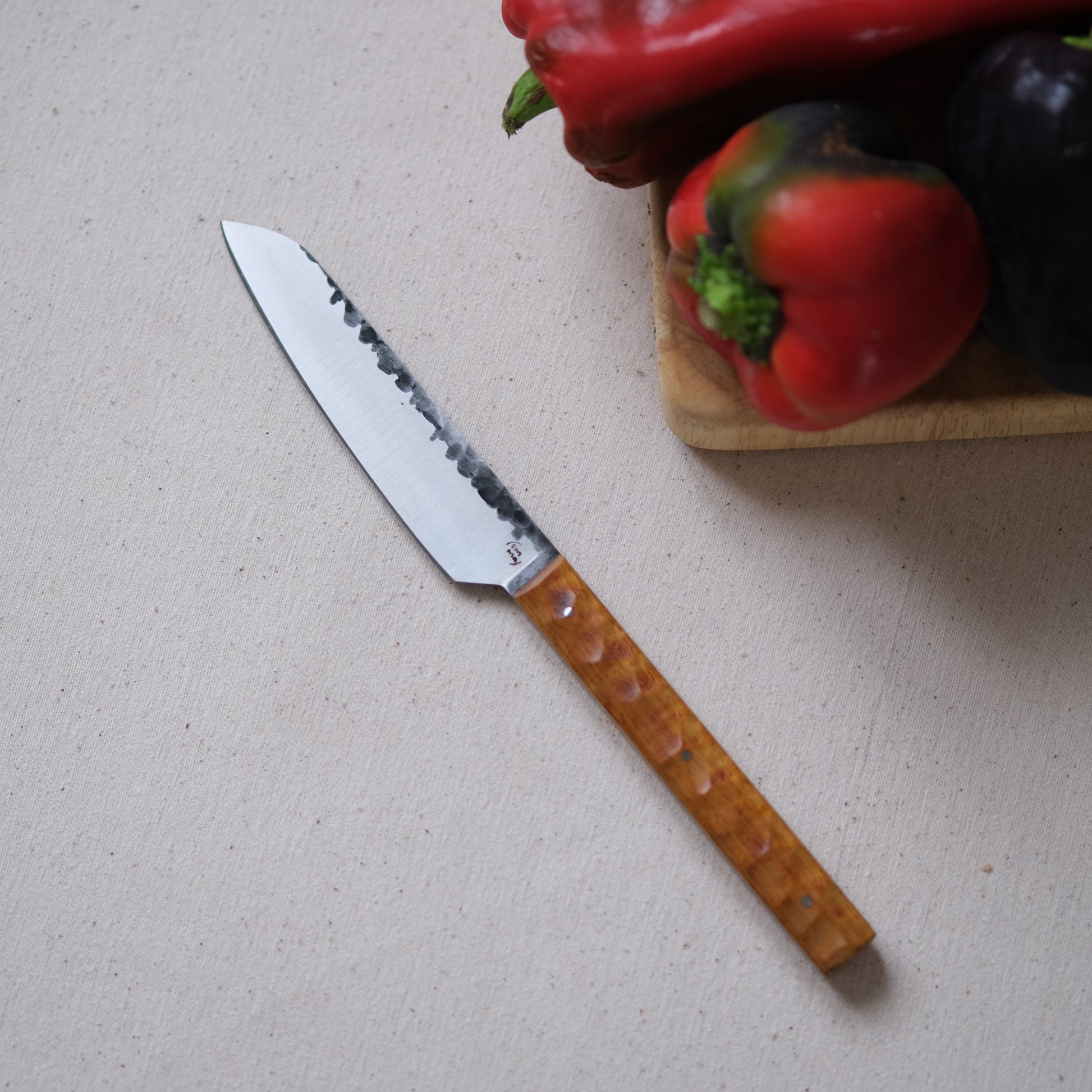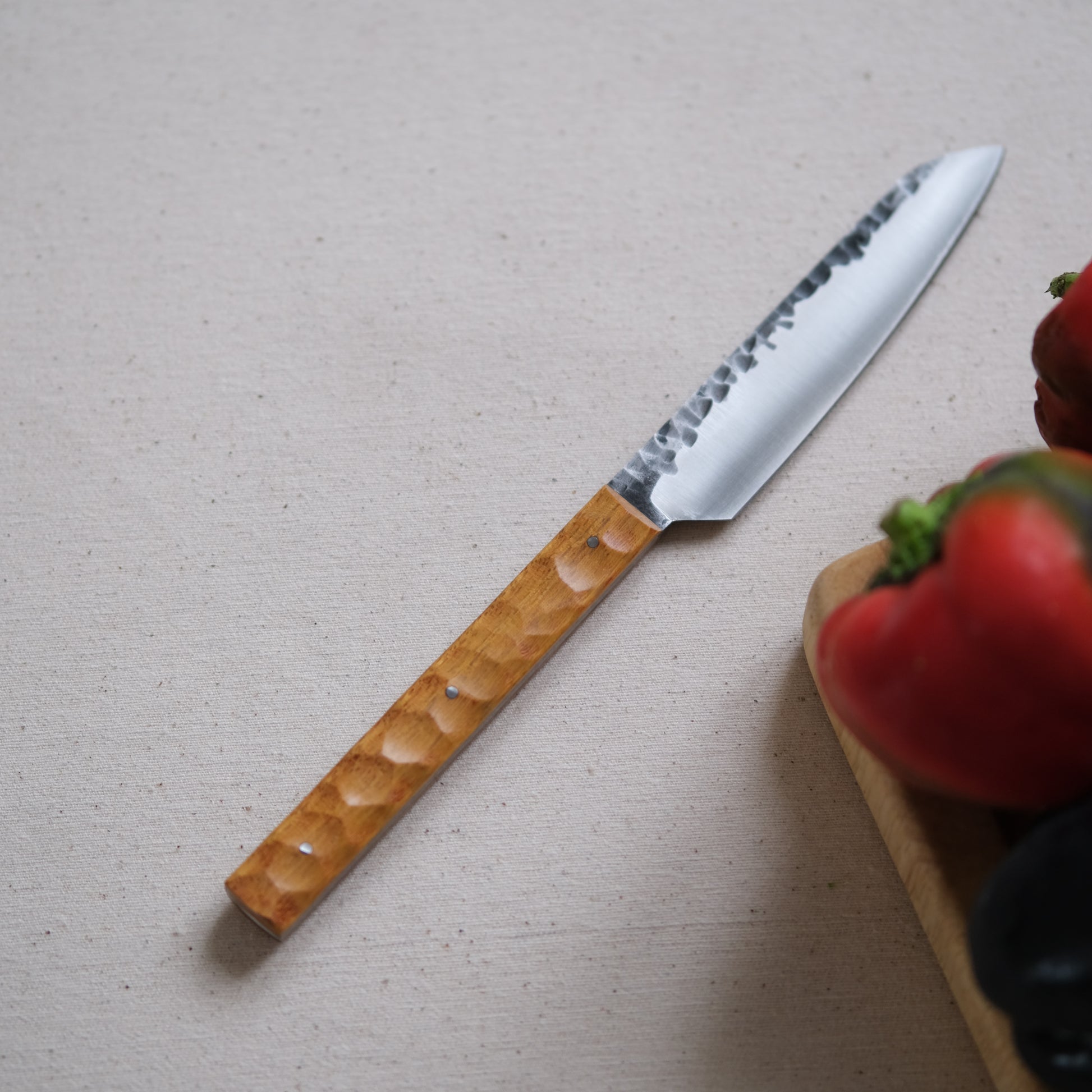 Chaque couteau de cuisine est réalisé entièrement à la main par mes soins dans mon atelier en Touraine (dessin, découpe & mise en forme de la lame, traitements thermiques, découpe et façonnage du manche, polissage, rivetage)