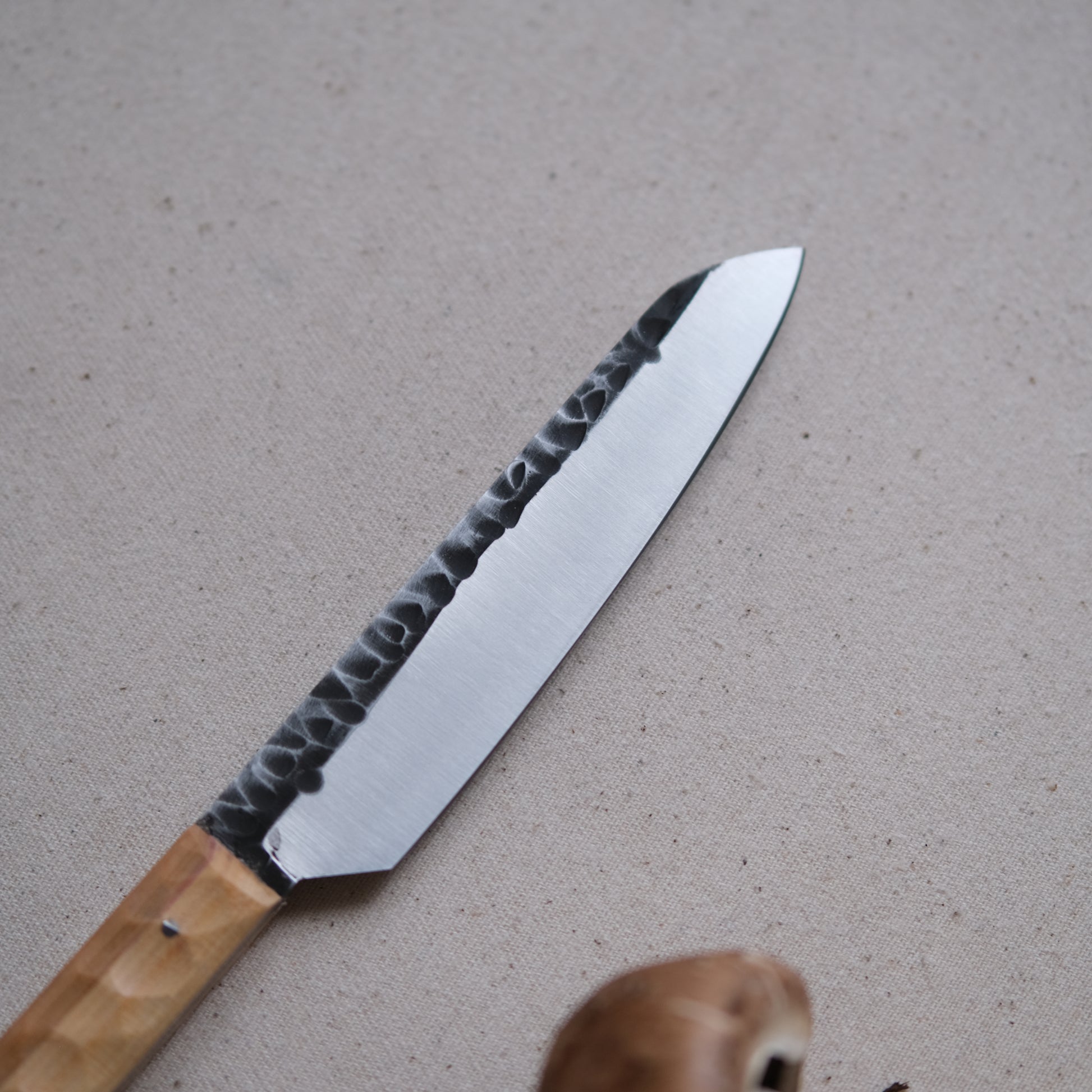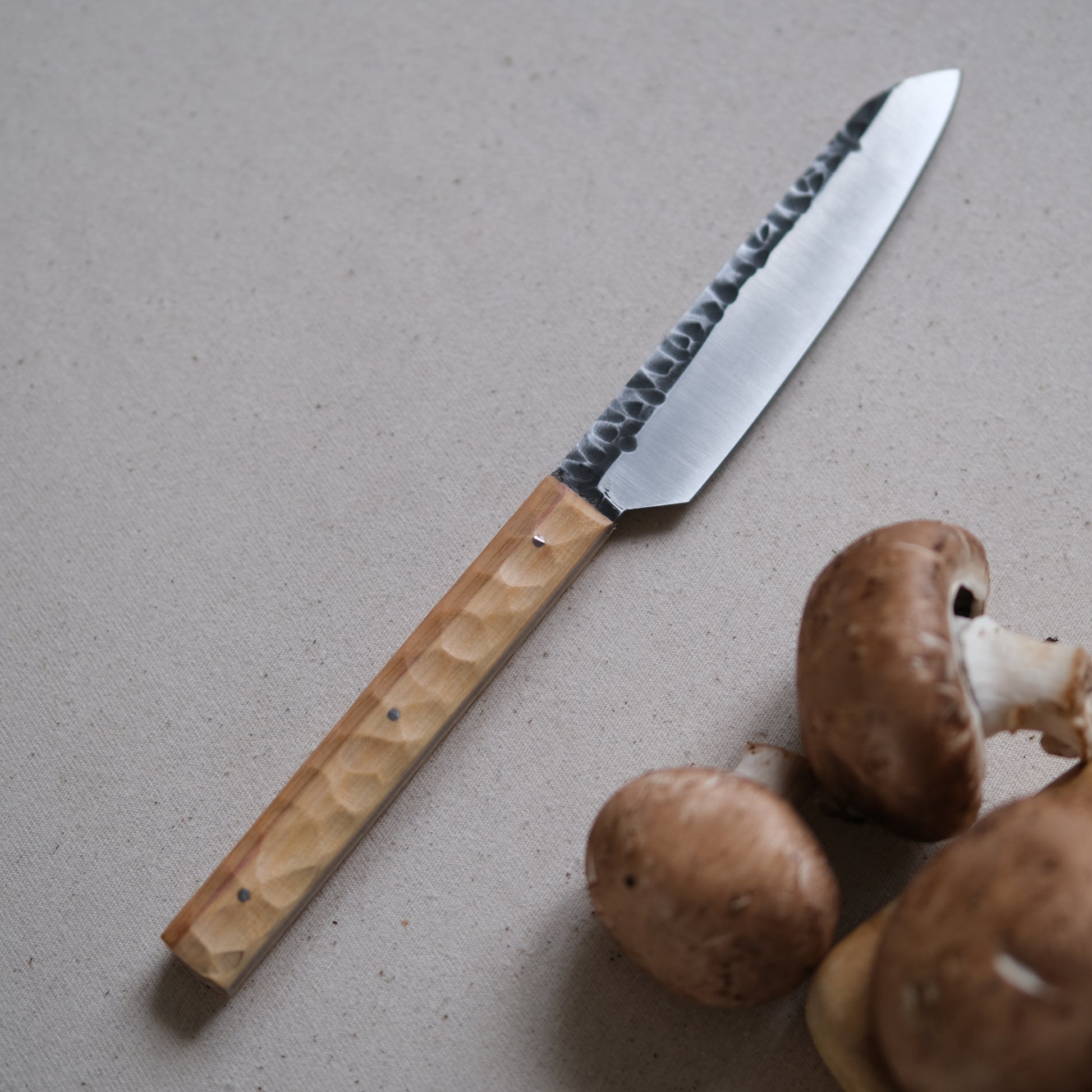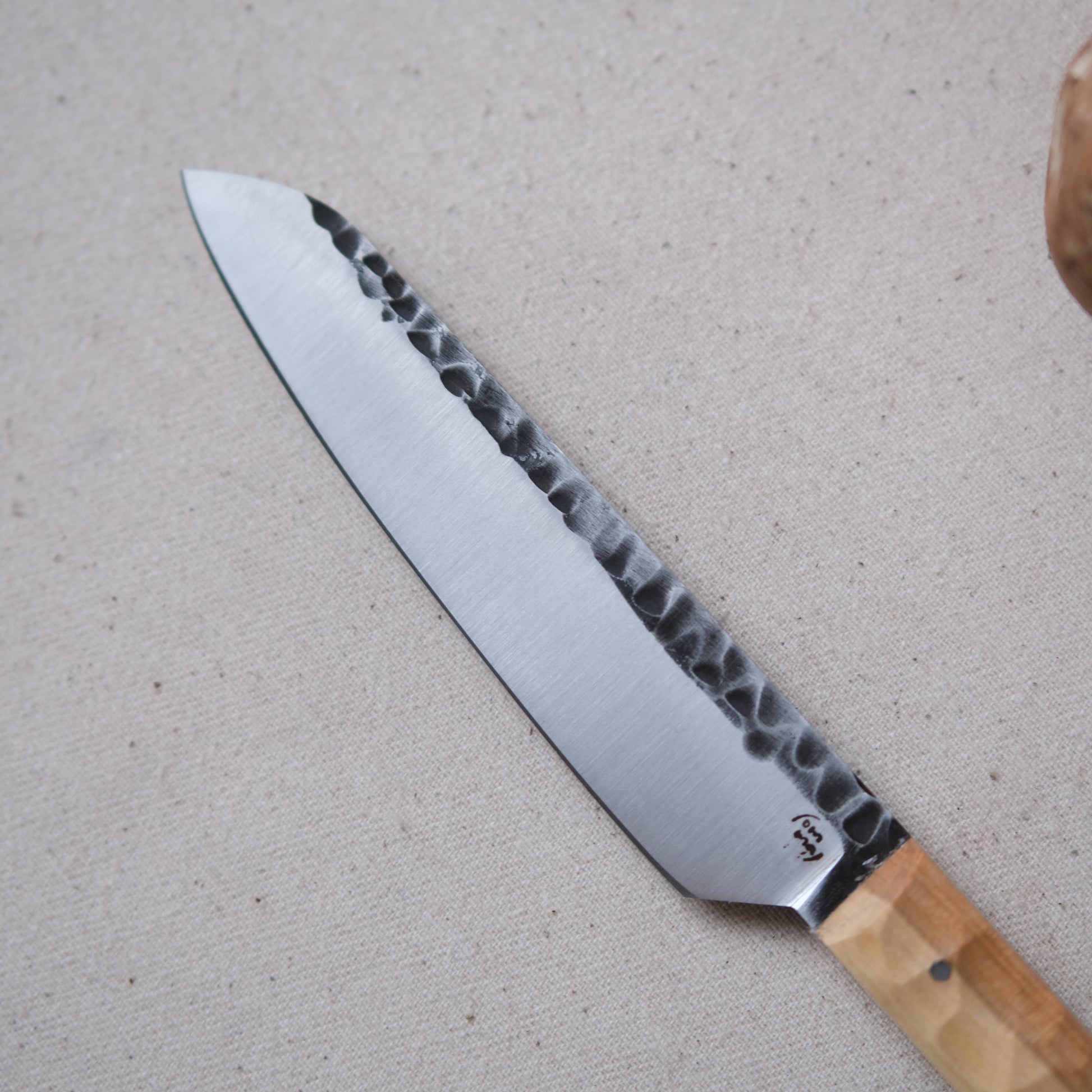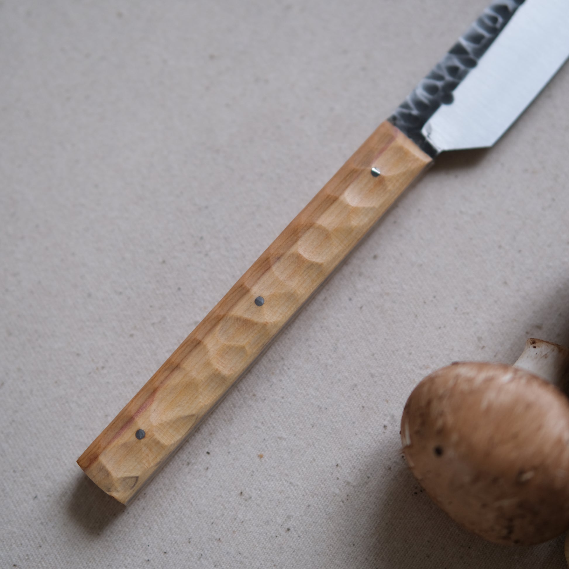 Chaque couteau de cuisine est réalisé entièrement à la main par mes soins dans mon atelier en Touraine (dessin, découpe & mise en forme de la lame, traitements thermiques, découpe et façonnage du manche, polissage, rivetage)