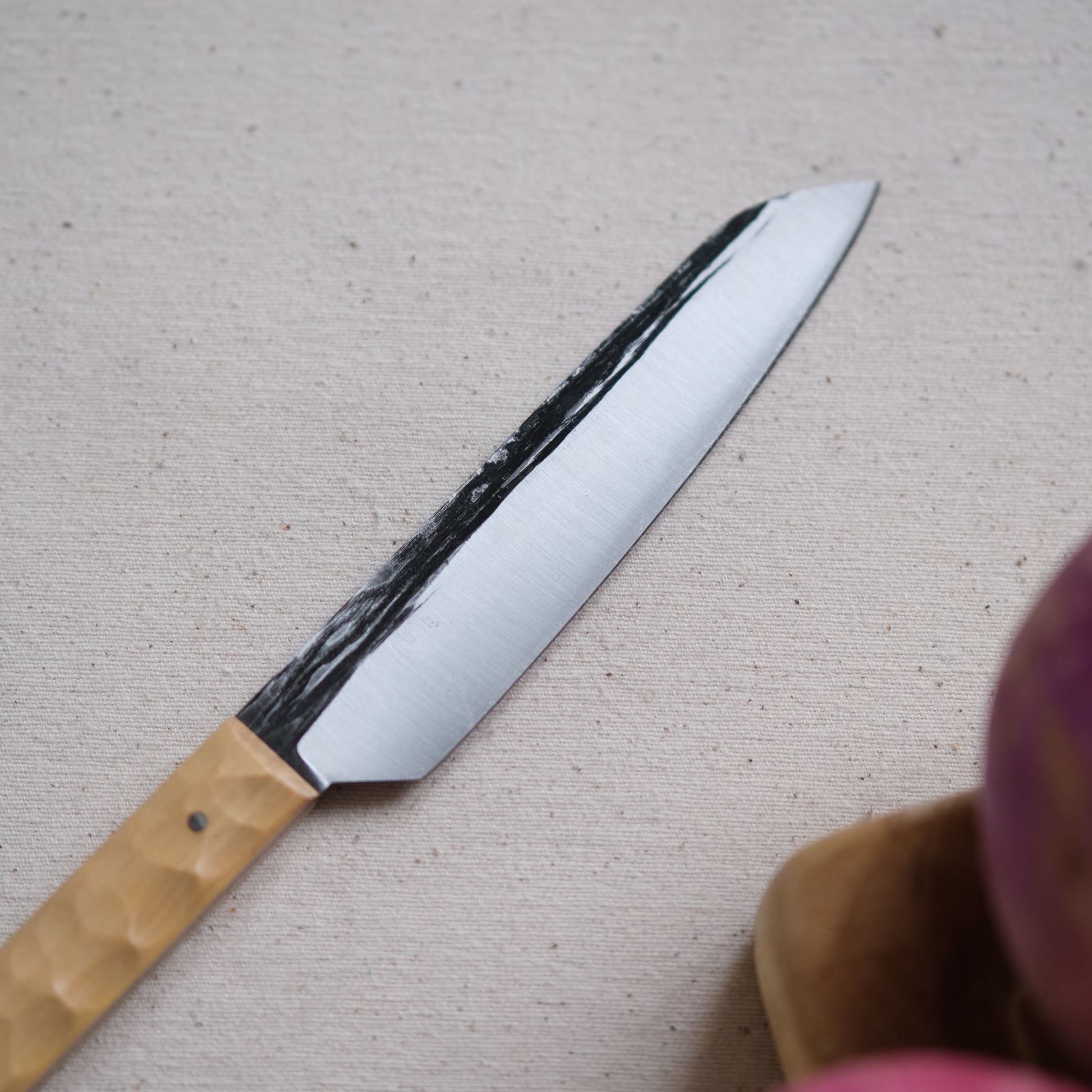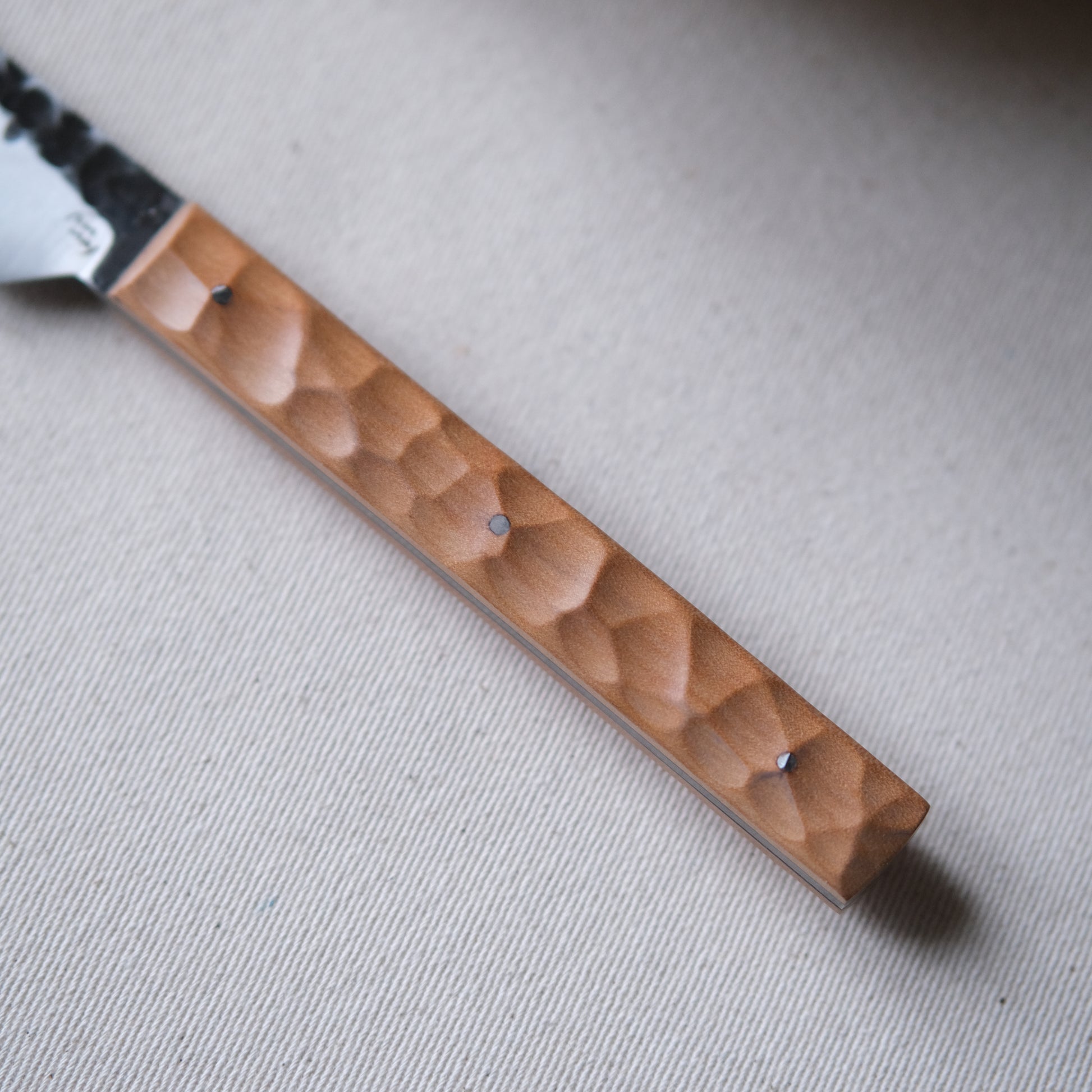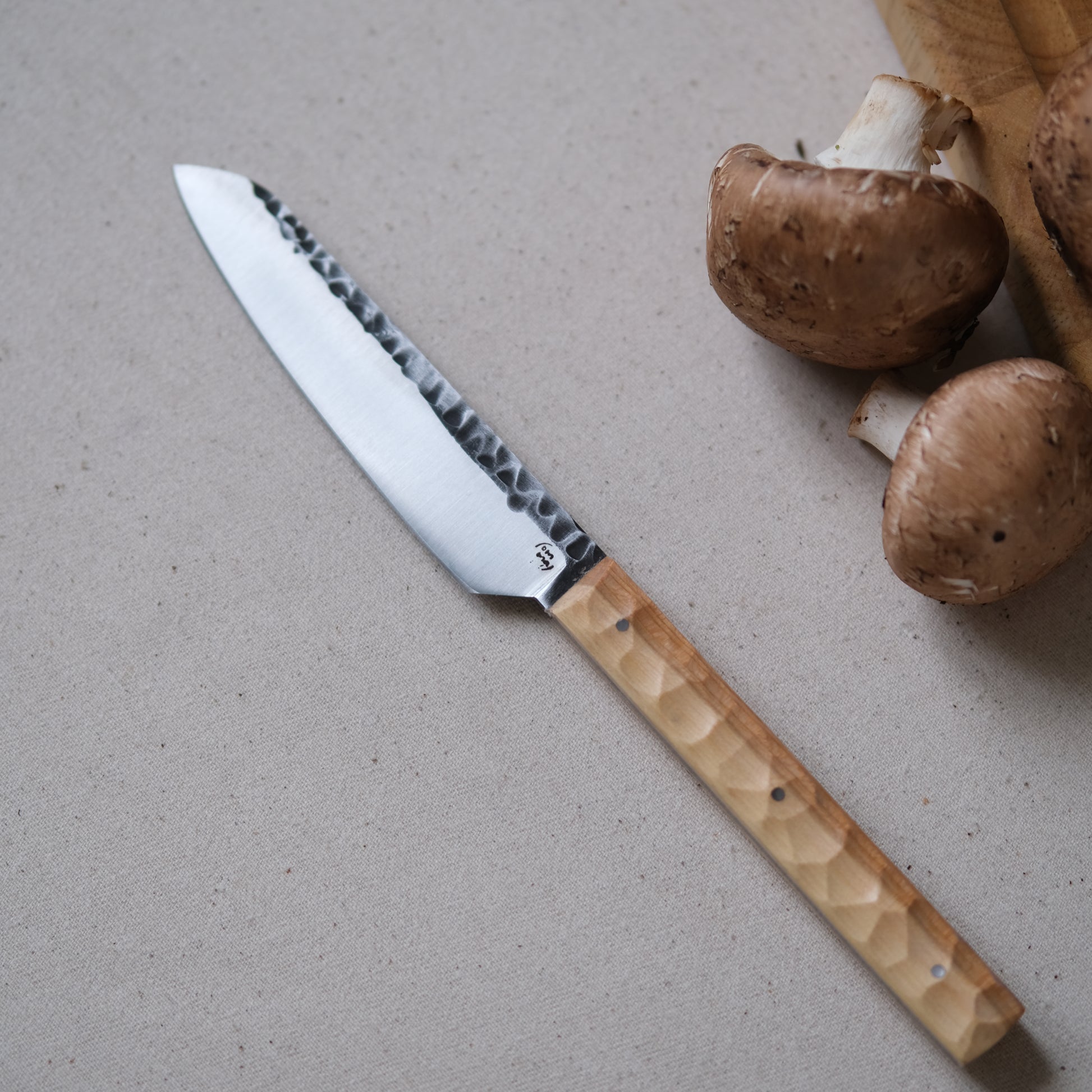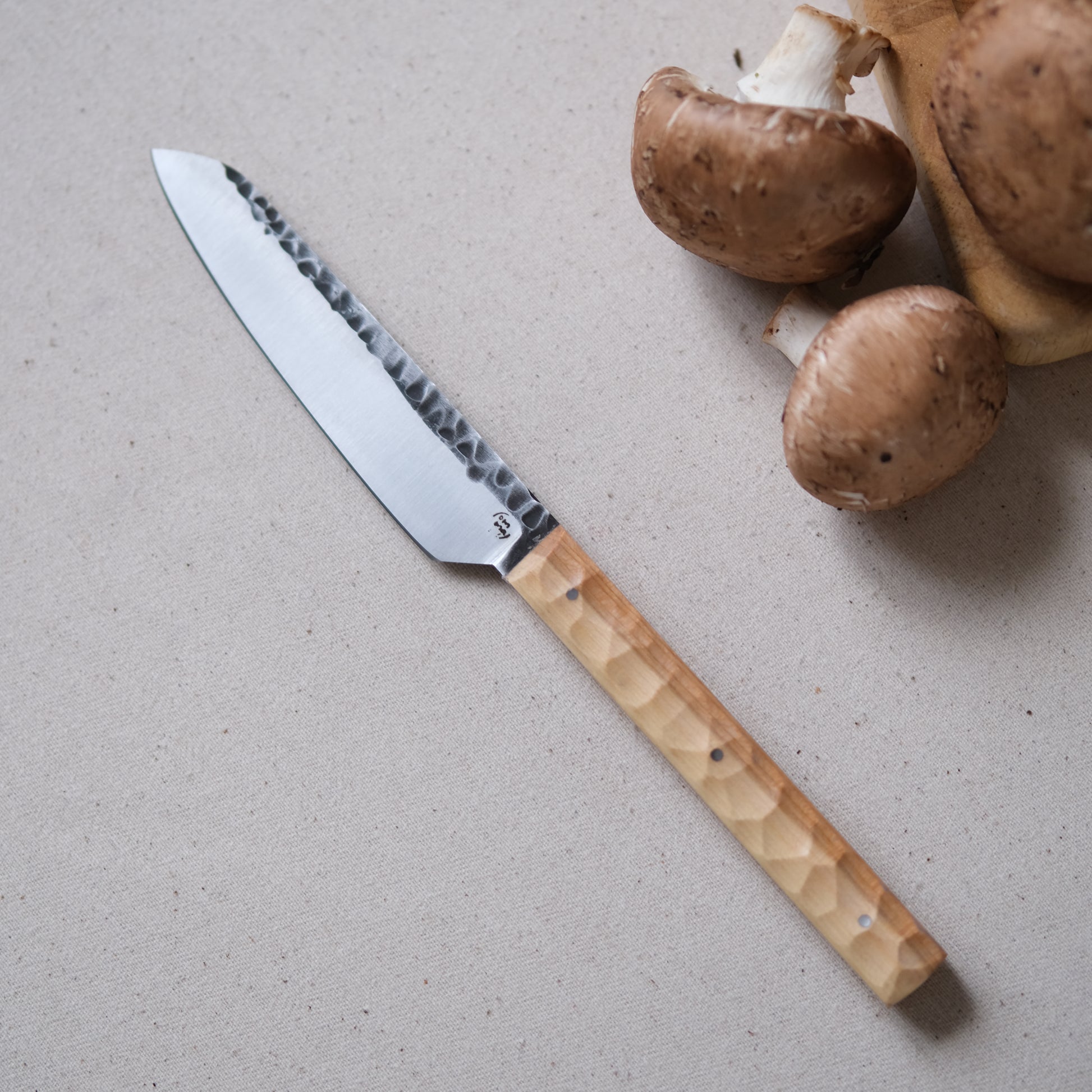 Chaque couteau de cuisine est réalisé entièrement à la main par mes soins dans mon atelier en Touraine (dessin, découpe & mise en forme de la lame, traitements thermiques, découpe et façonnage du manche, polissage, rivetage)