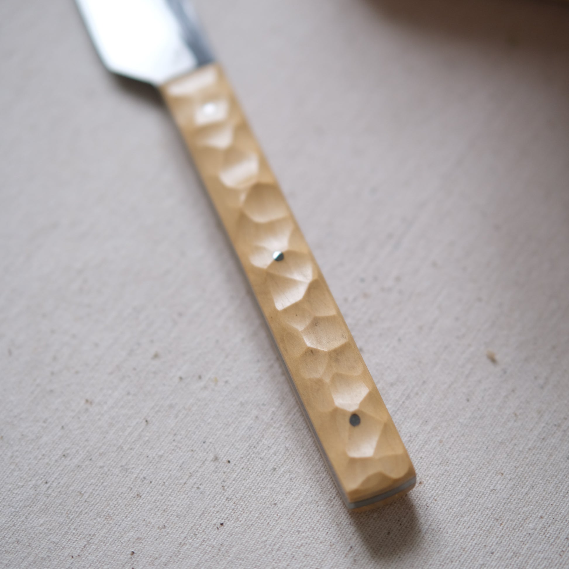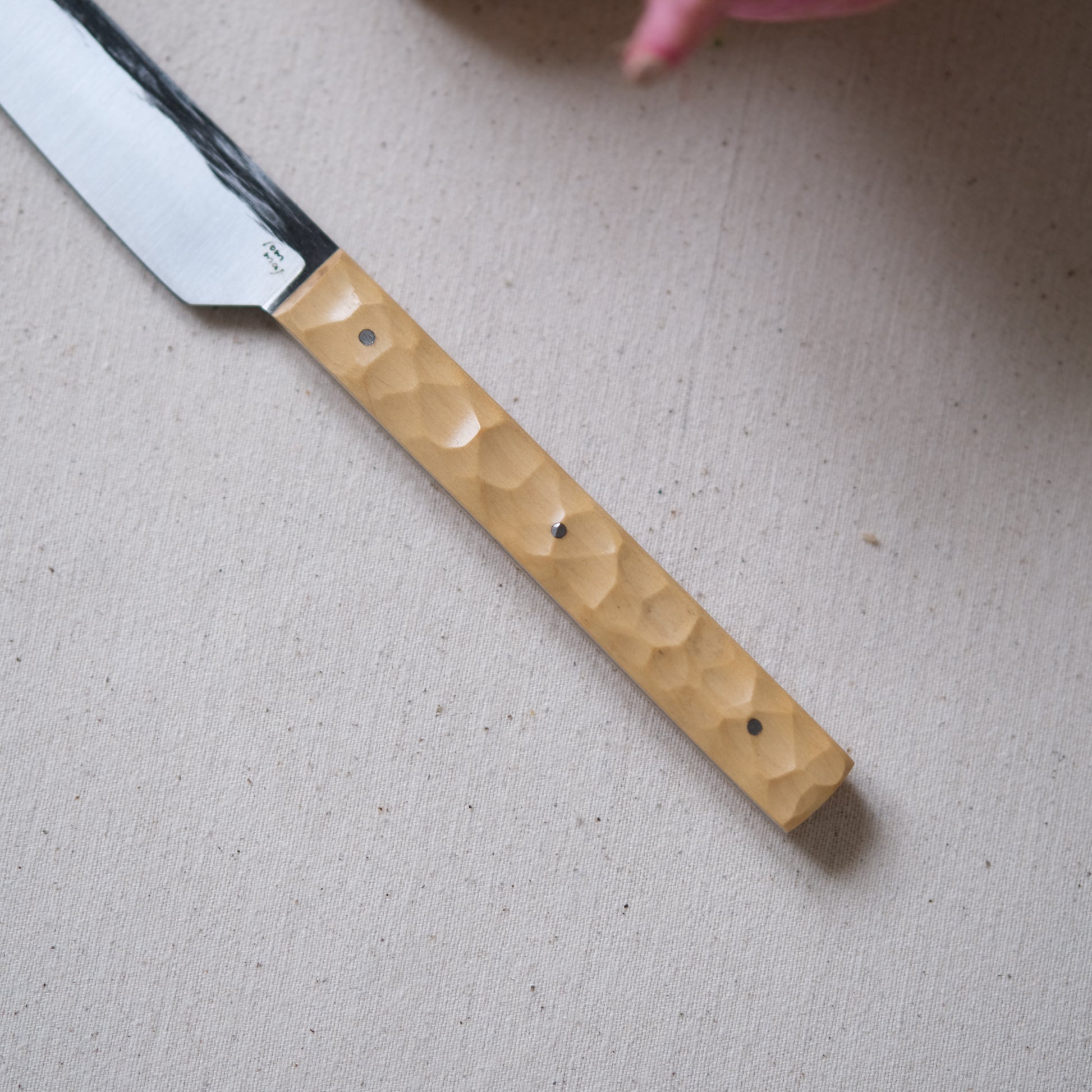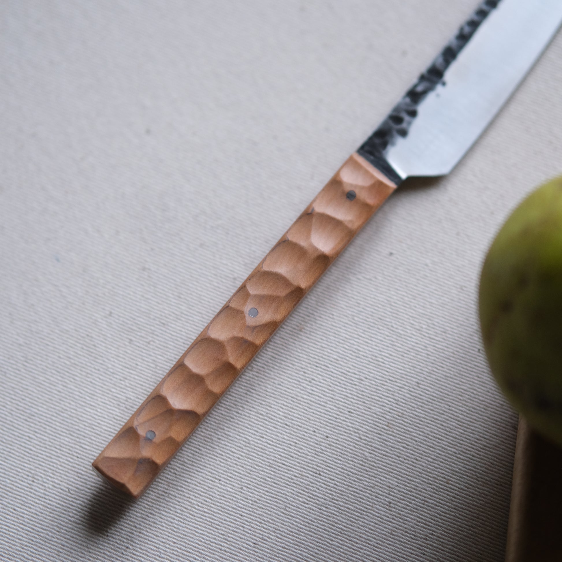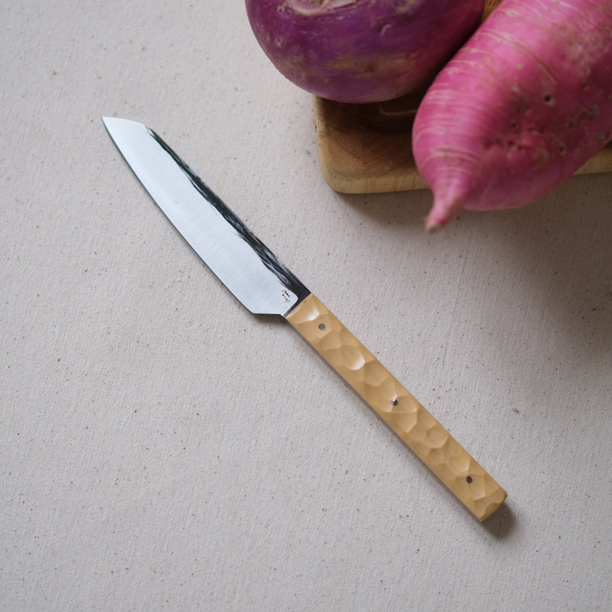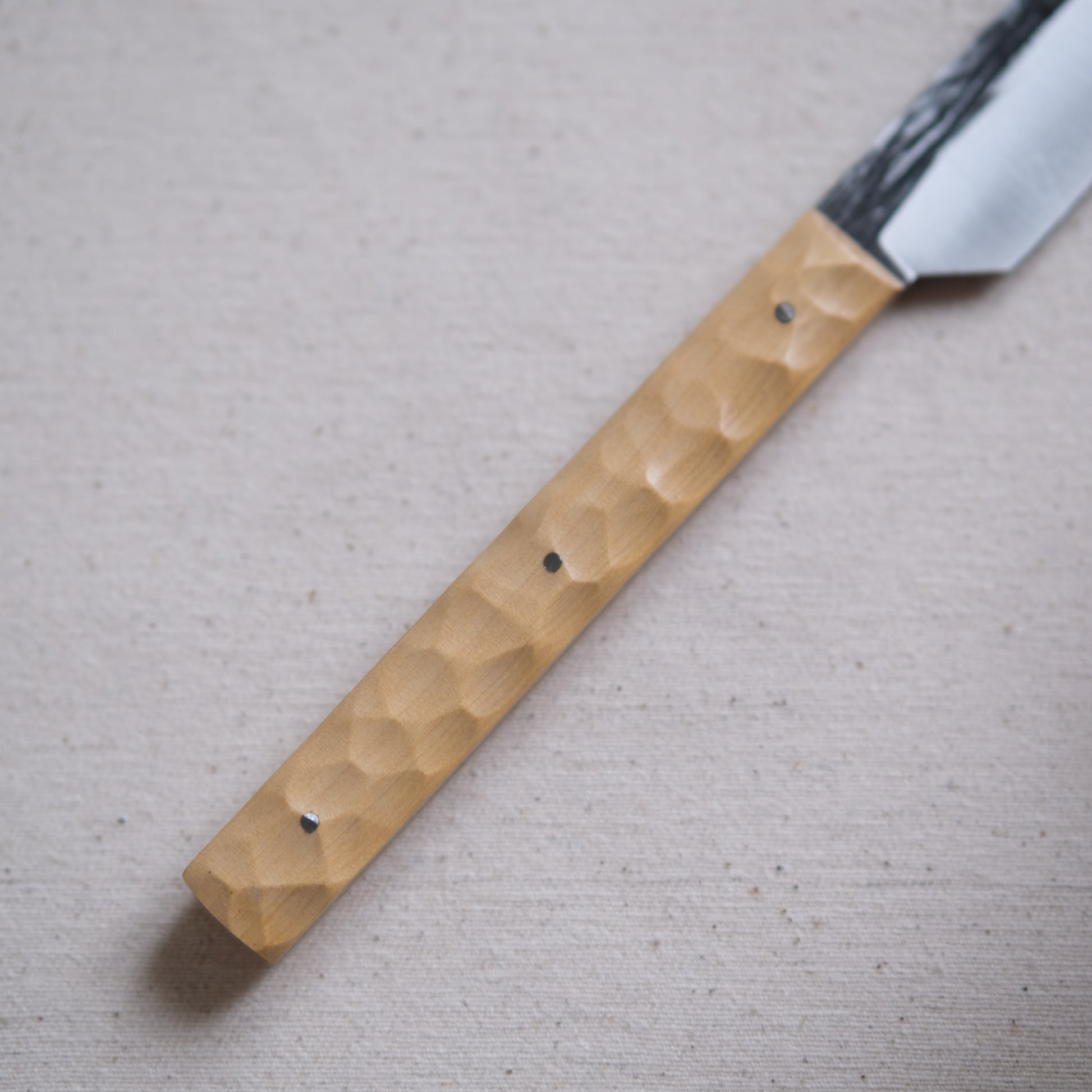Chaque couteau de cuisine est réalisé entièrement à la main par mes soins dans mon atelier en Touraine (dessin, découpe & mise en forme de la lame, traitements thermiques, découpe et façonnage du manche, polissage, rivetage)