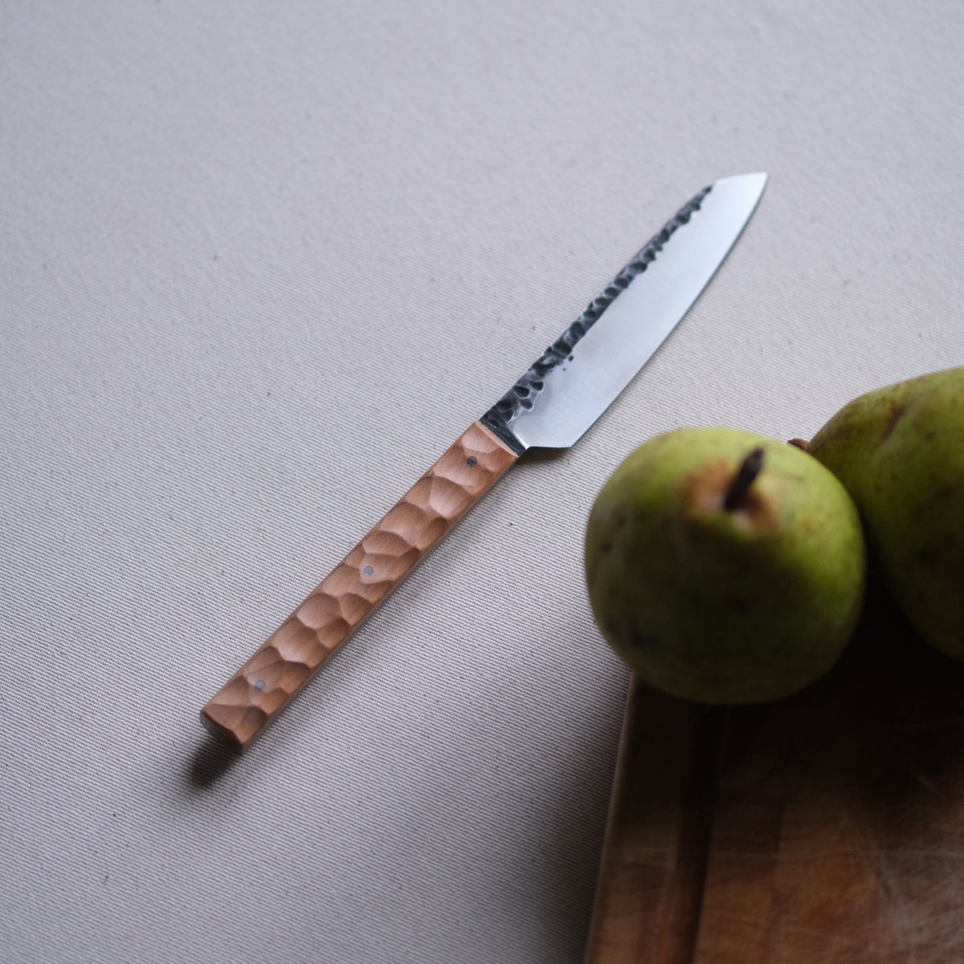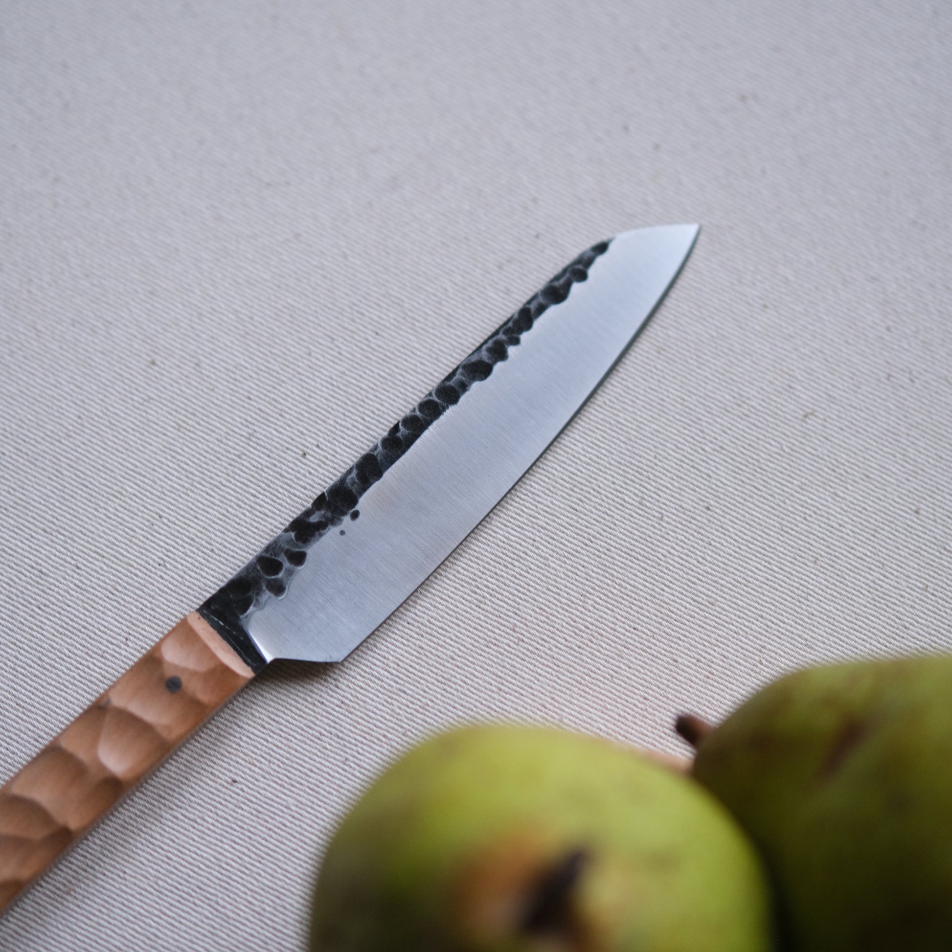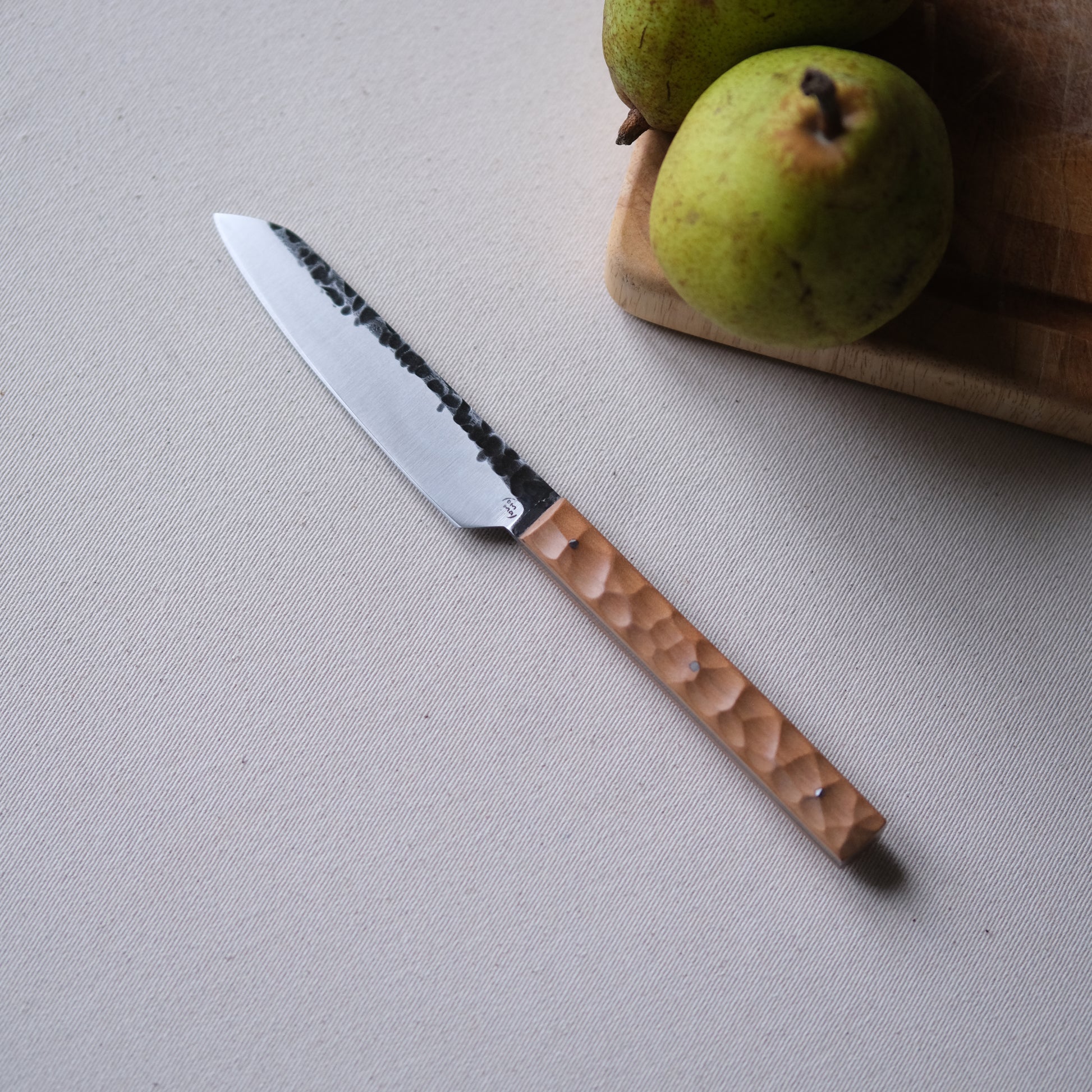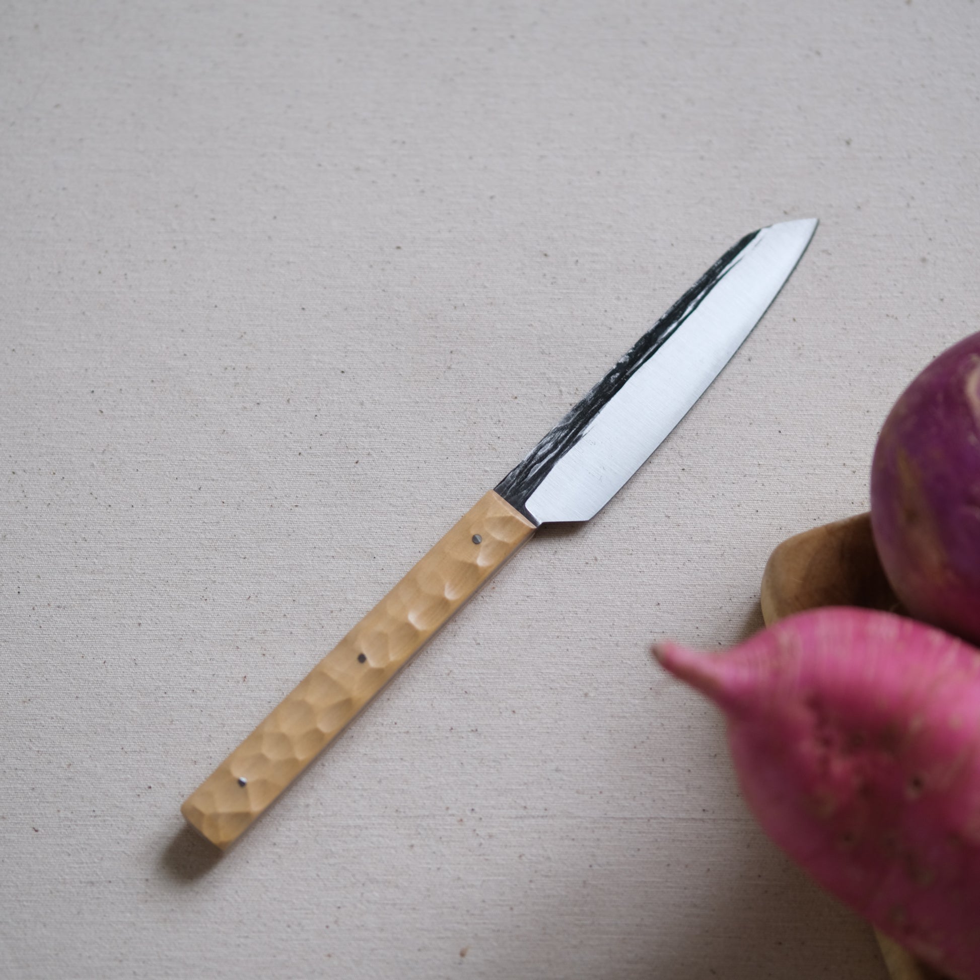 Chaque couteau de cuisine est réalisé entièrement à la main par mes soins dans mon atelier en Touraine (dessin, découpe & mise en forme de la lame, traitements thermiques, découpe et façonnage du manche, polissage, rivetage)