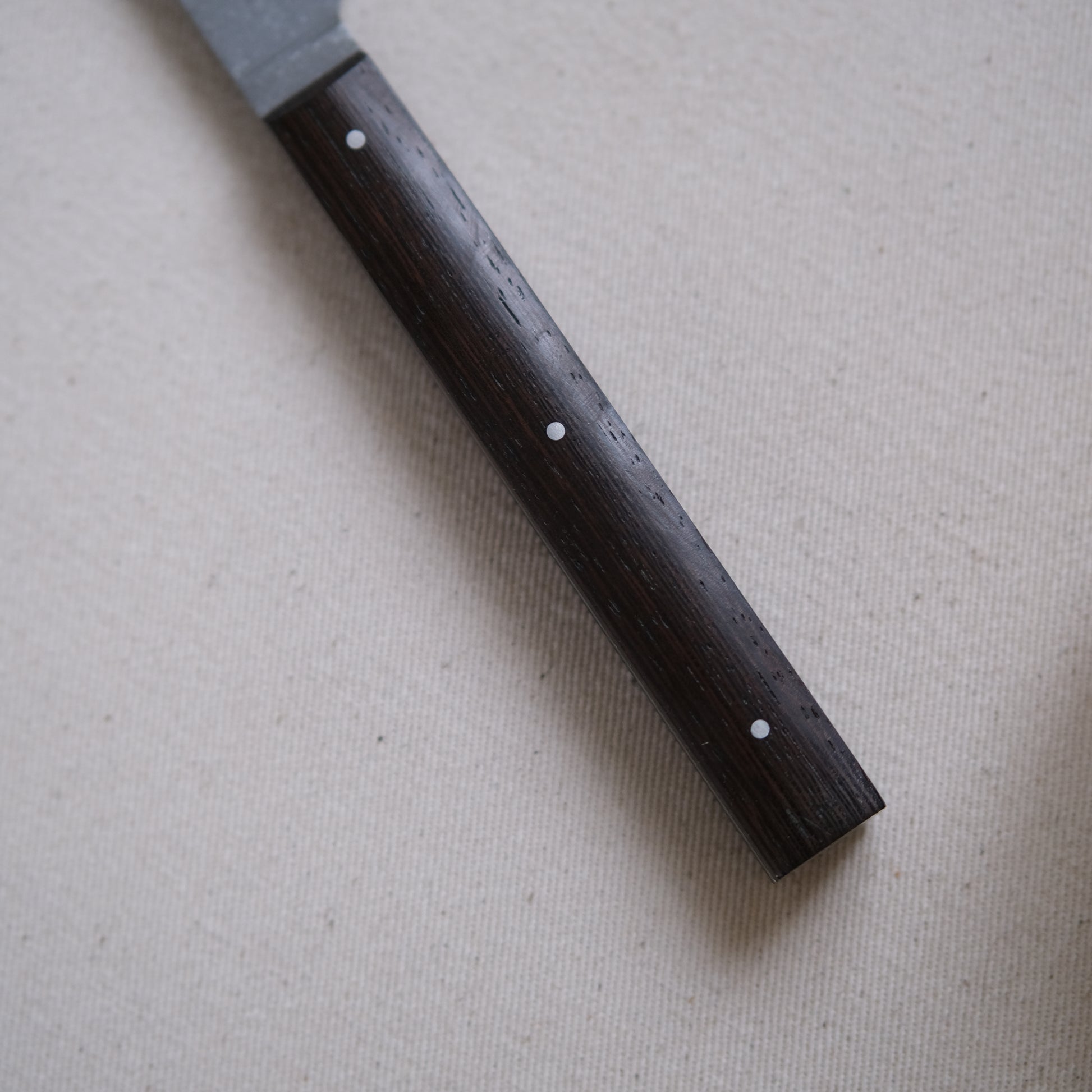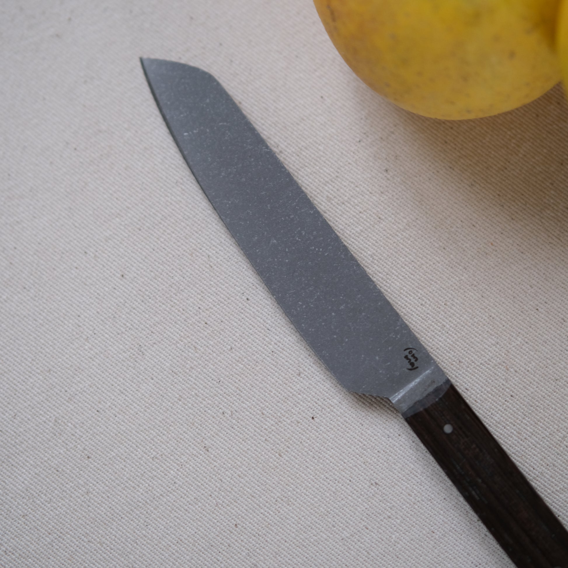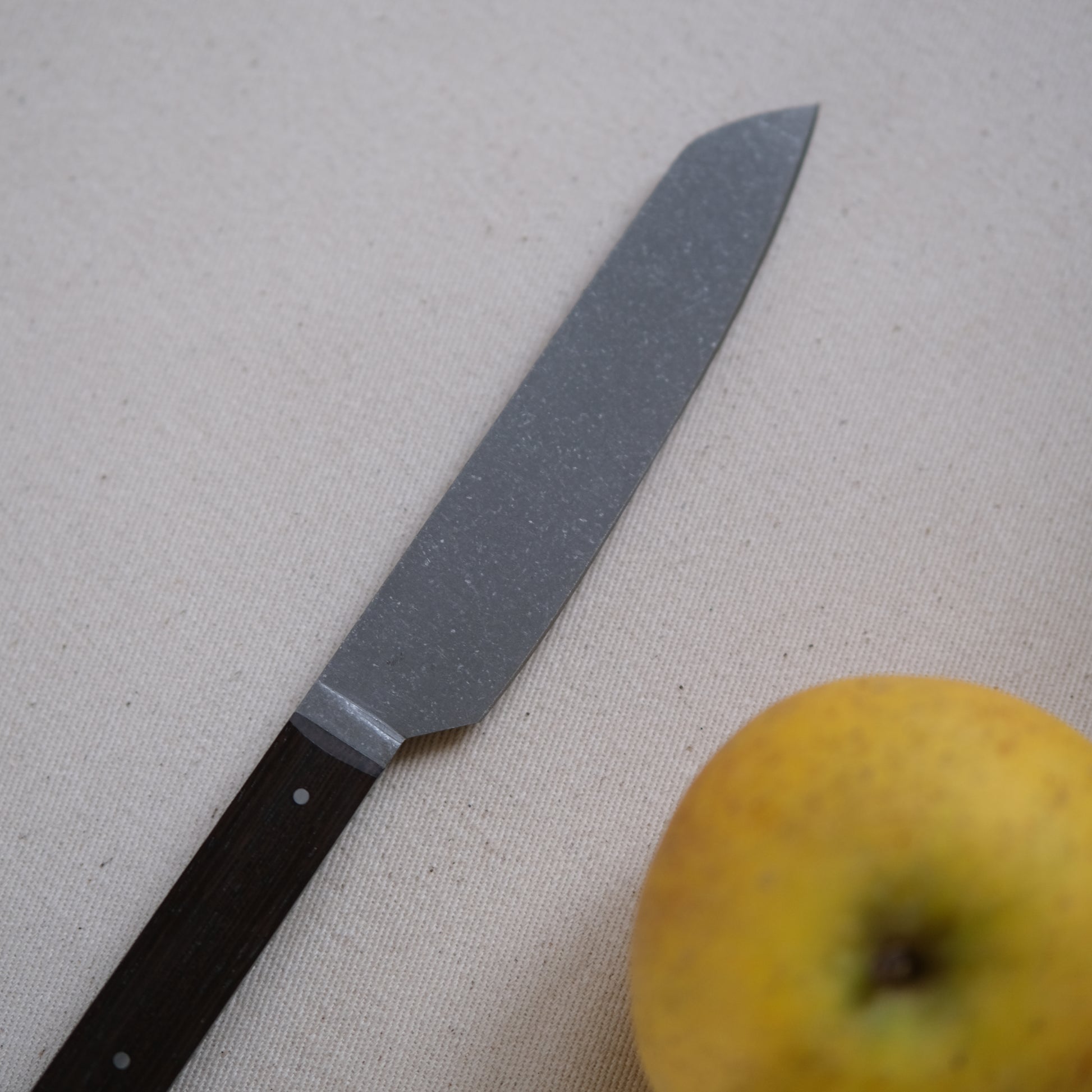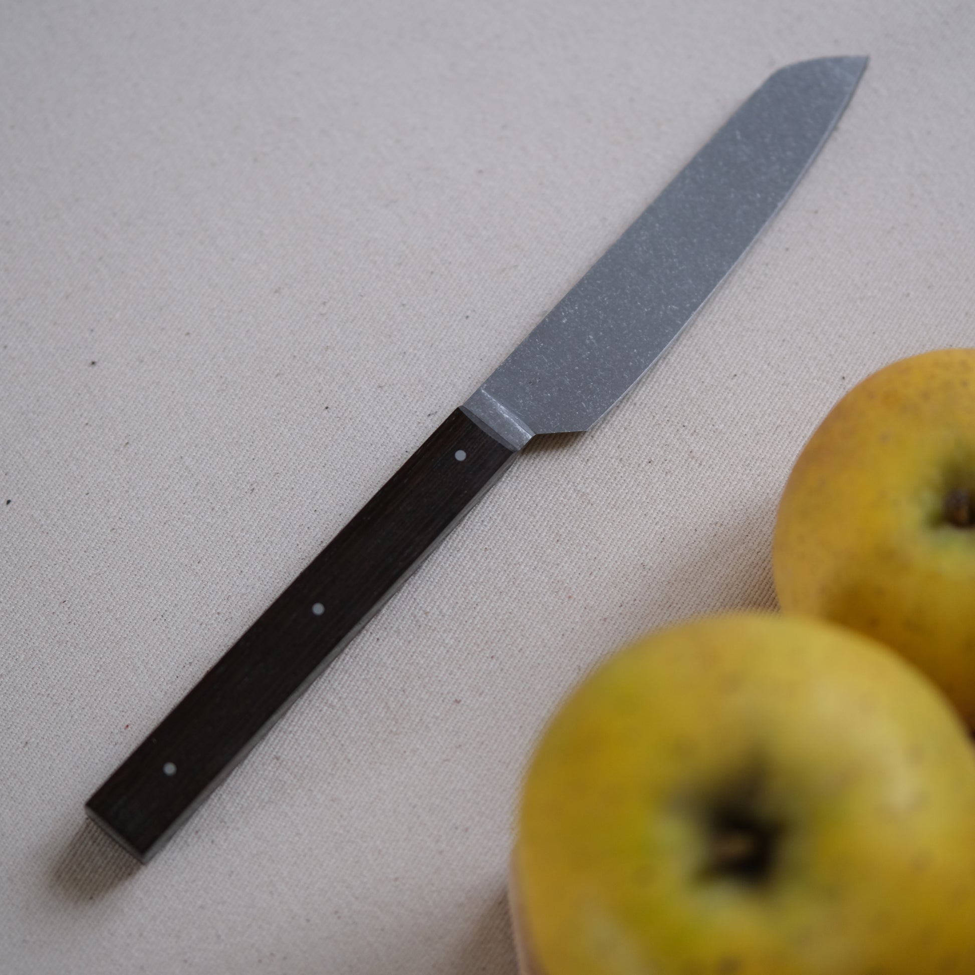 Chaque couteau de cuisine est réalisé entièrement à la main par mes soins dans mon atelier en Touraine (dessin, découpe & mise en forme de la lame, traitements thermiques, découpe et façonnage du manche, polissage, rivetage)