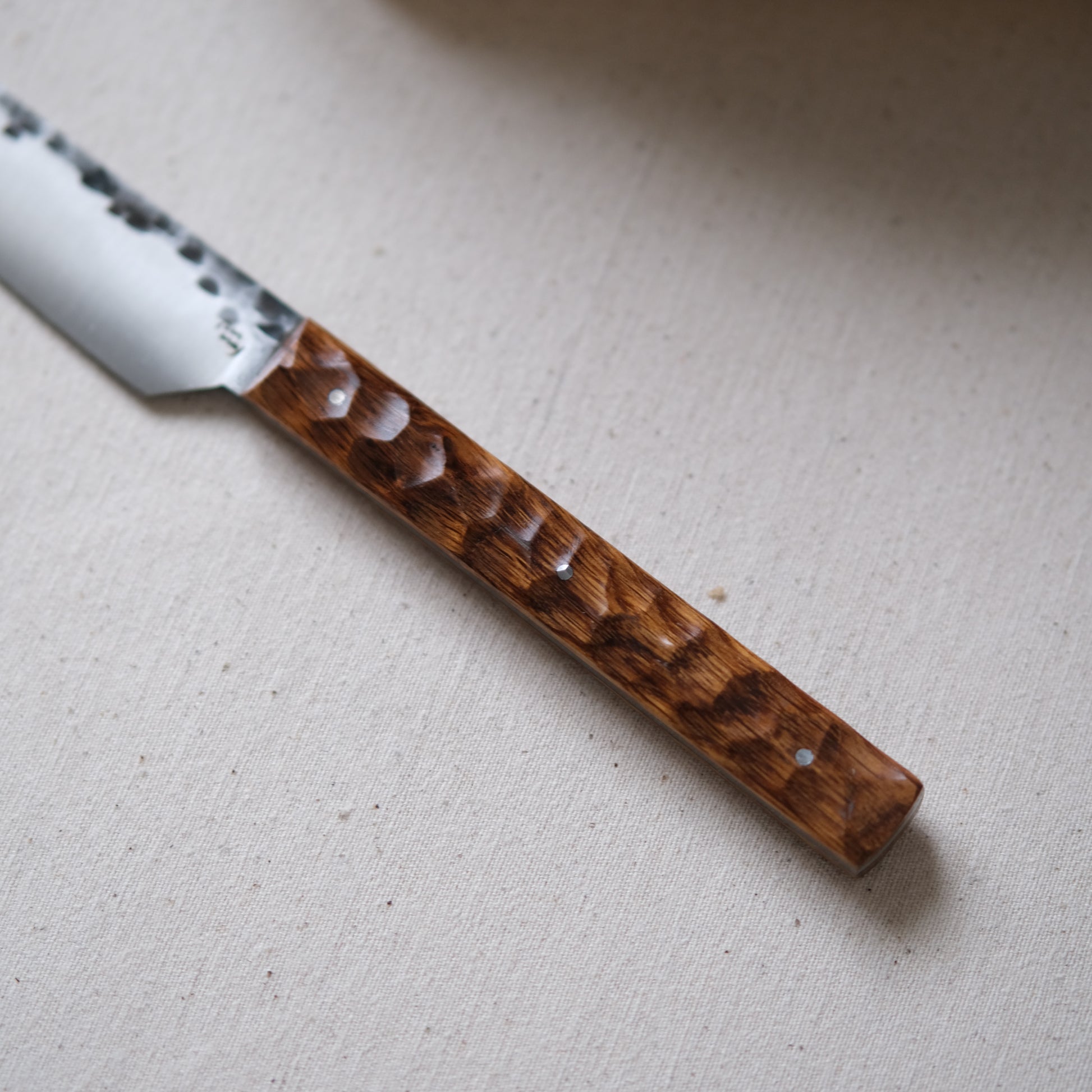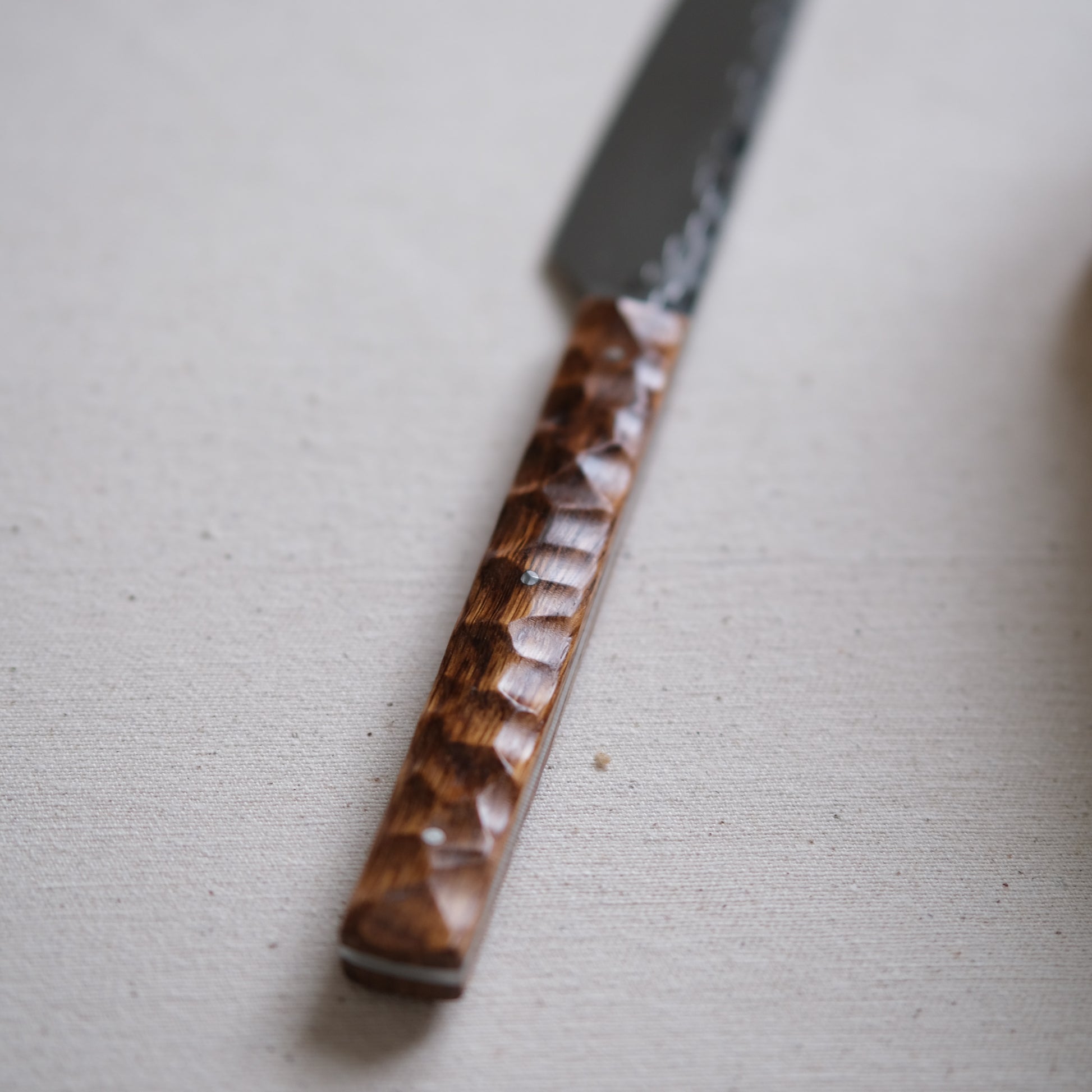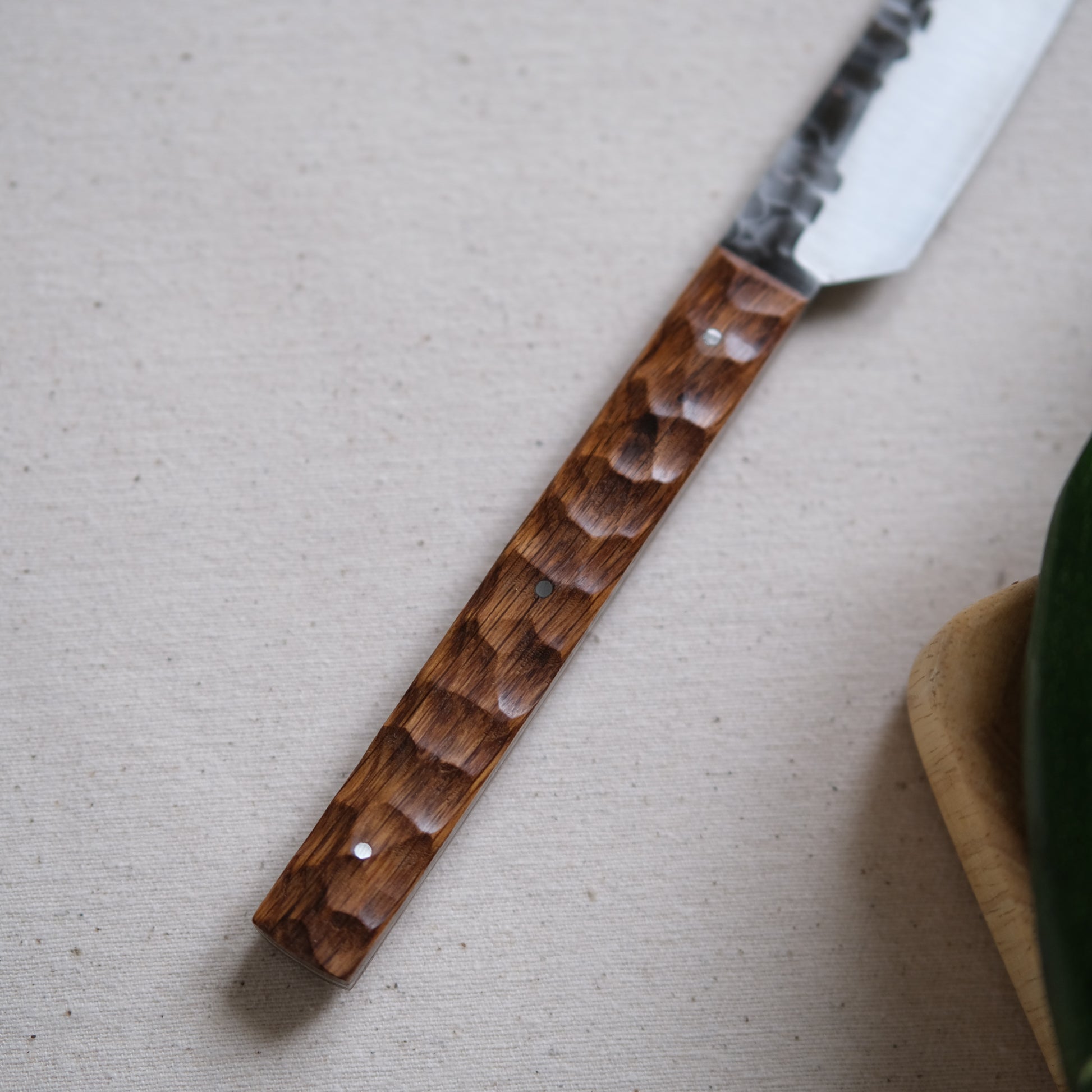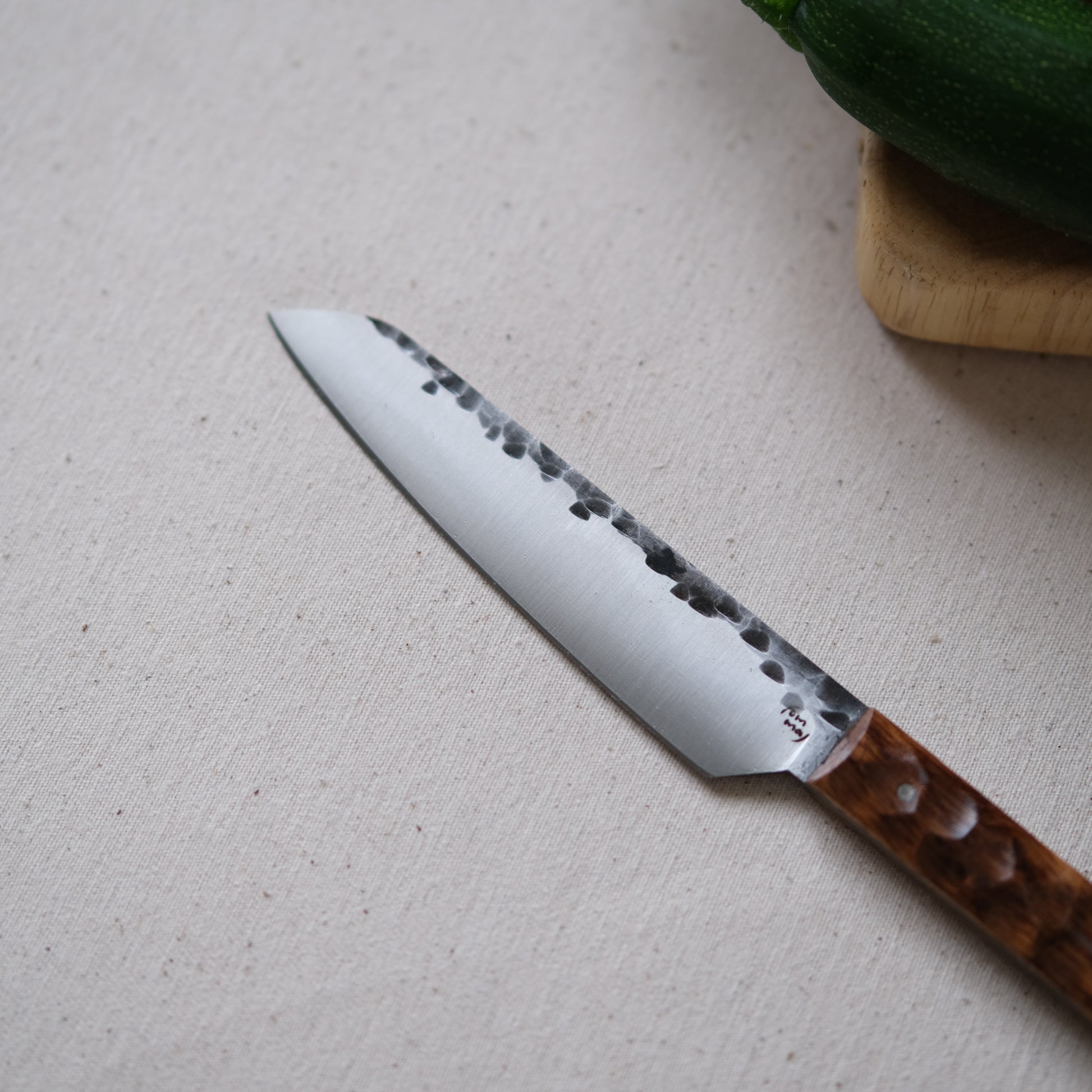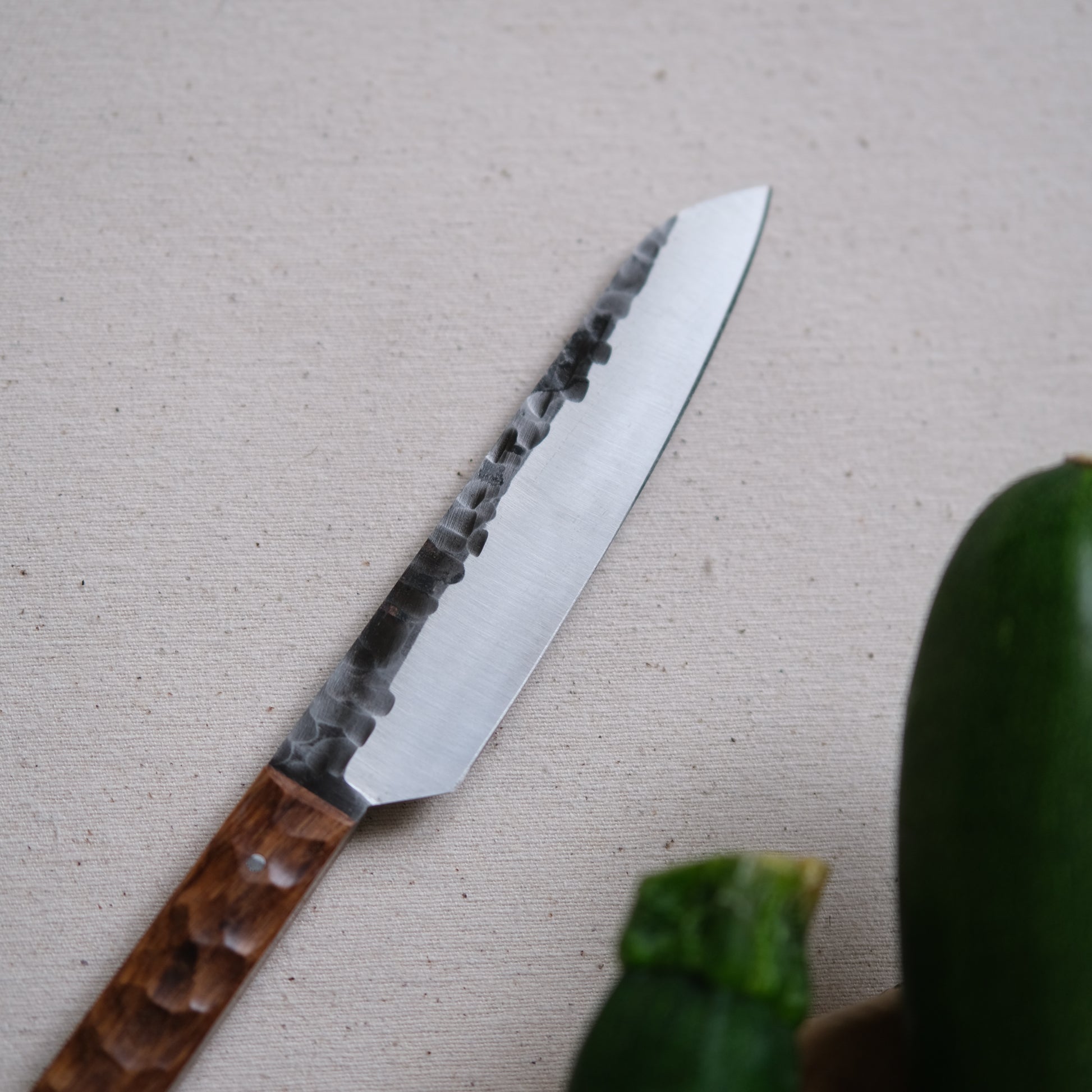Chaque couteau de cuisine est réalisé entièrement à la main par mes soins dans mon atelier en Touraine (dessin, découpe & mise en forme de la lame, traitements thermiques, découpe et façonnage du manche, polissage, rivetage)