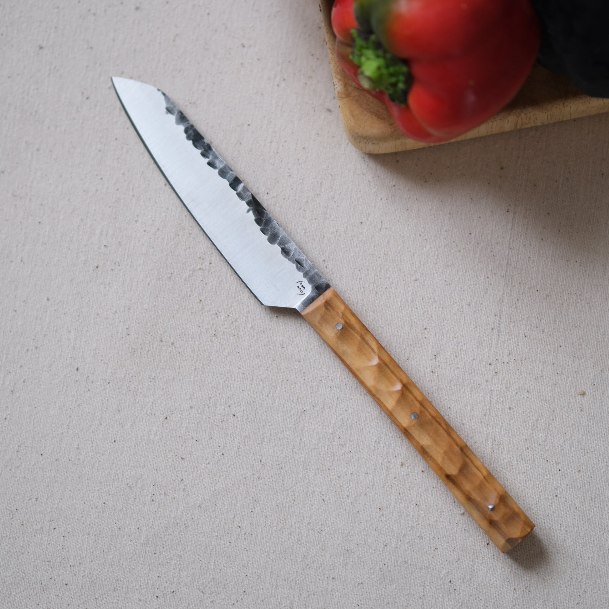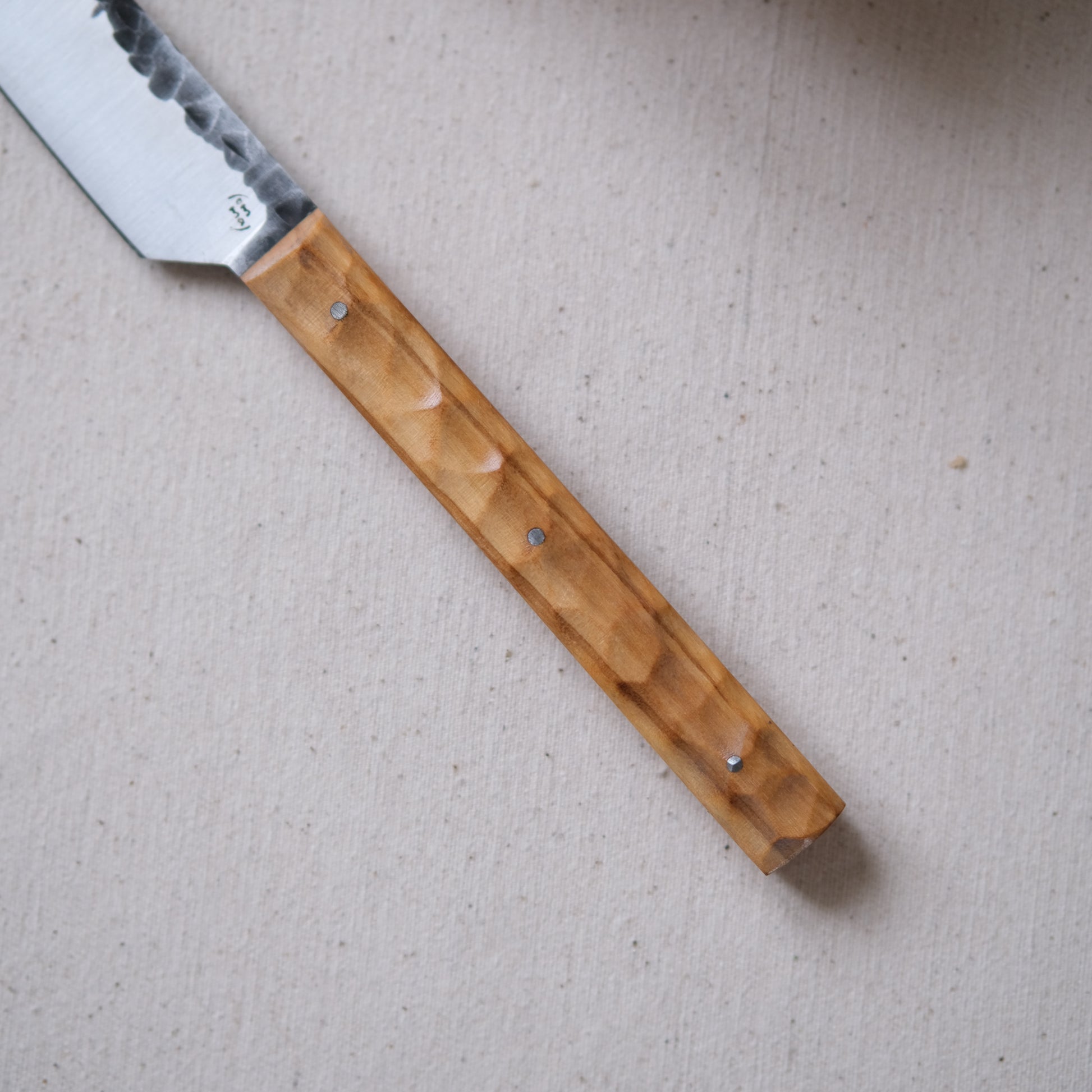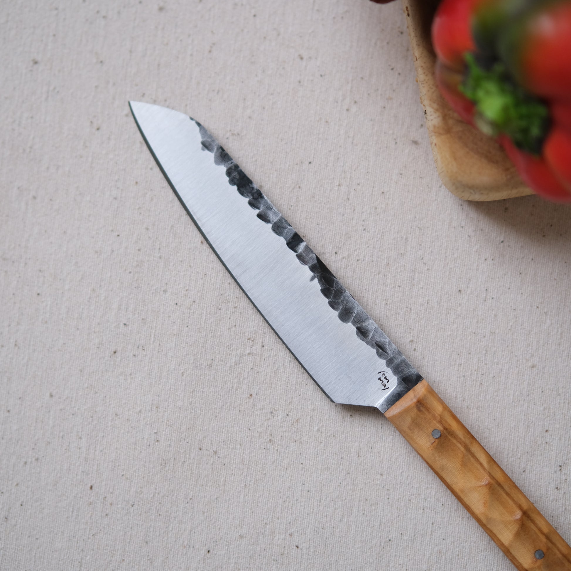 Chaque couteau de cuisine est réalisé entièrement à la main par mes soins dans mon atelier en Touraine (dessin, découpe & mise en forme de la lame, traitements thermiques, découpe et façonnage du manche, polissage, rivetage)