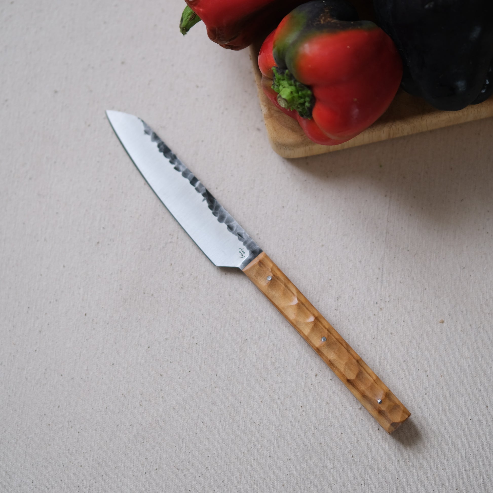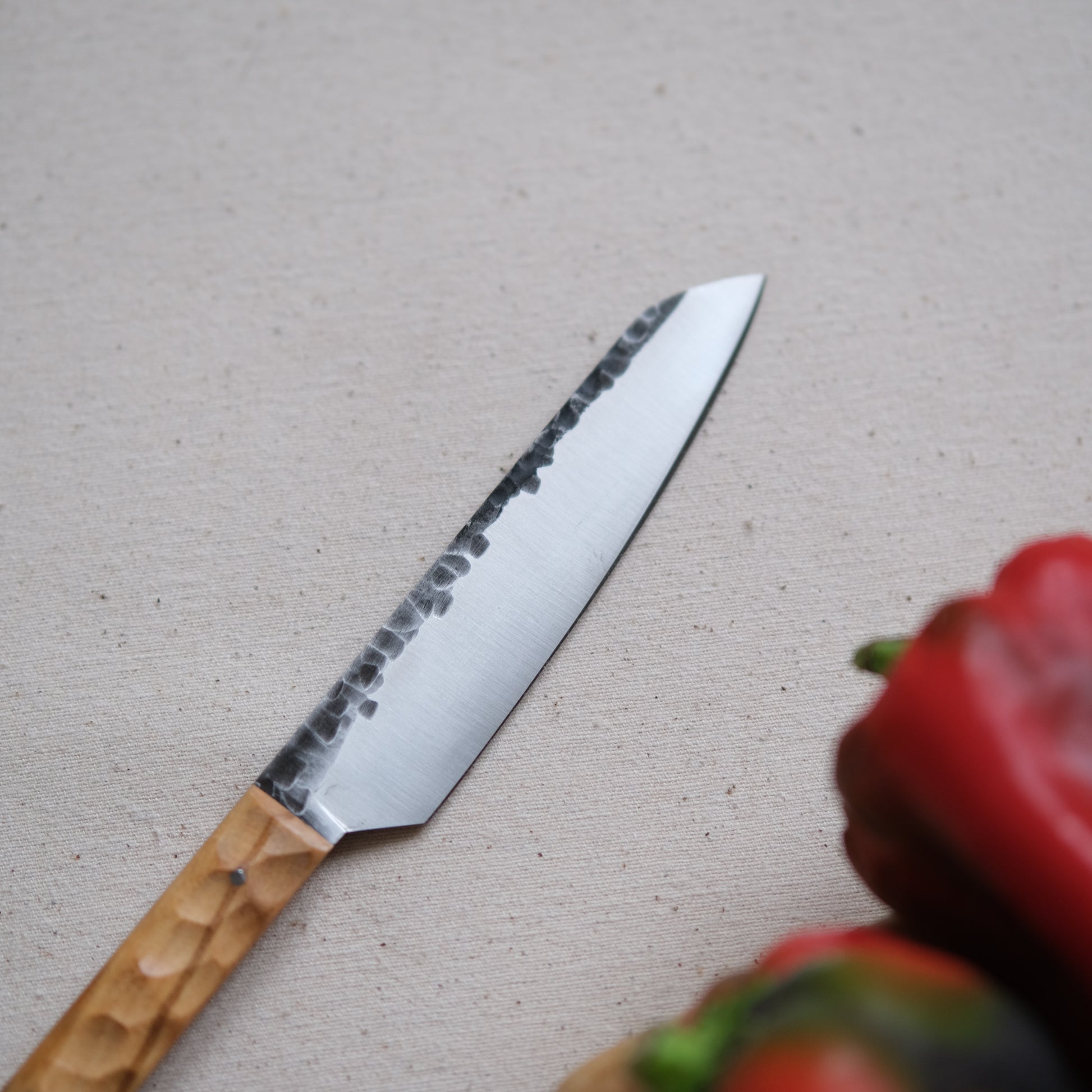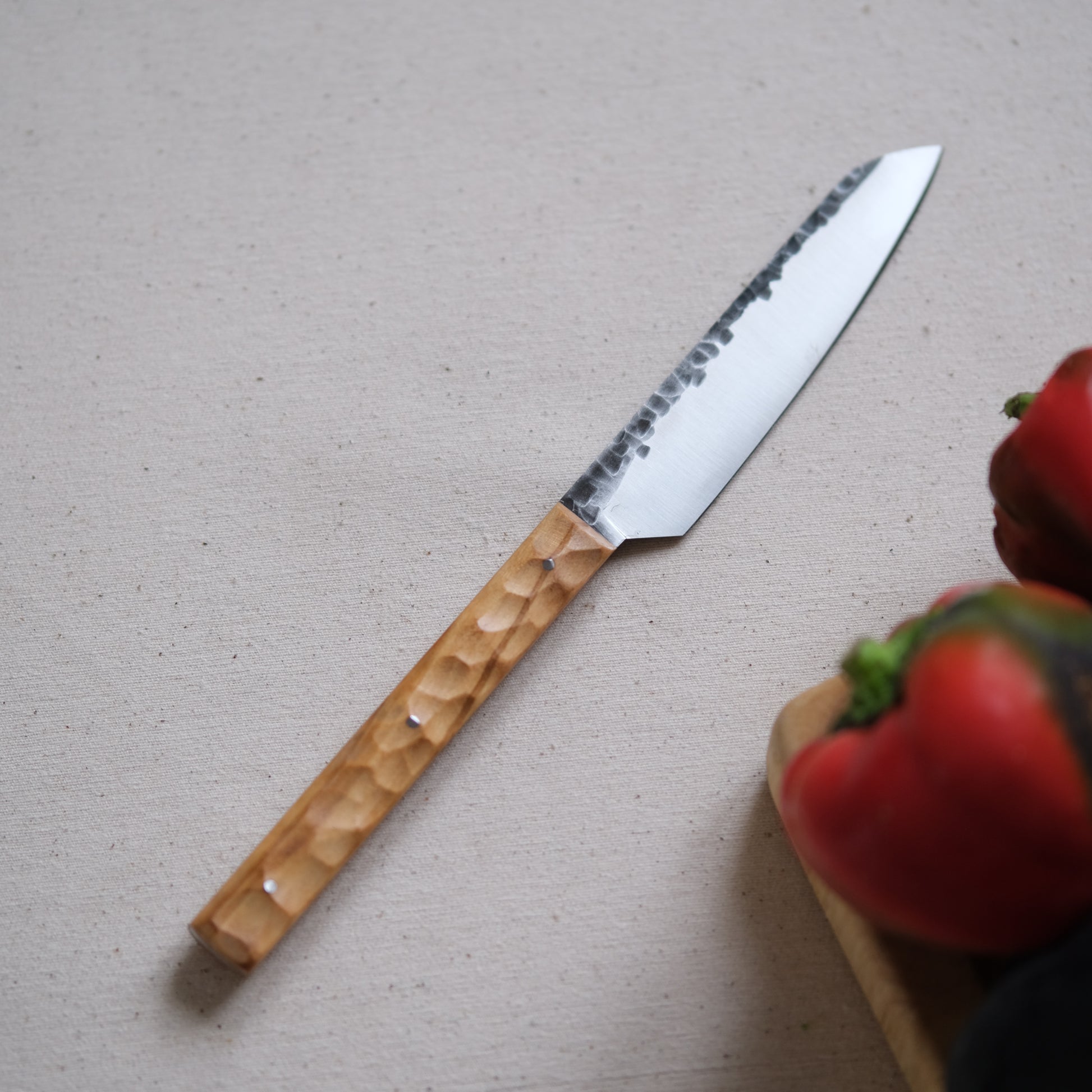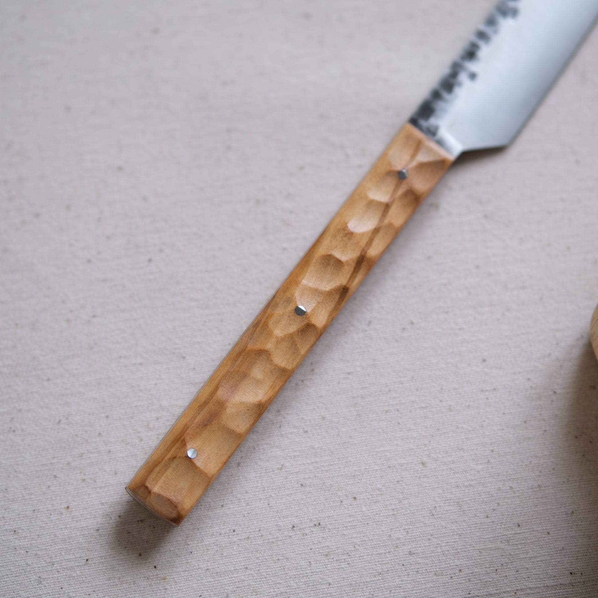 Chaque couteau de cuisine est réalisé entièrement à la main par mes soins dans mon atelier en Touraine (dessin, découpe & mise en forme de la lame, traitements thermiques, découpe et façonnage du manche, polissage, rivetage)