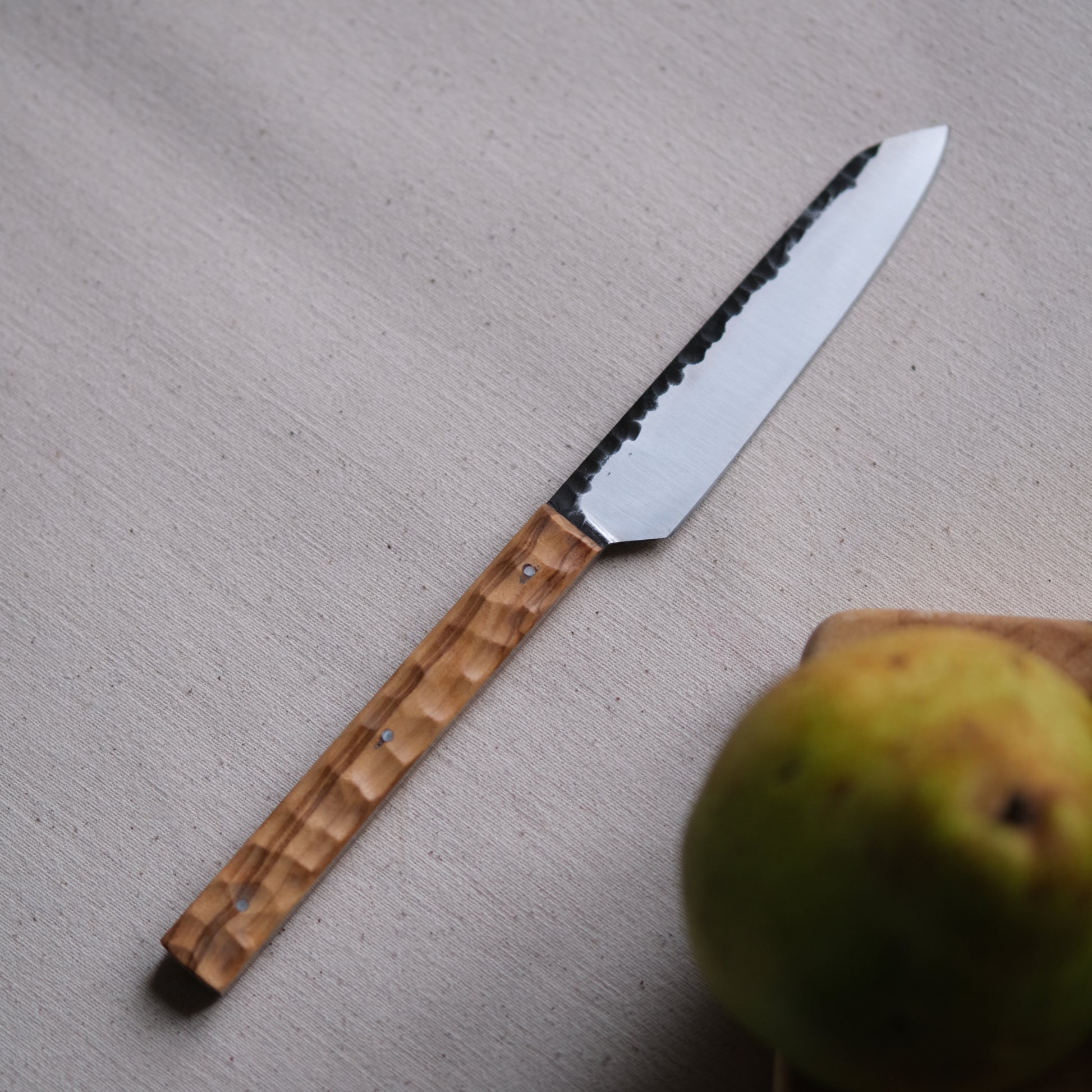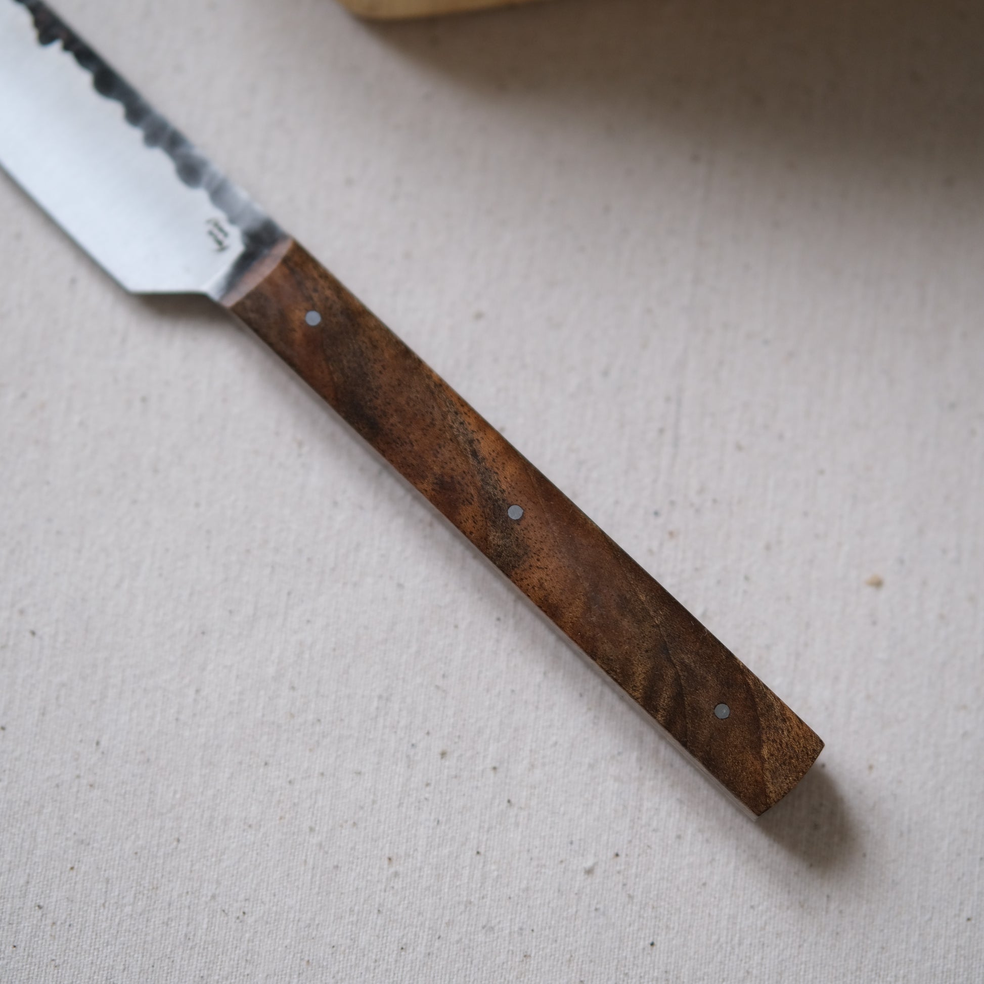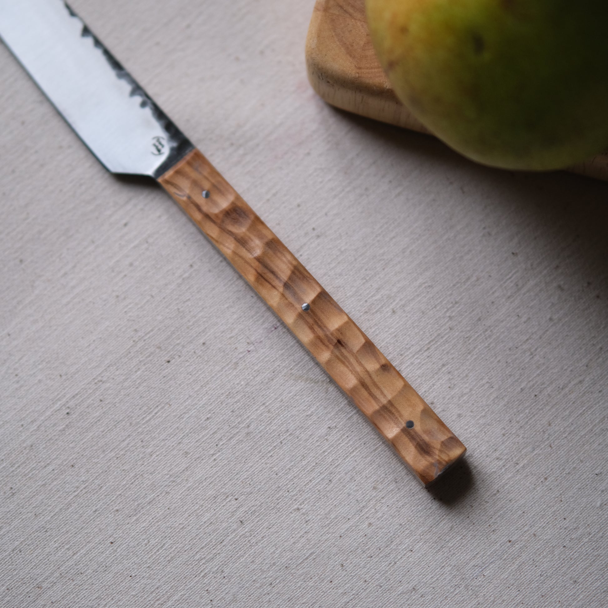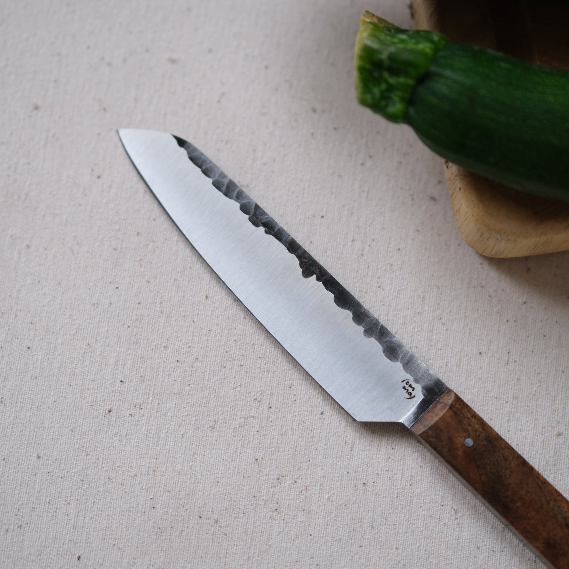 Chaque couteau de cuisine est réalisé entièrement à la main par mes soins dans mon atelier en Touraine (dessin, découpe & mise en forme de la lame, traitements thermiques, découpe et façonnage du manche, polissage, rivetage)