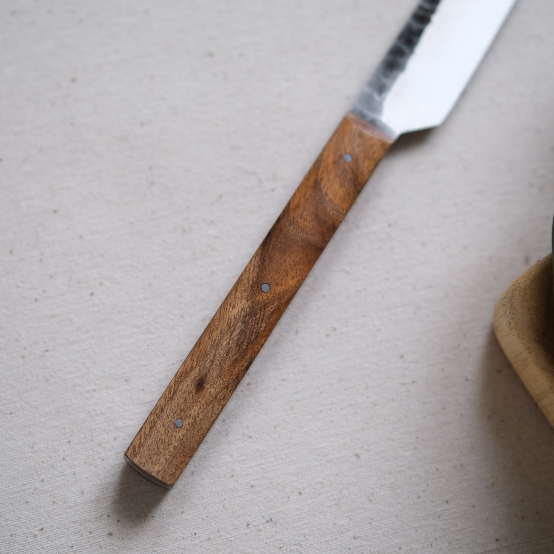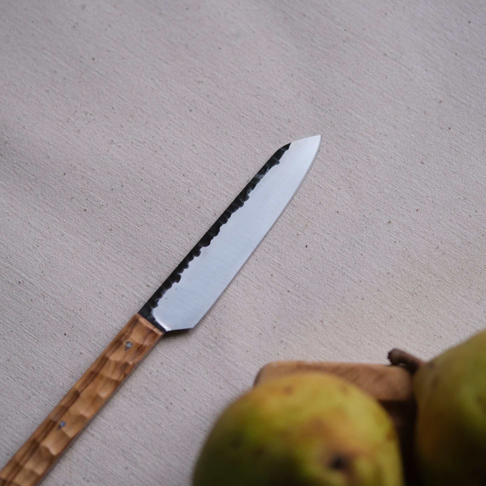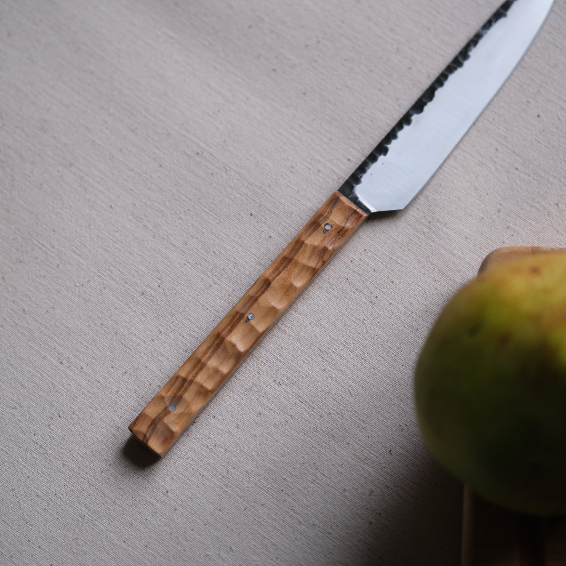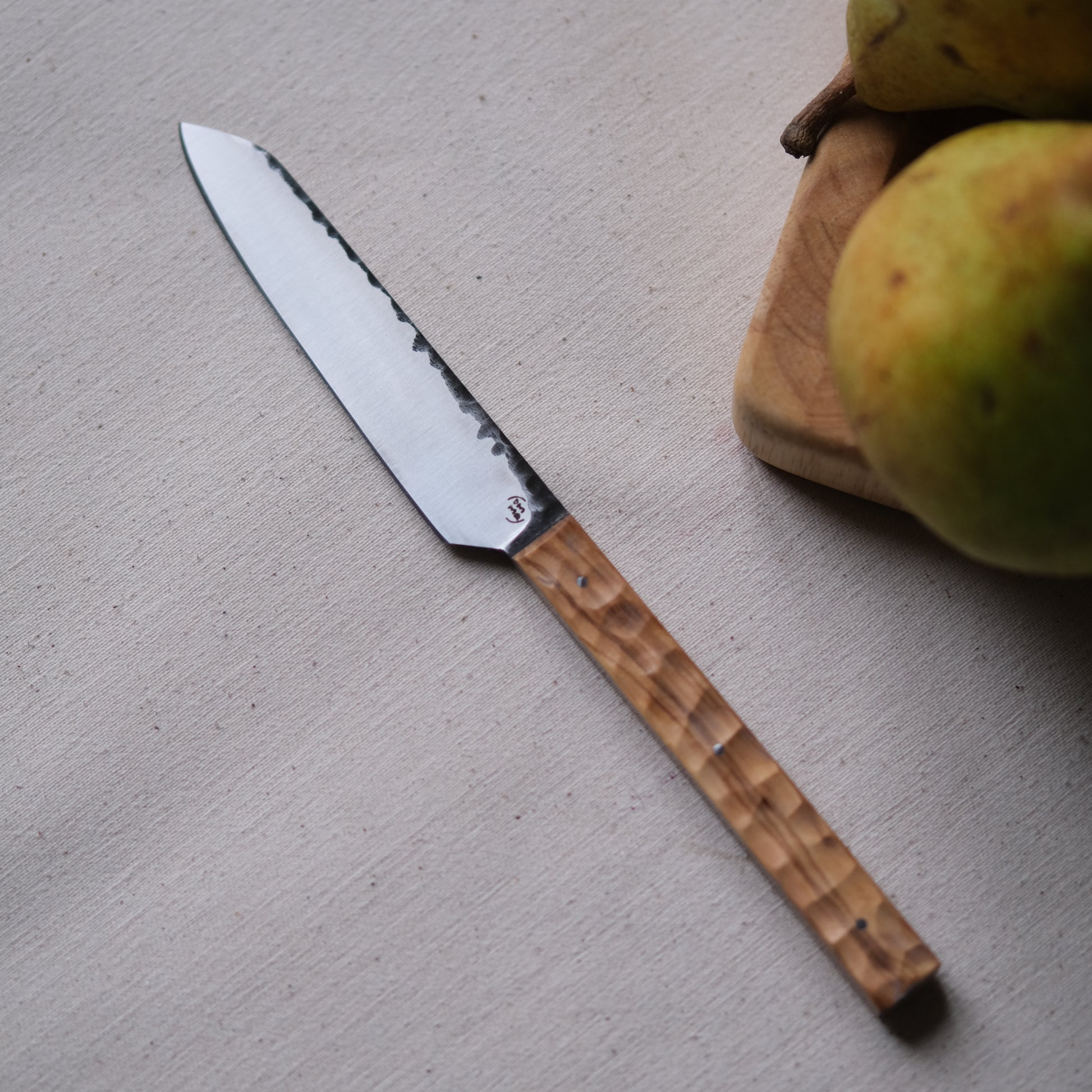 Chaque couteau de cuisine est réalisé entièrement à la main par mes soins dans mon atelier en Touraine (dessin, découpe & mise en forme de la lame, traitements thermiques, découpe et façonnage du manche, polissage, rivetage)