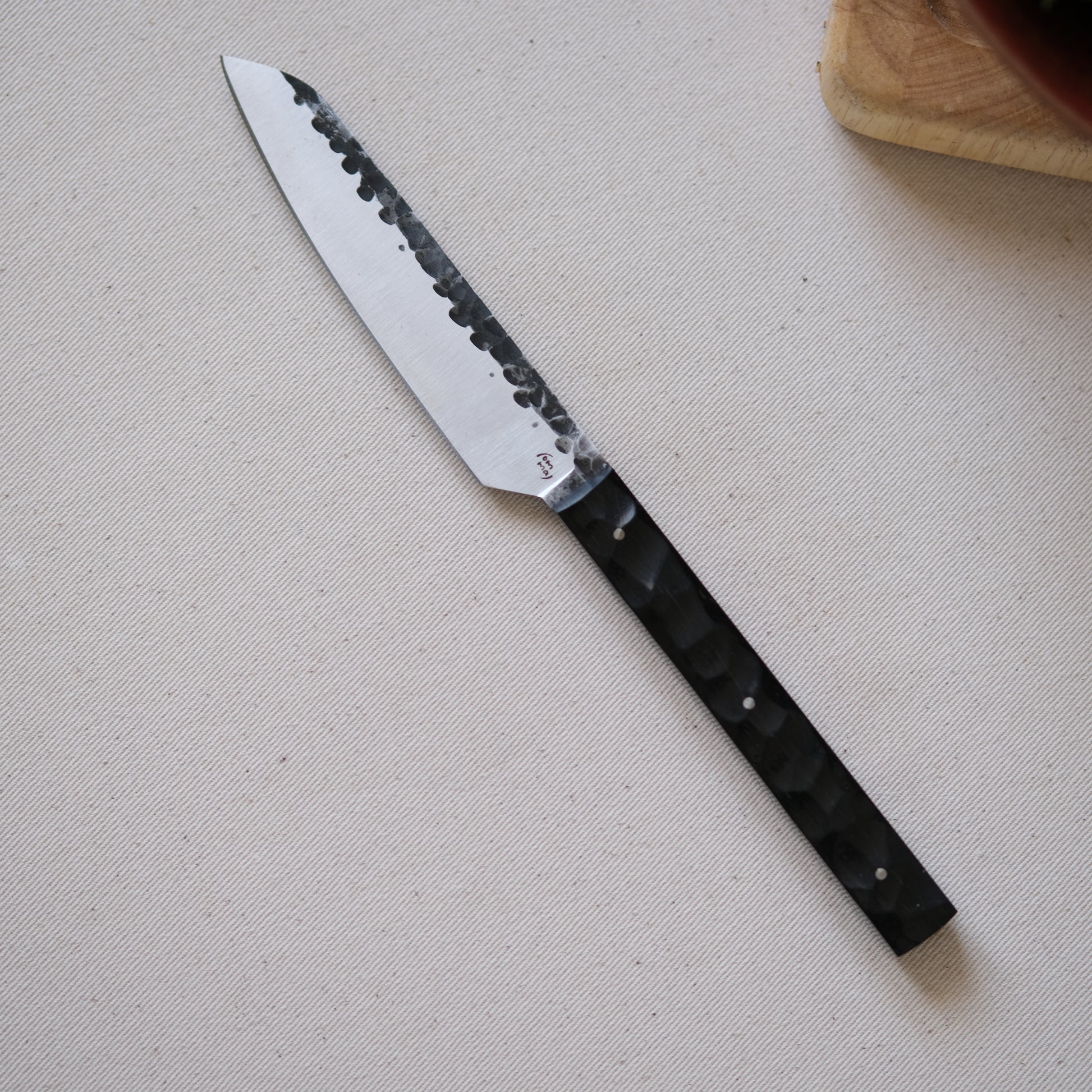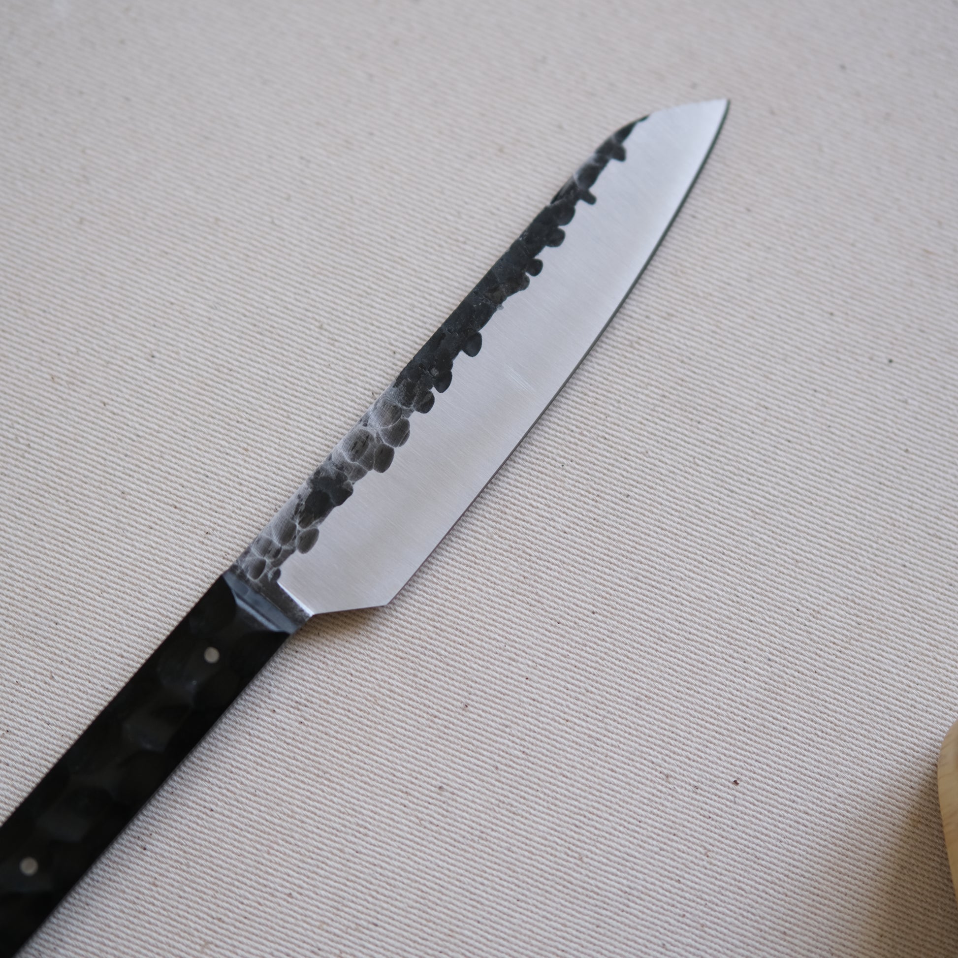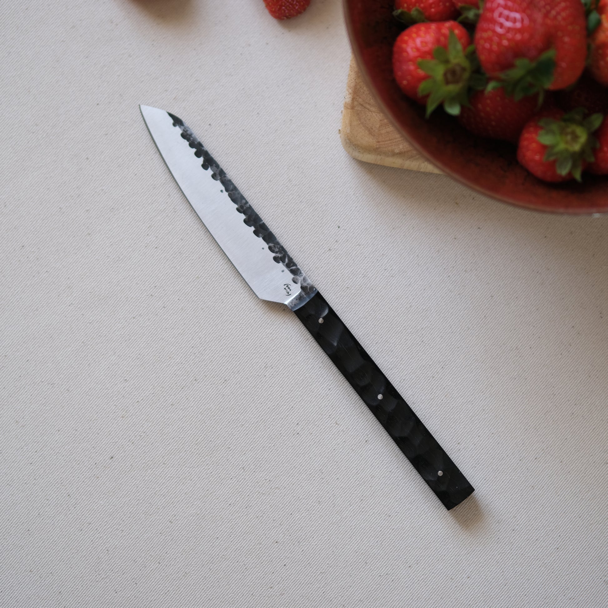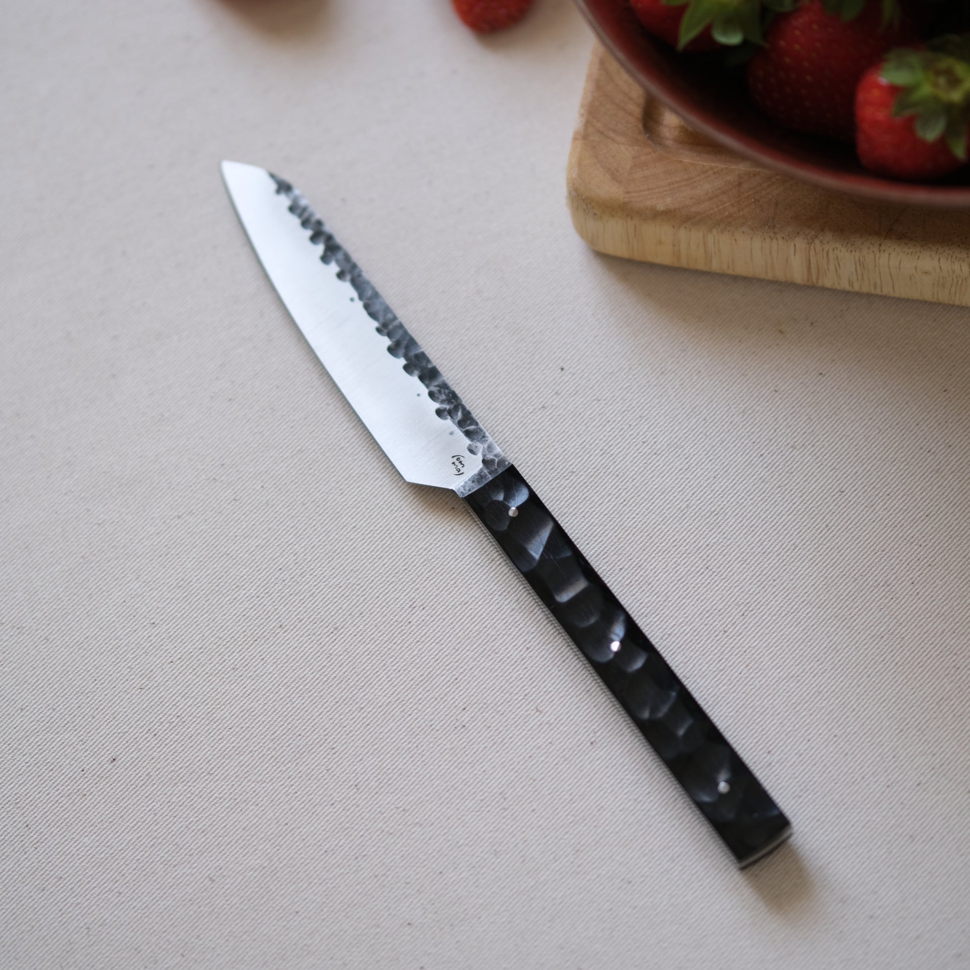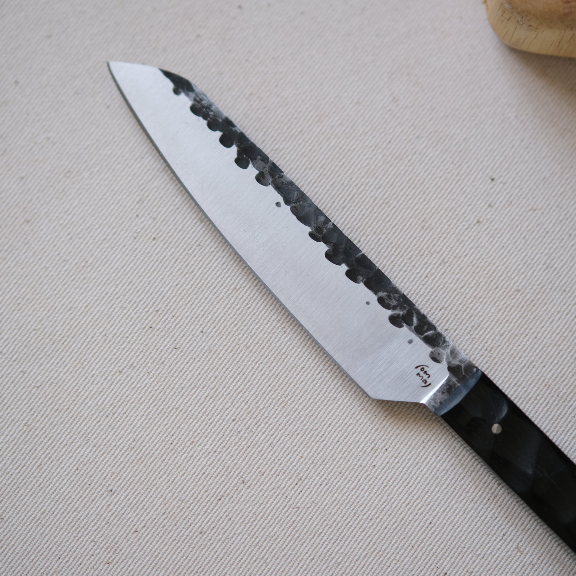 Chaque couteau de cuisine est réalisé entièrement à la main par mes soins dans mon atelier en Touraine (dessin, découpe & mise en forme de la lame, traitements thermiques, découpe et façonnage du manche, polissage, rivetage)