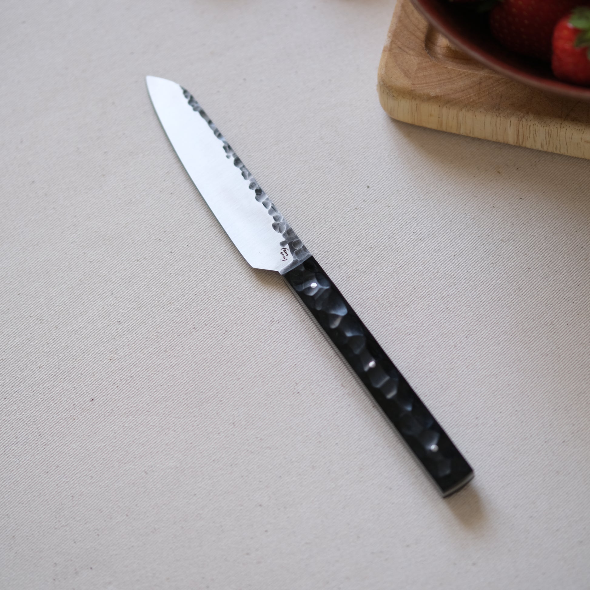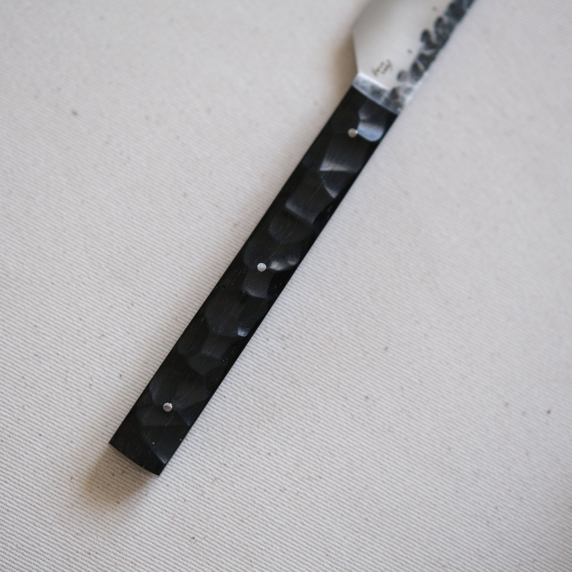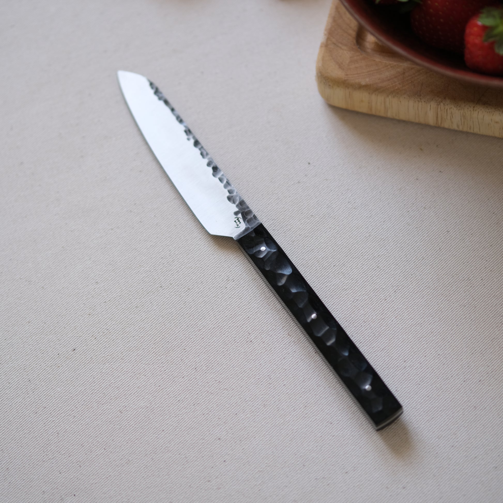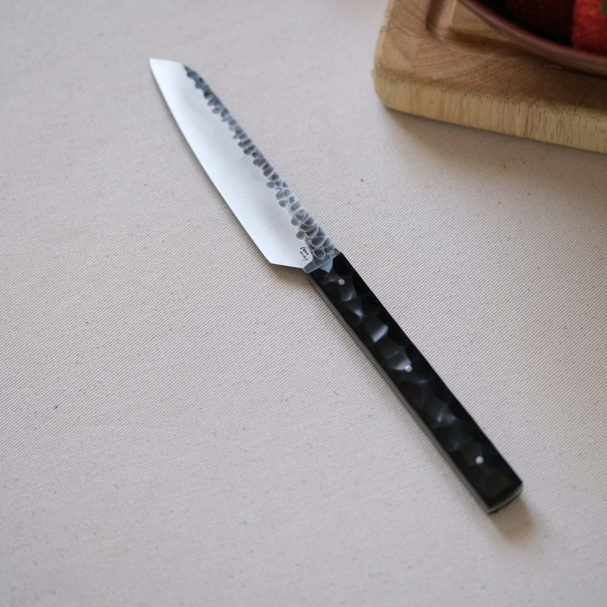 Chaque couteau de cuisine est réalisé entièrement à la main par mes soins dans mon atelier en Touraine (dessin, découpe & mise en forme de la lame, traitements thermiques, découpe et façonnage du manche, polissage, rivetage)