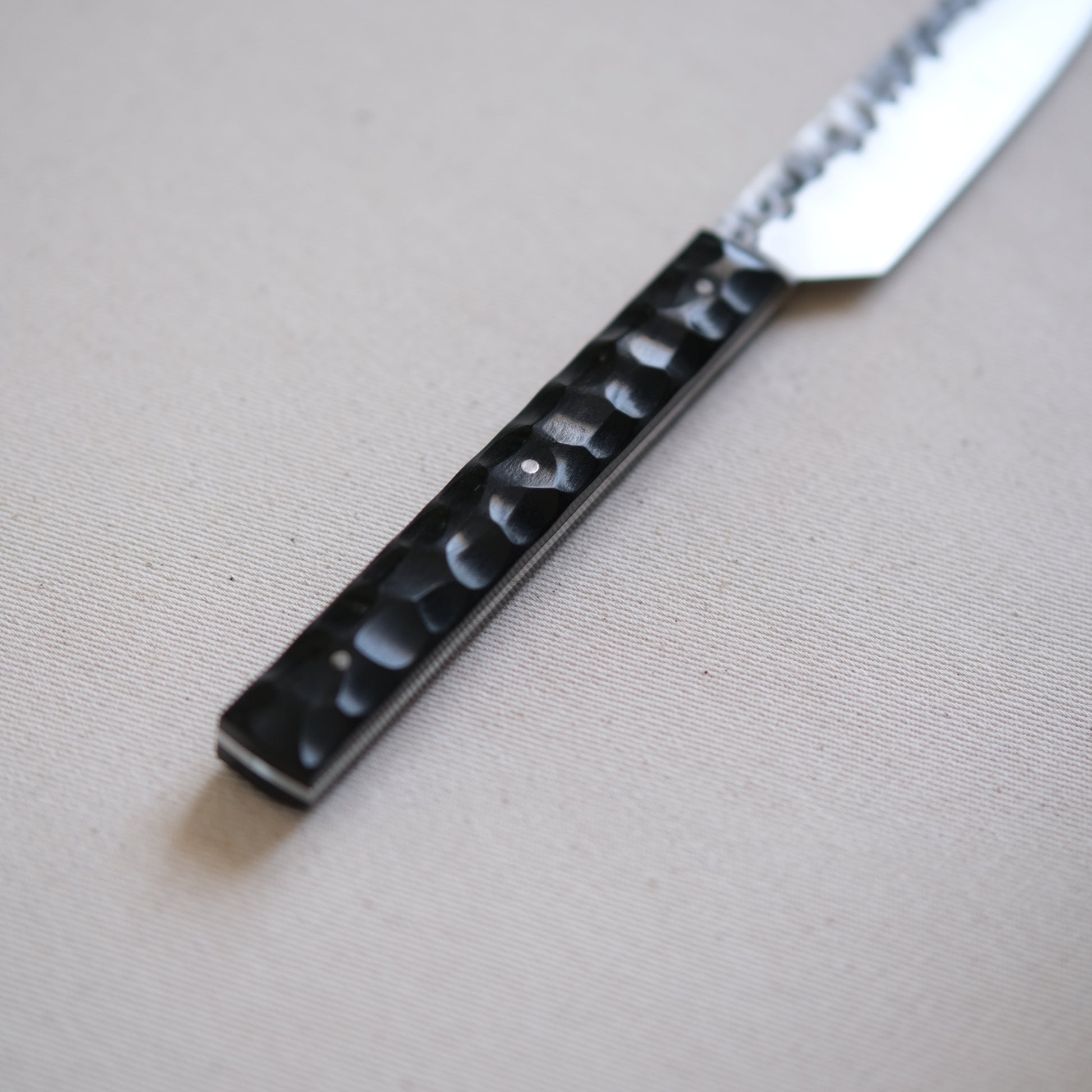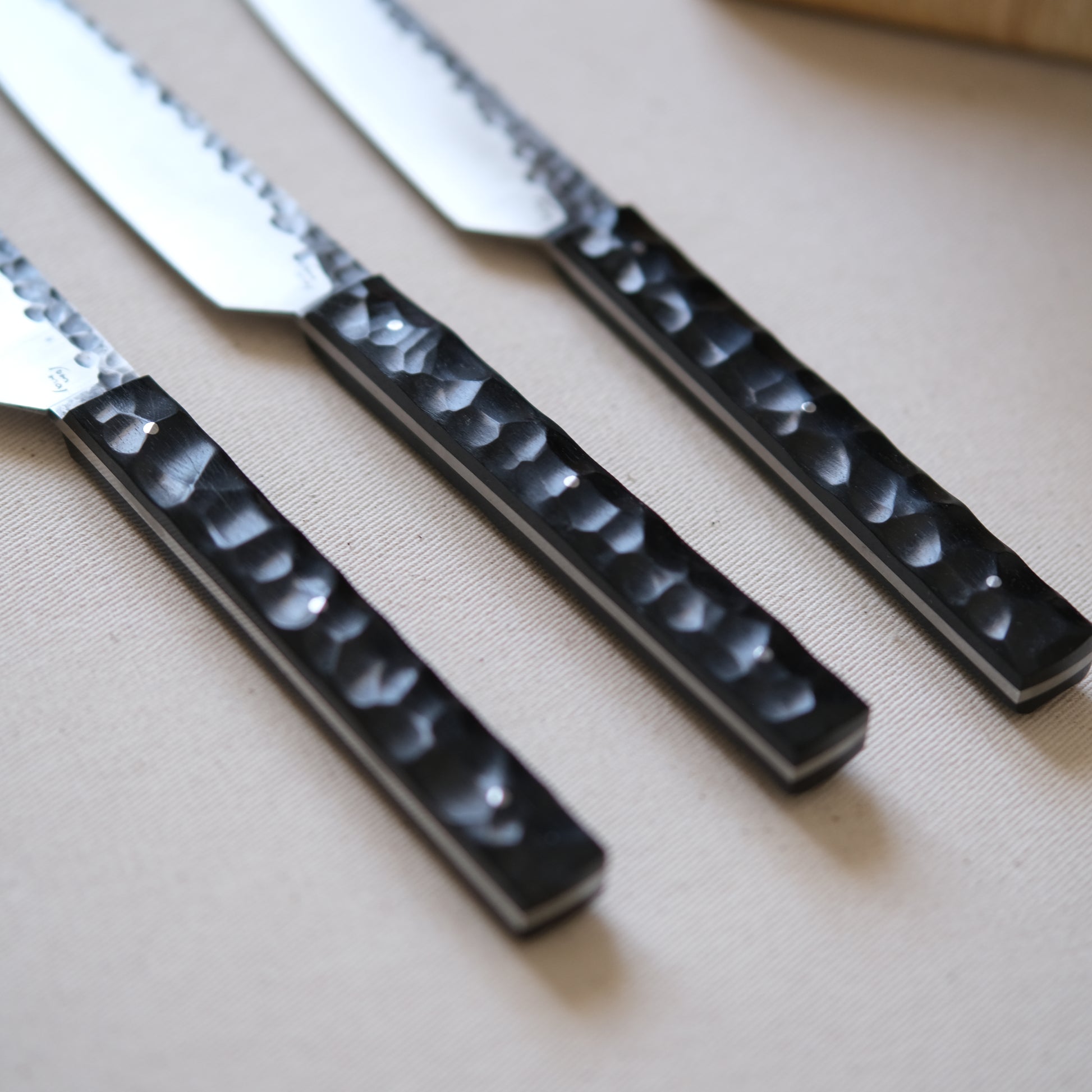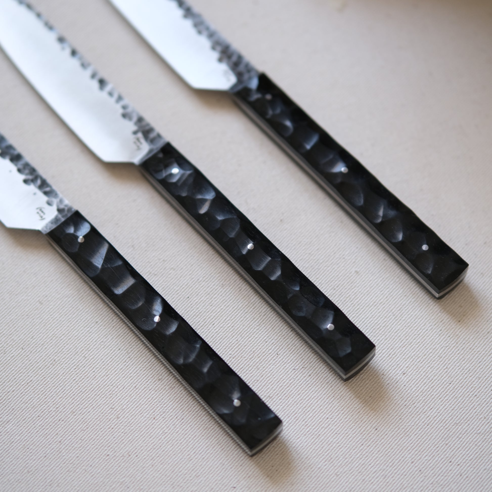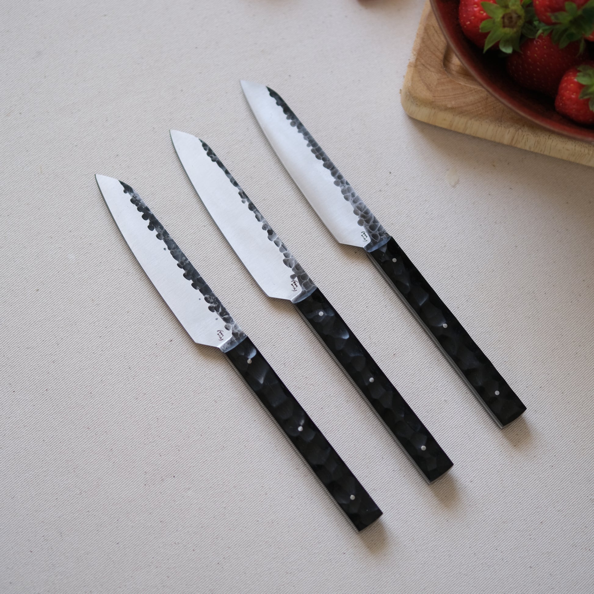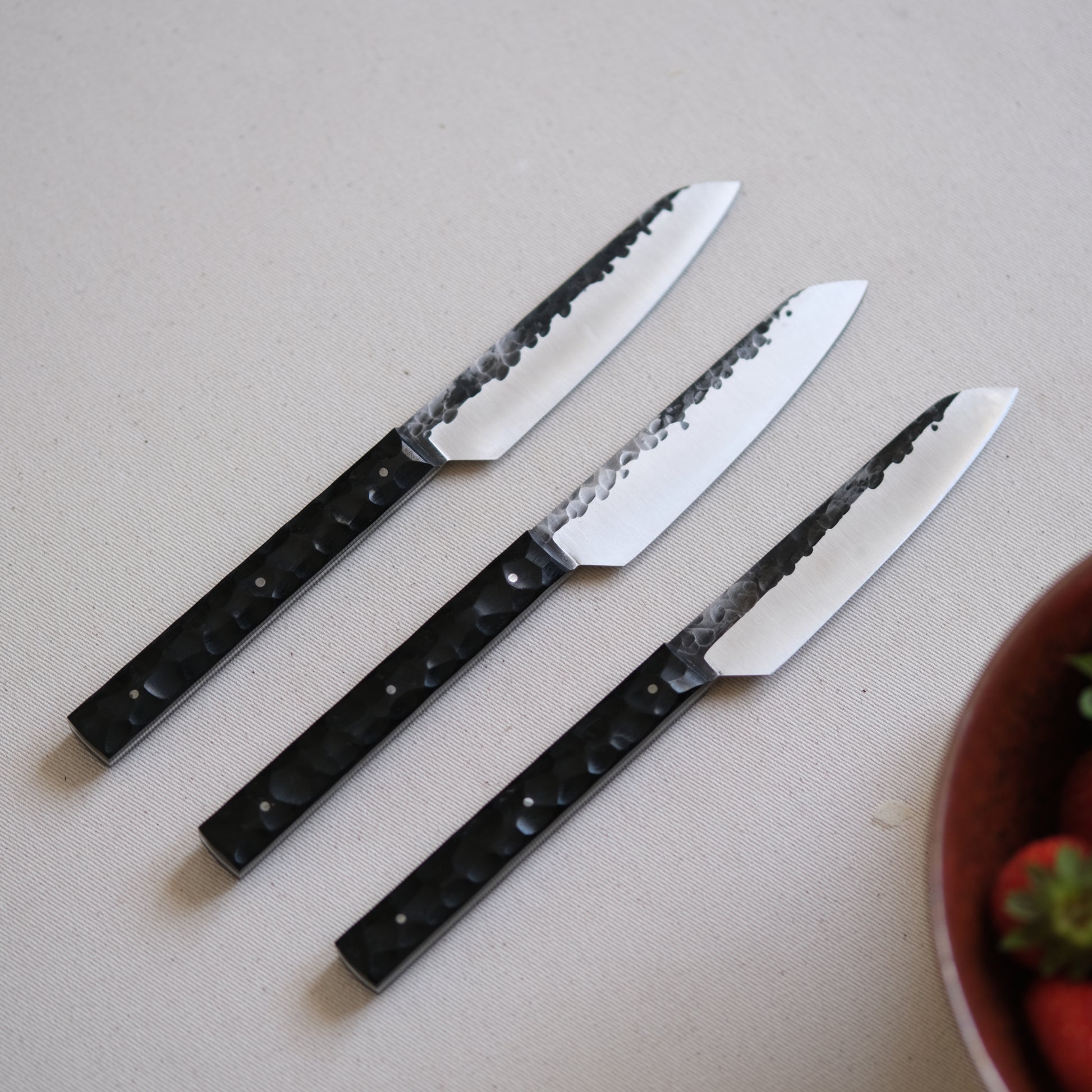 Chaque couteau de cuisine est réalisé entièrement à la main par mes soins dans mon atelier en Touraine (dessin, découpe & mise en forme de la lame, traitements thermiques, découpe et façonnage du manche, polissage, rivetage)
