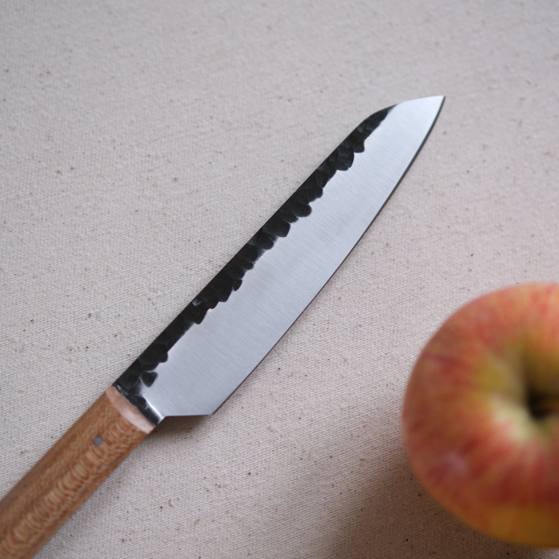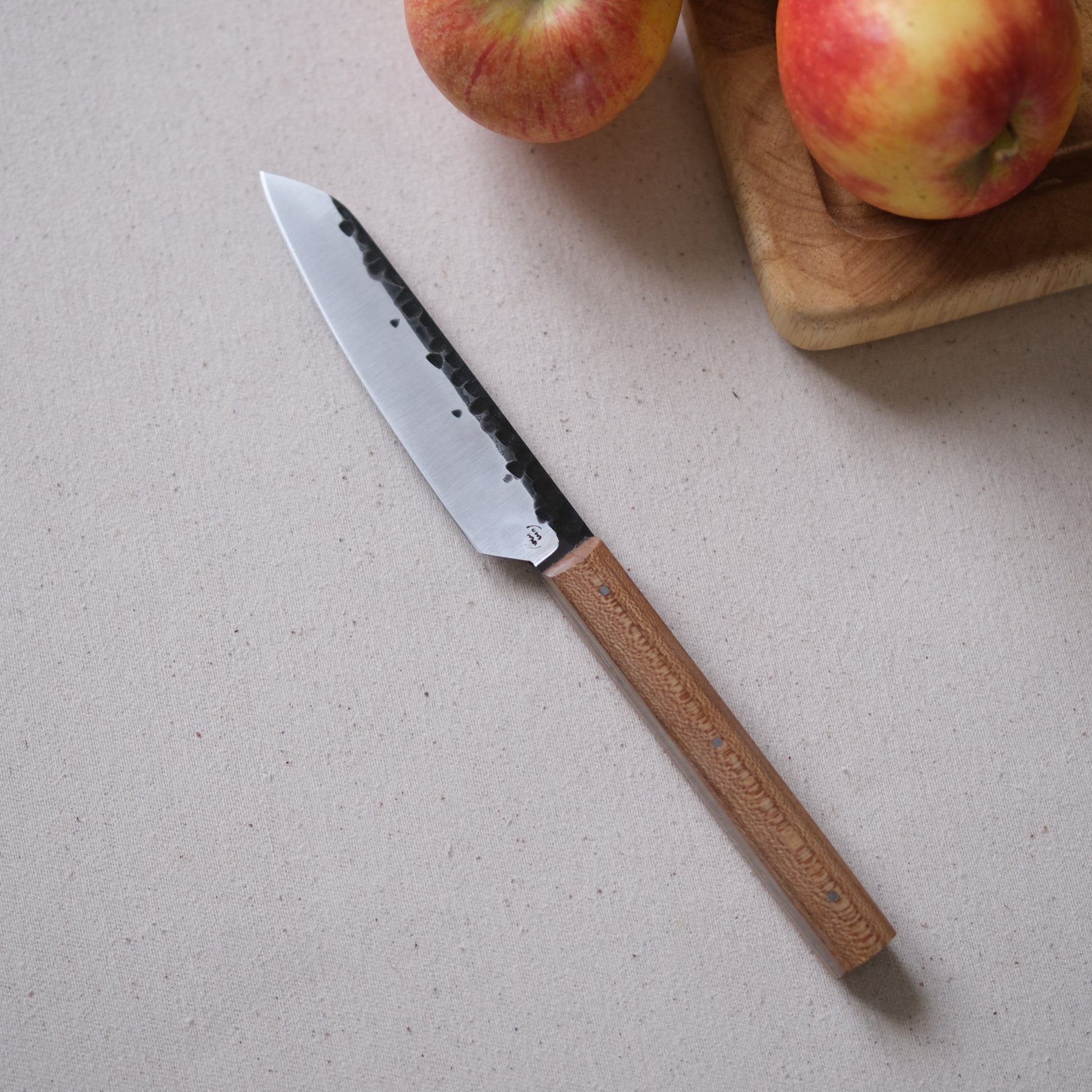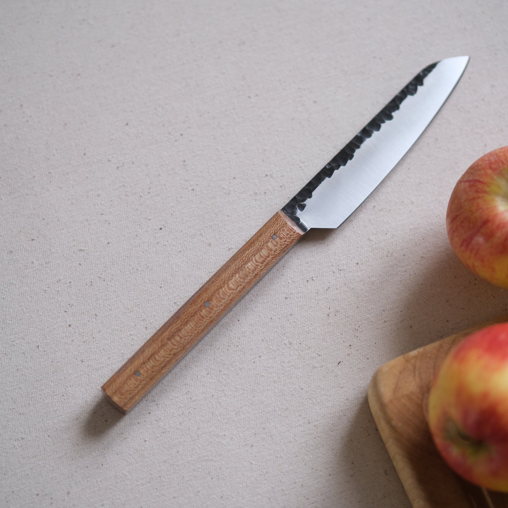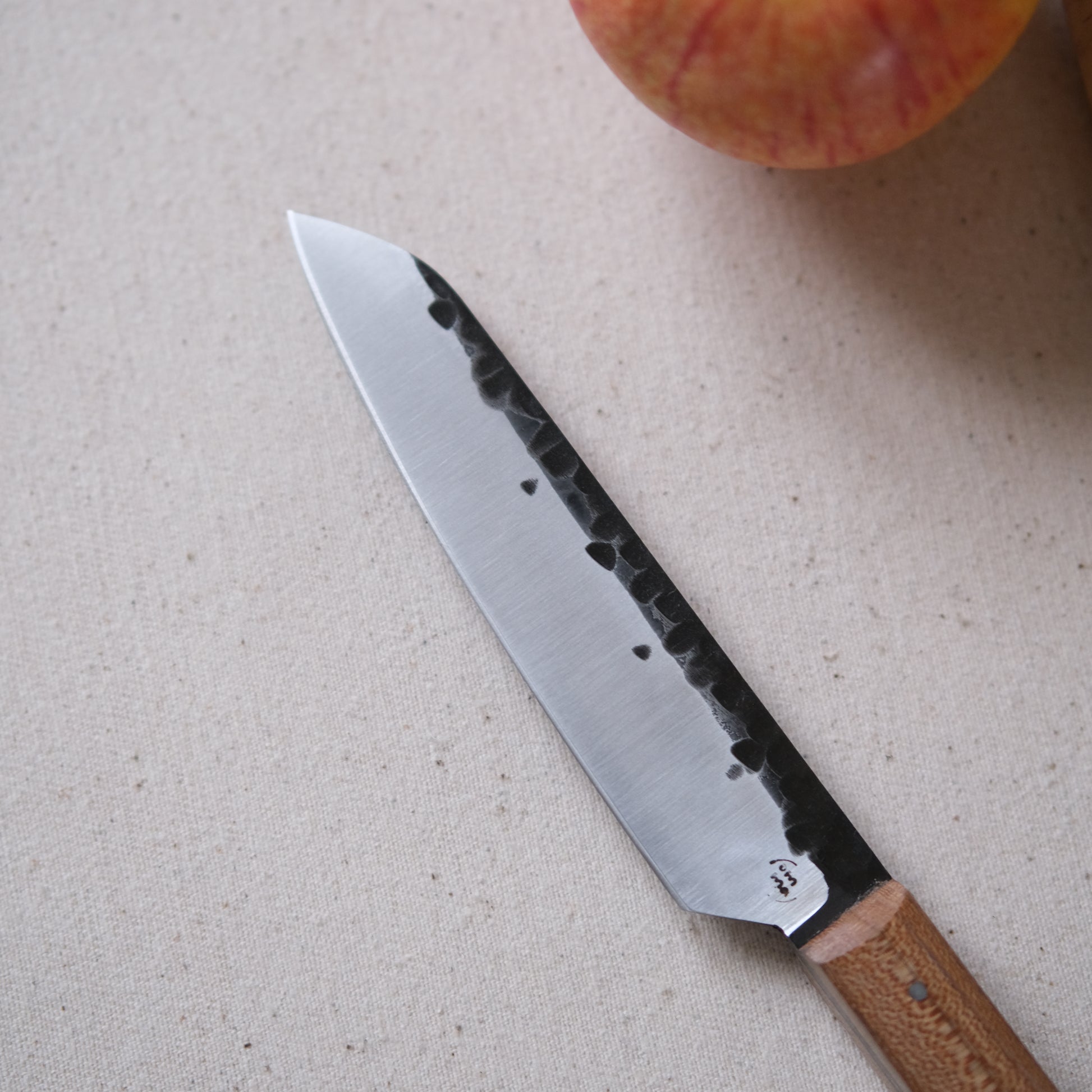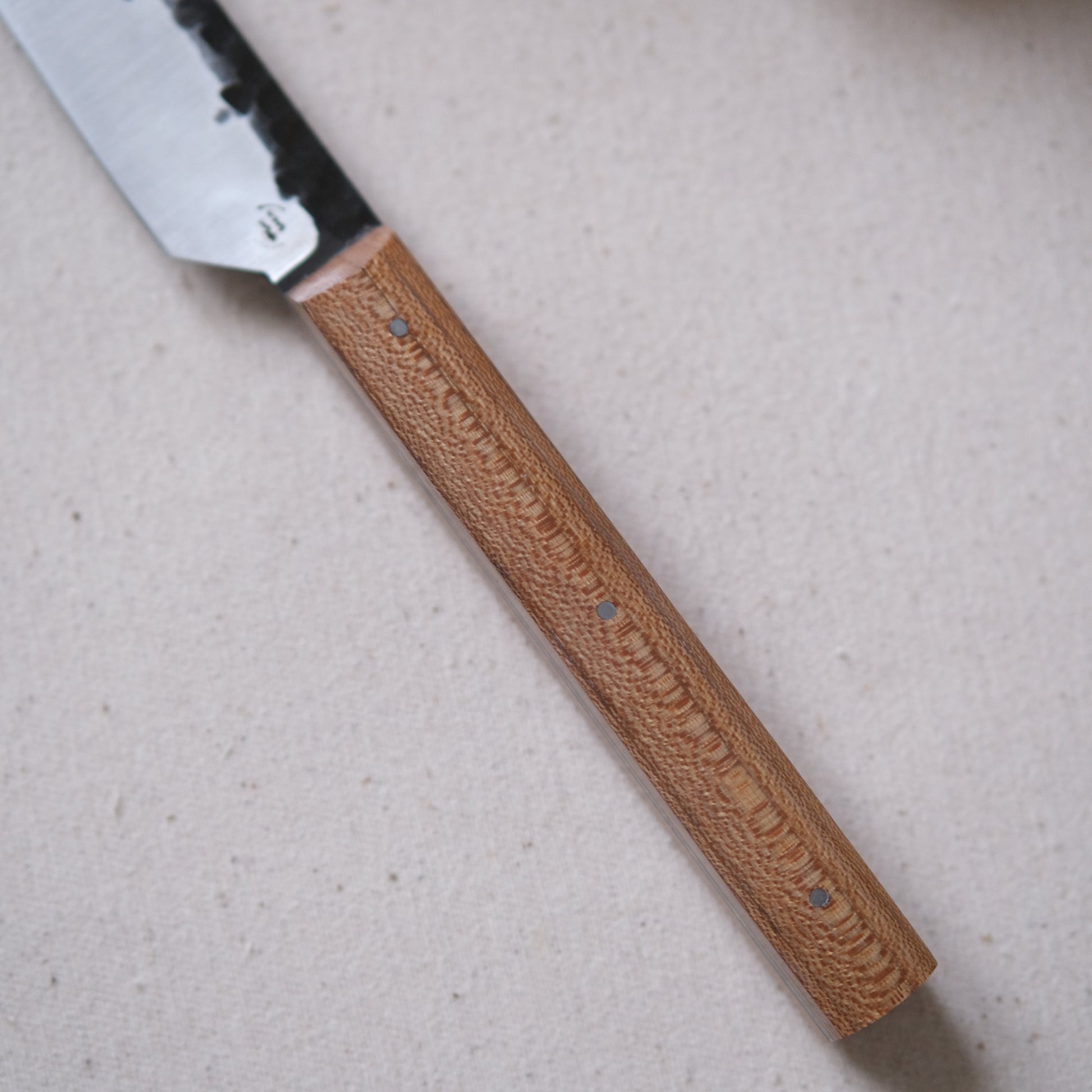 Chaque couteau de cuisine est réalisé entièrement à la main par mes soins dans mon atelier en Touraine (dessin, découpe & mise en forme de la lame, traitements thermiques, découpe et façonnage du manche, polissage, rivetage)