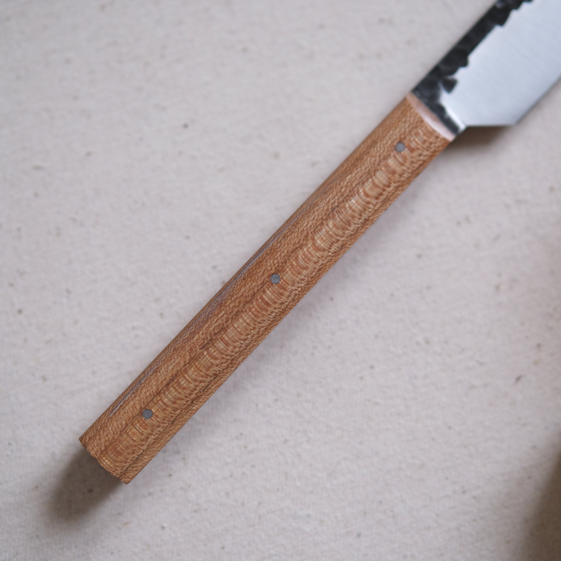 Le haut de la lame est texturé et laissé brut de trempe, créant ainsi un contraste et des reliefs singuliers.