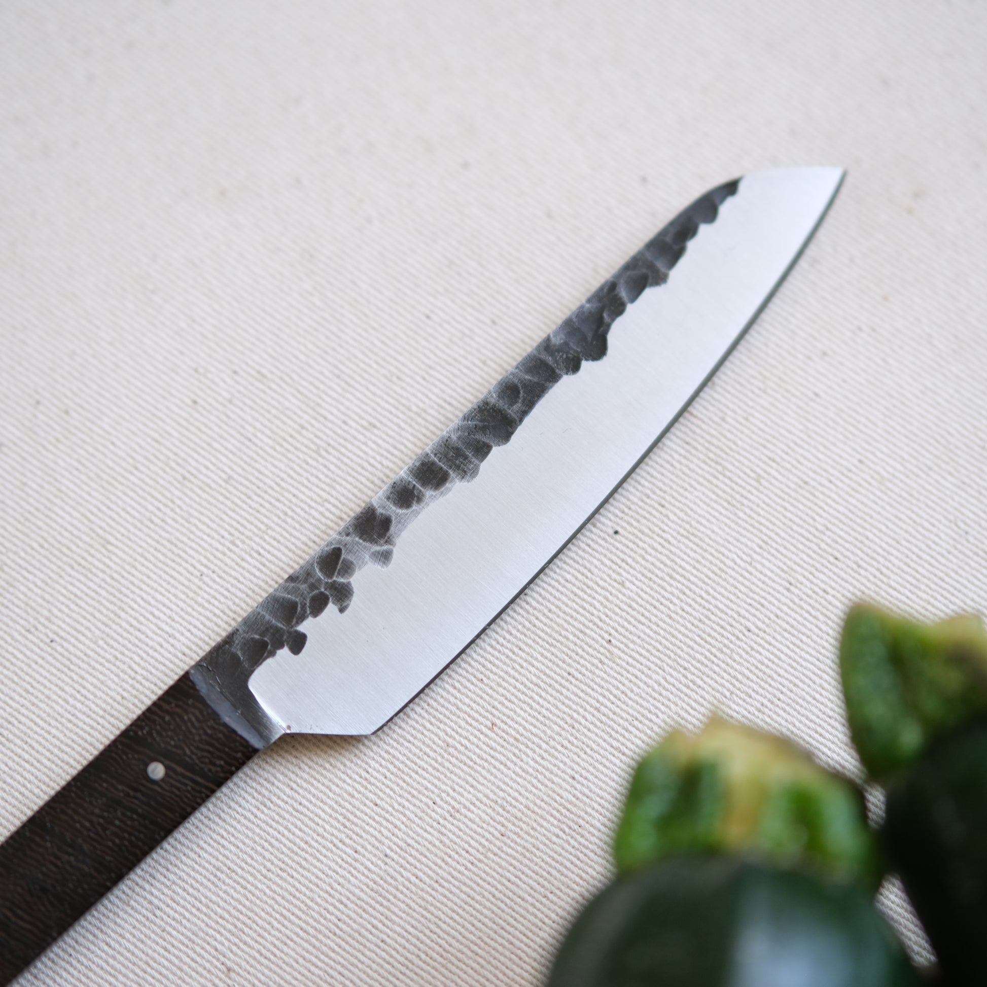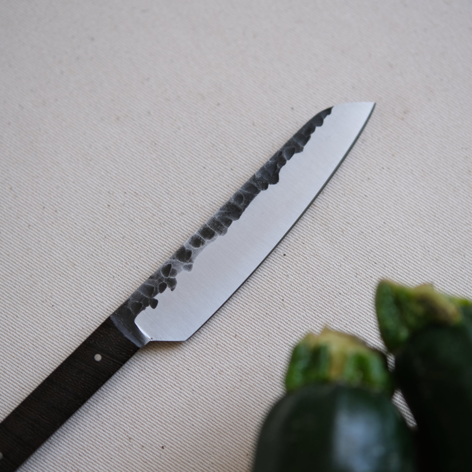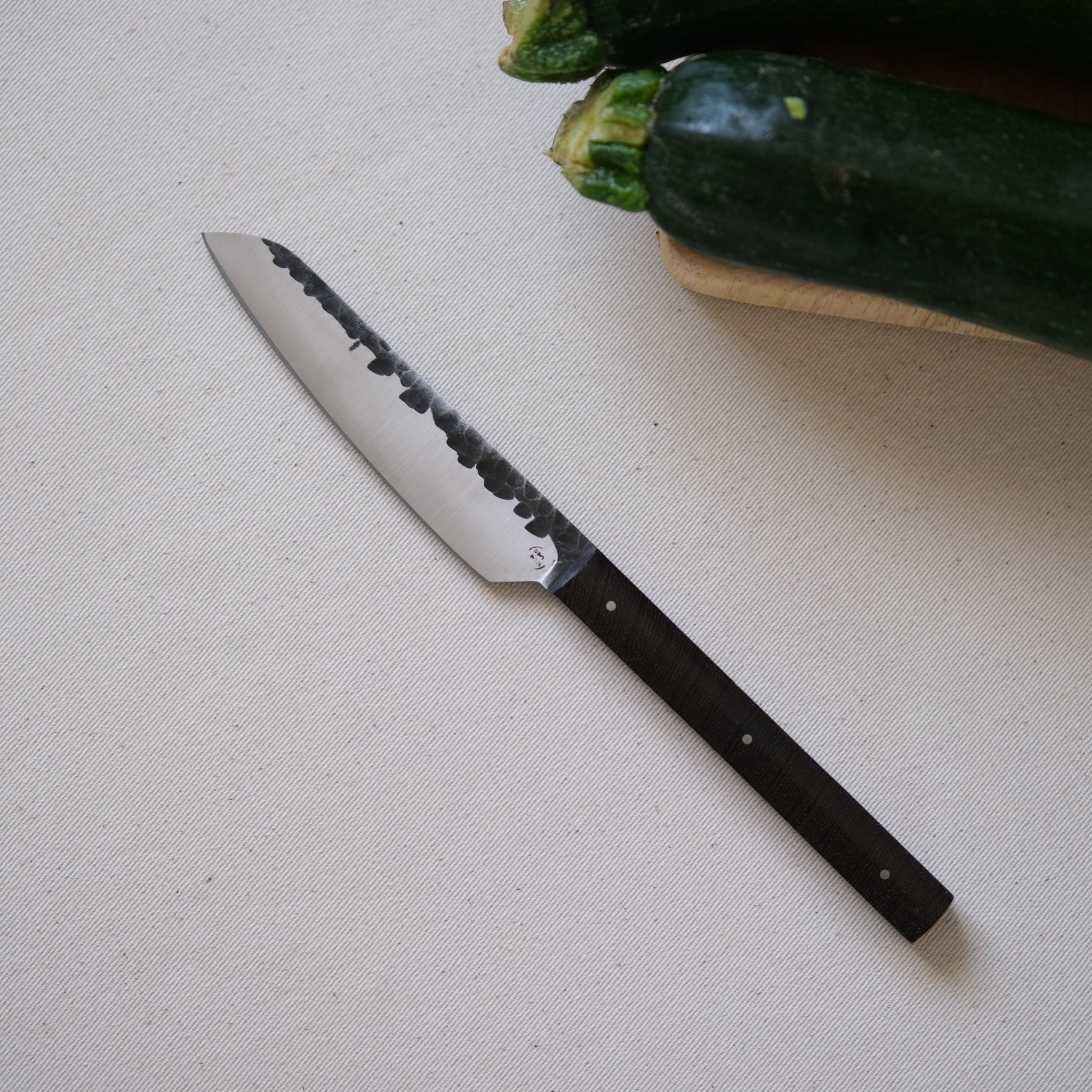Chaque couteau de cuisine est réalisé entièrement à la main par mes soins dans mon atelier en Touraine (dessin, découpe & mise en forme de la lame, traitements thermiques, découpe et façonnage du manche, polissage, rivetage)