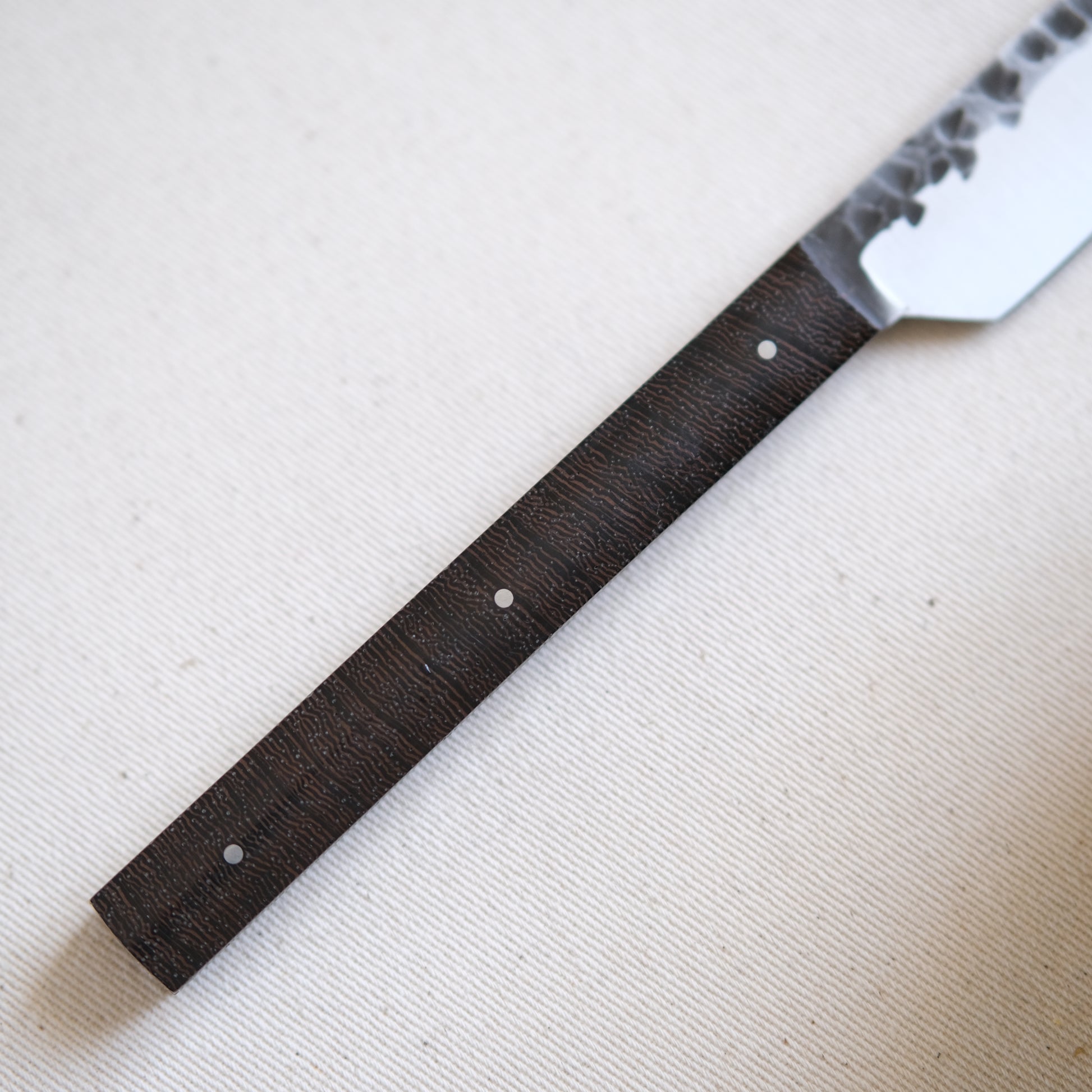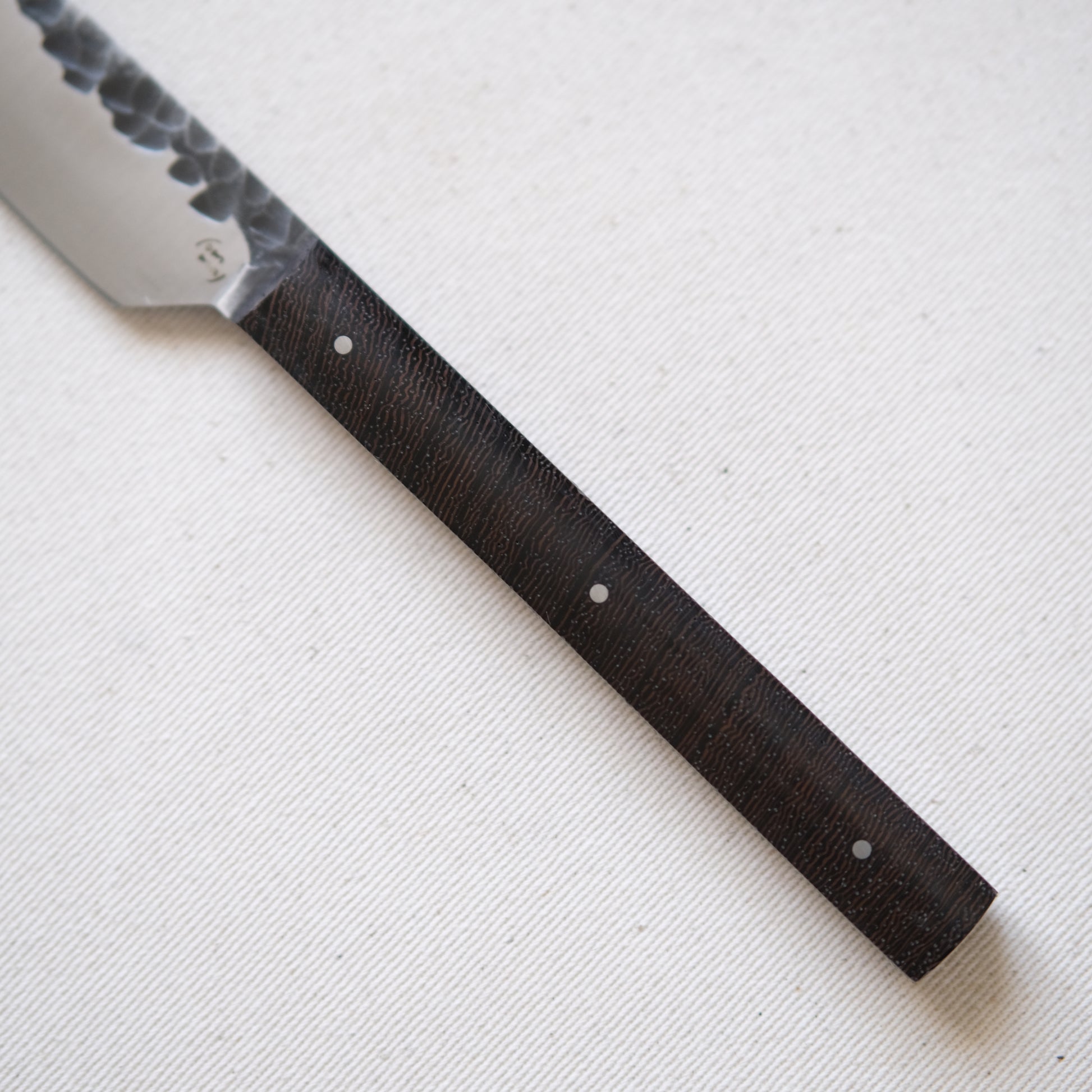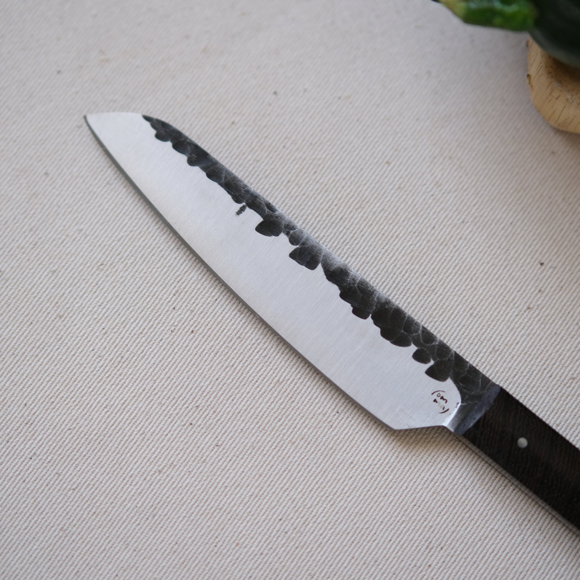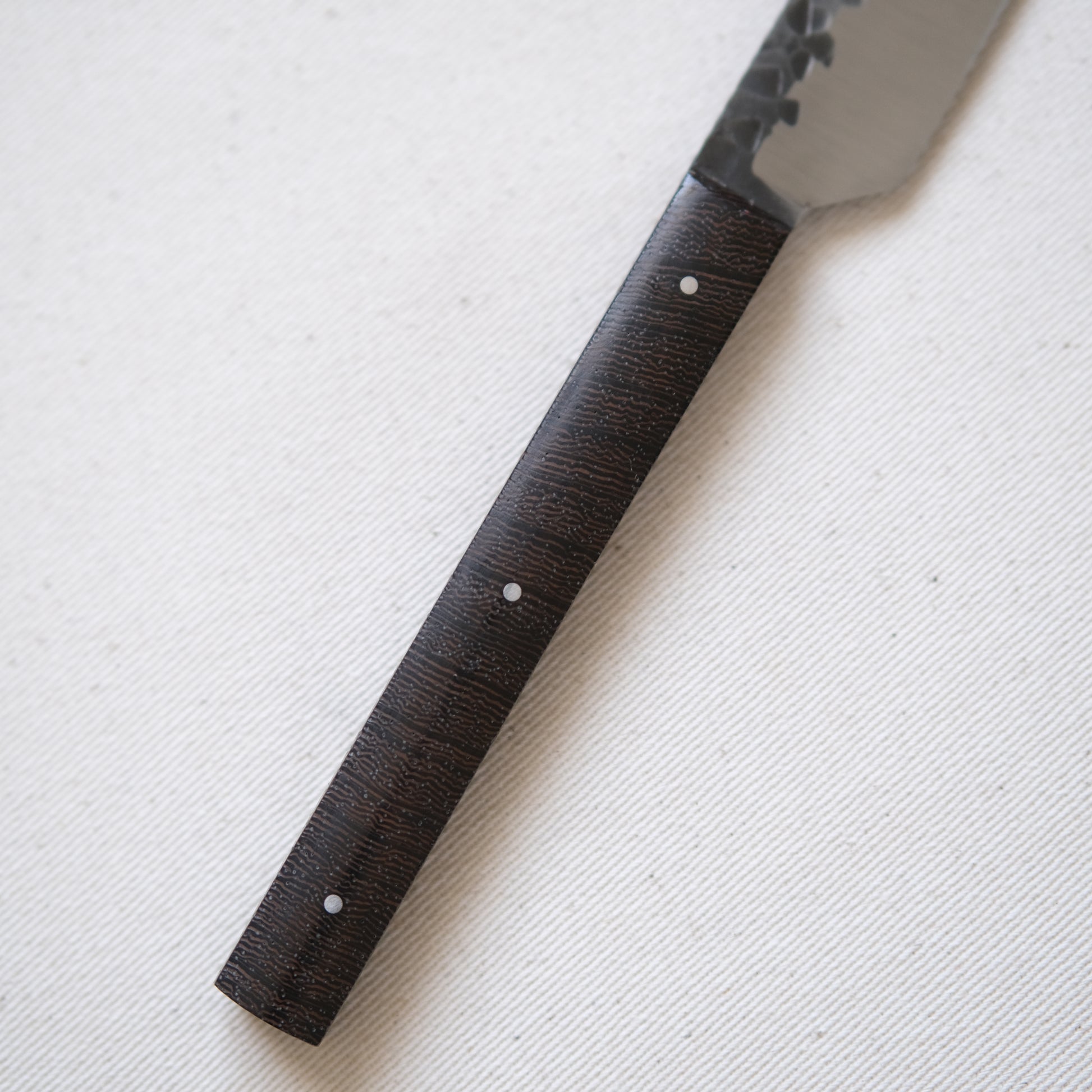 Chaque couteau de cuisine est réalisé entièrement à la main par mes soins dans mon atelier en Touraine (dessin, découpe & mise en forme de la lame, traitements thermiques, découpe et façonnage du manche, polissage, rivetage)