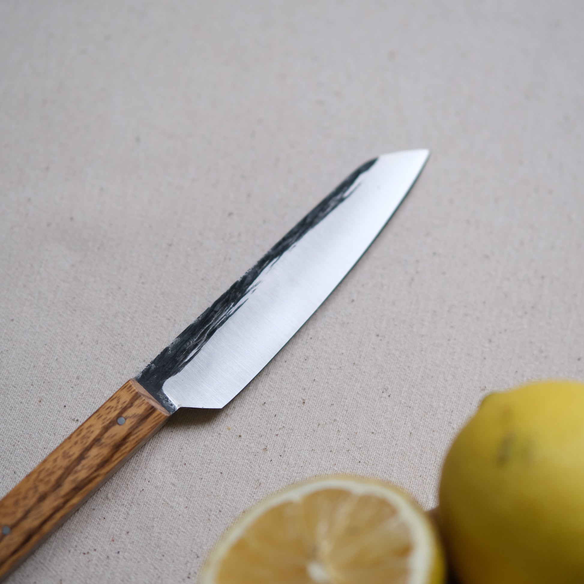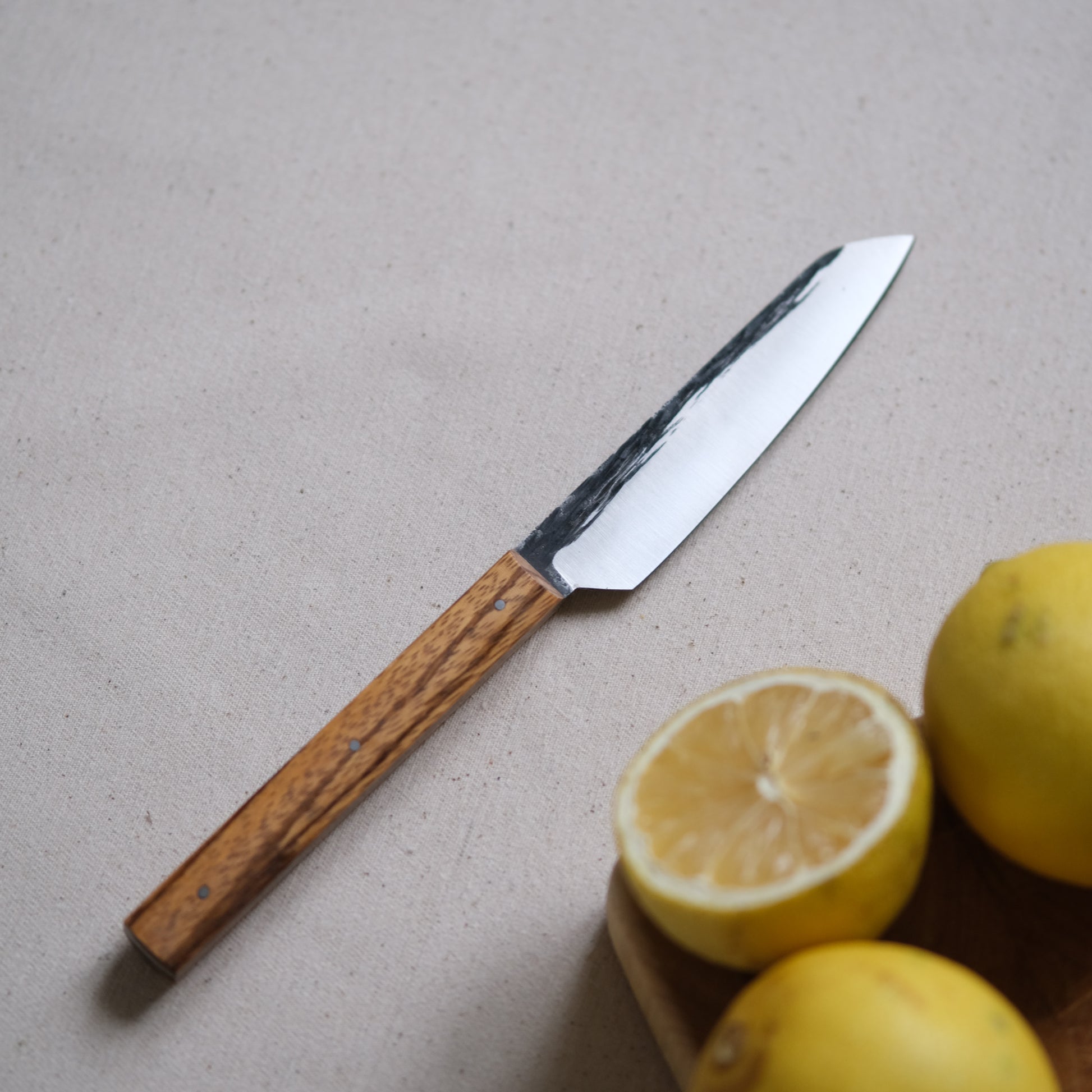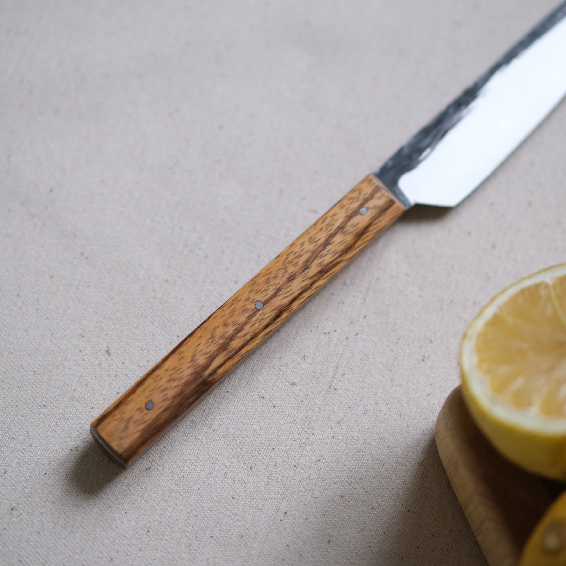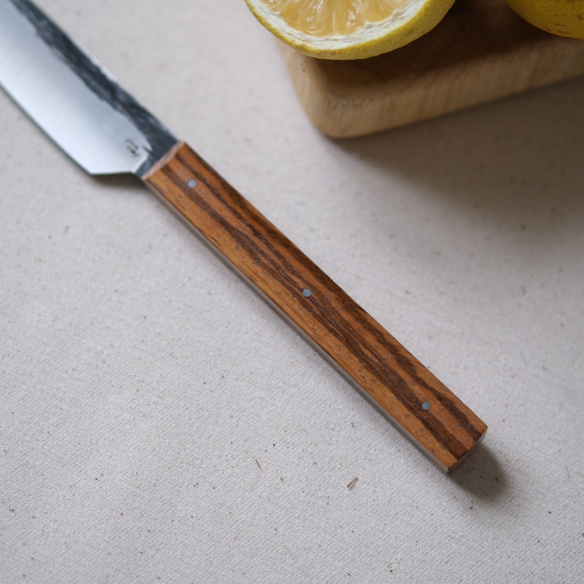 Chaque couteau de cuisine est réalisé entièrement à la main par mes soins dans mon atelier en Touraine (dessin, découpe & mise en forme de la lame, traitements thermiques, découpe et façonnage du manche, polissage, rivetage)