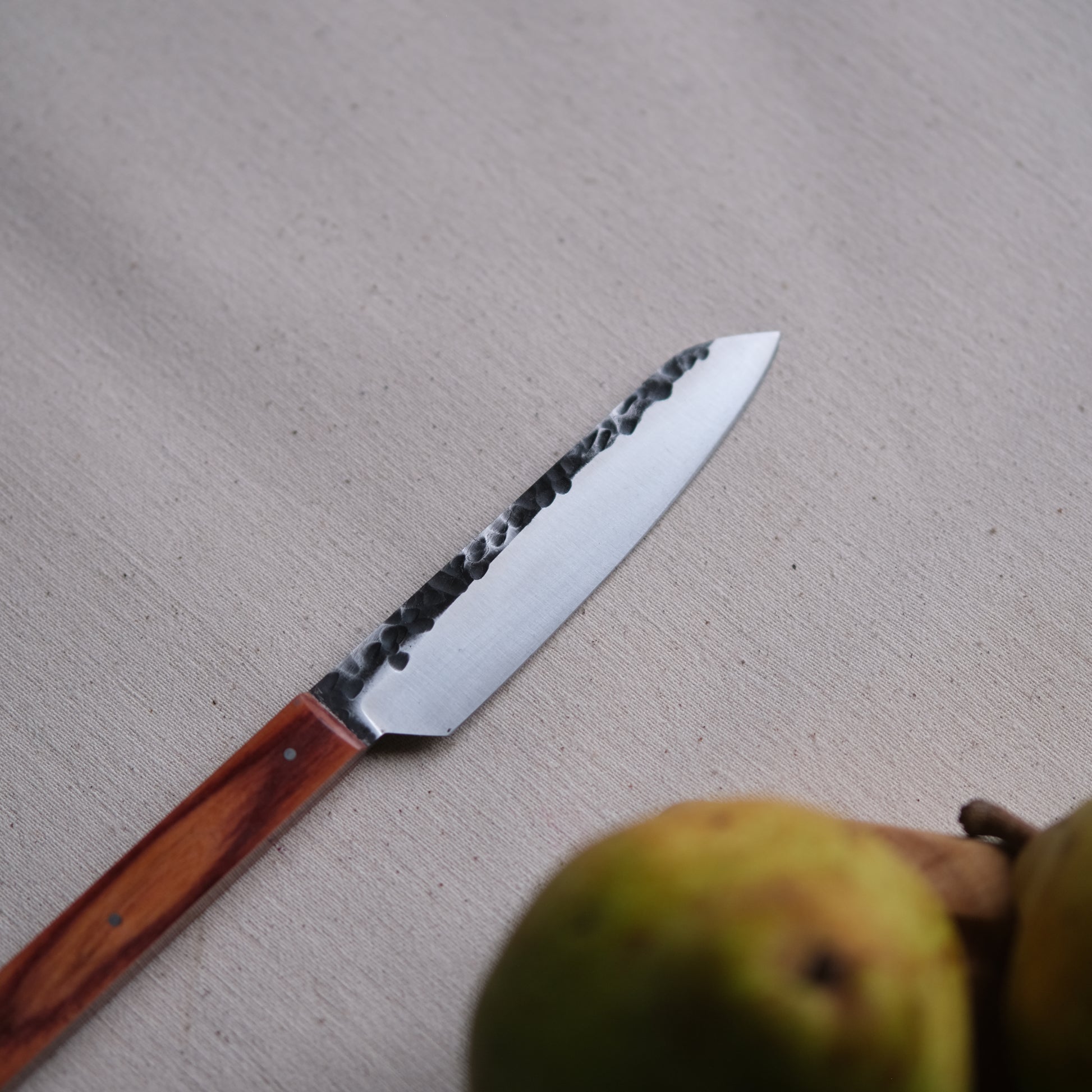 Chaque couteau de cuisine est réalisé entièrement à la main par mes soins dans mon atelier en Touraine (dessin, découpe & mise en forme de la lame, traitements thermiques, découpe et façonnage du manche, polissage, rivetage)